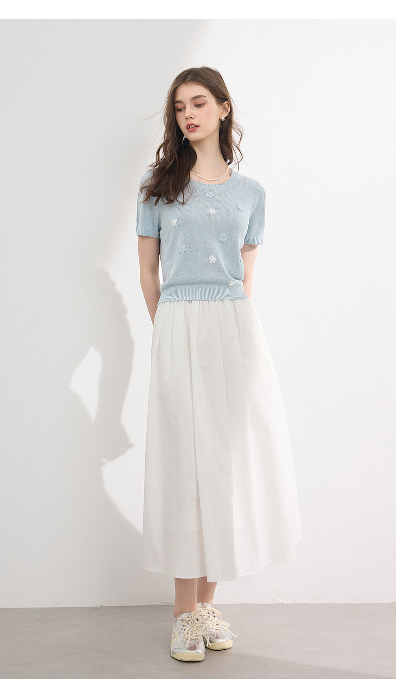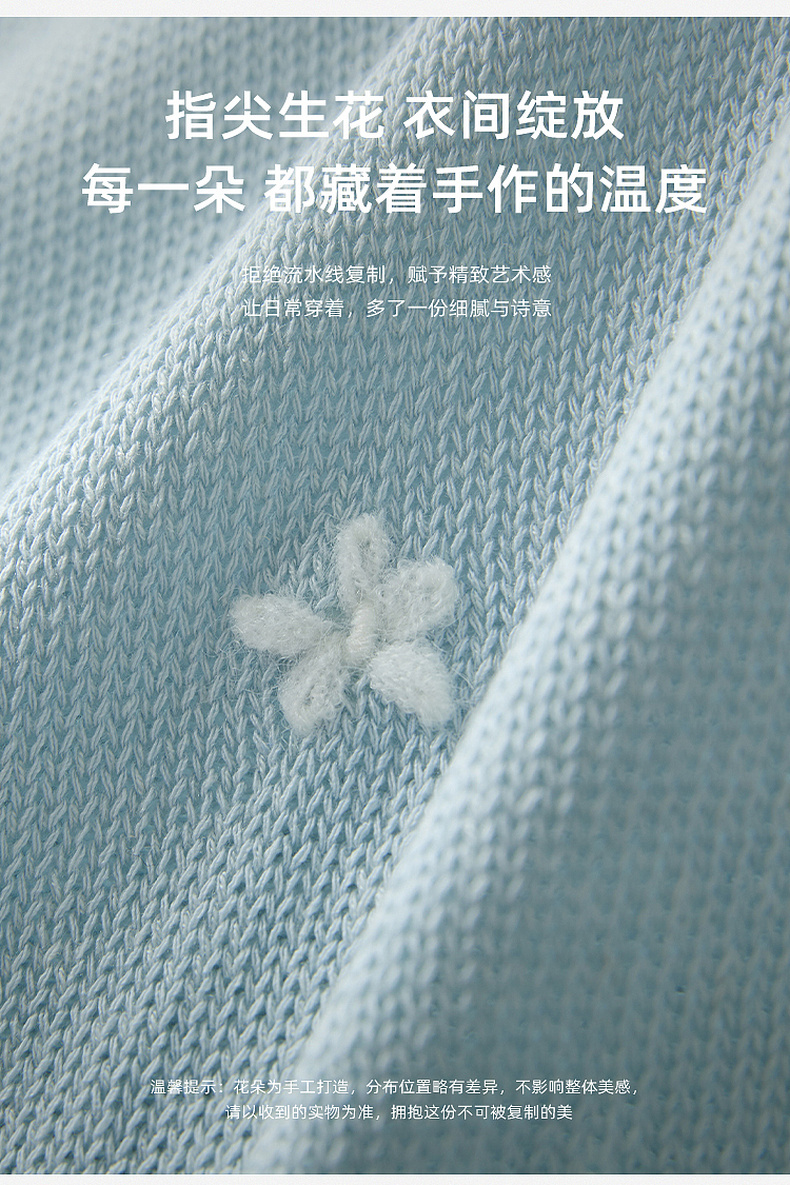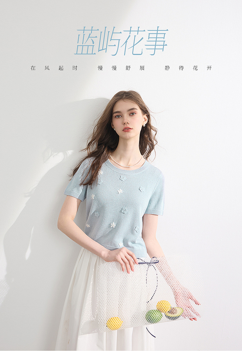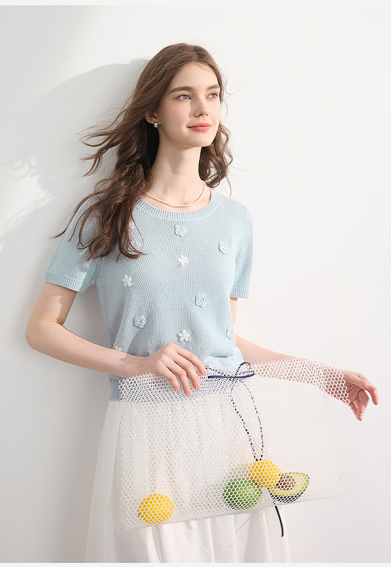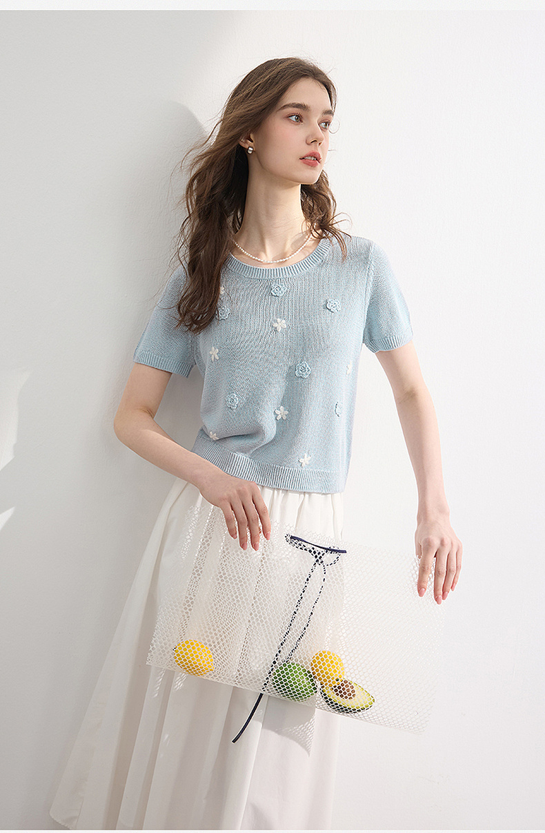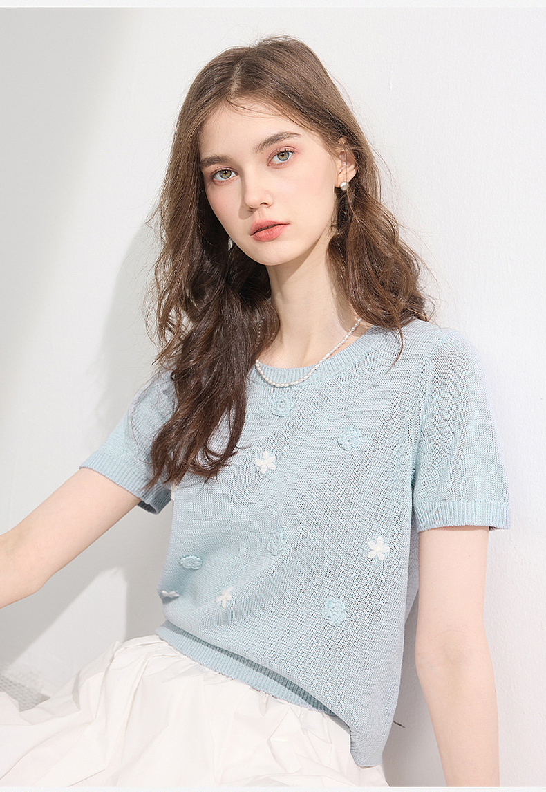 三彩2026夏季新款花朵针织衫圆领短袖正肩毛衫套头衫短款上衣M