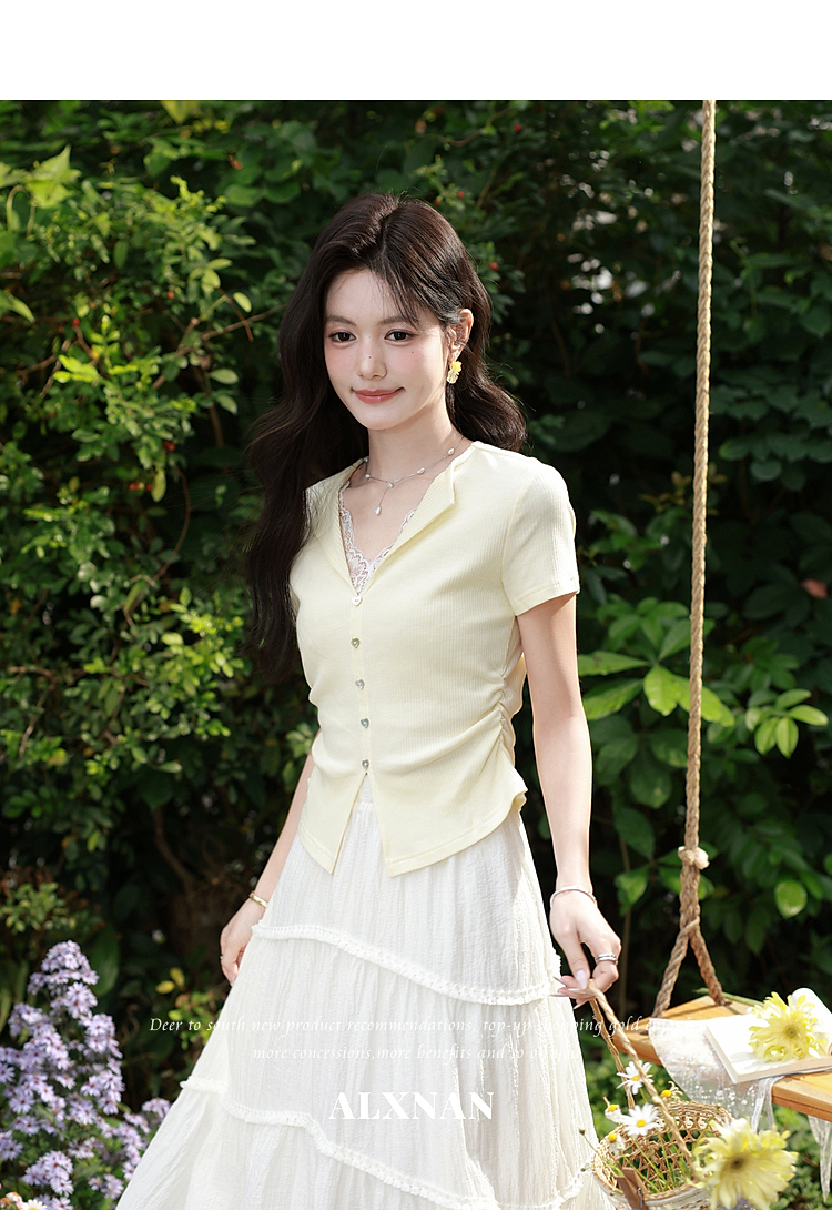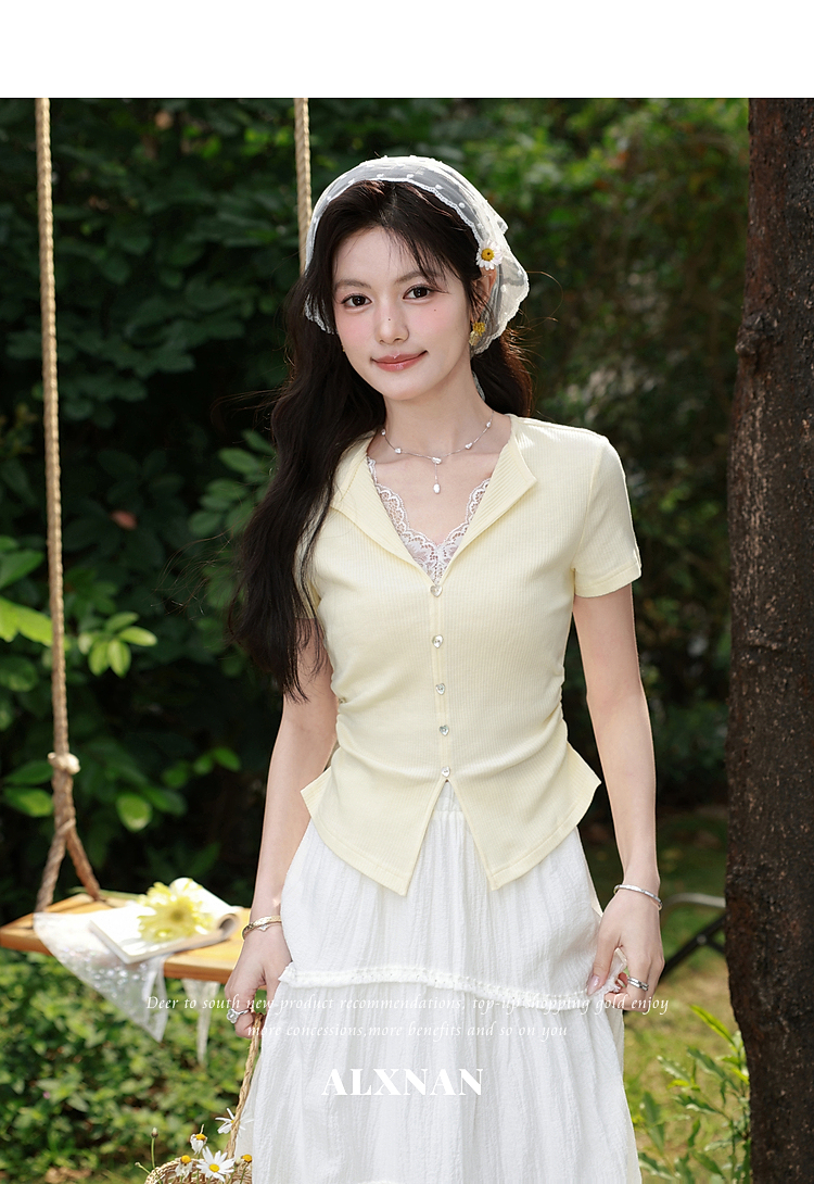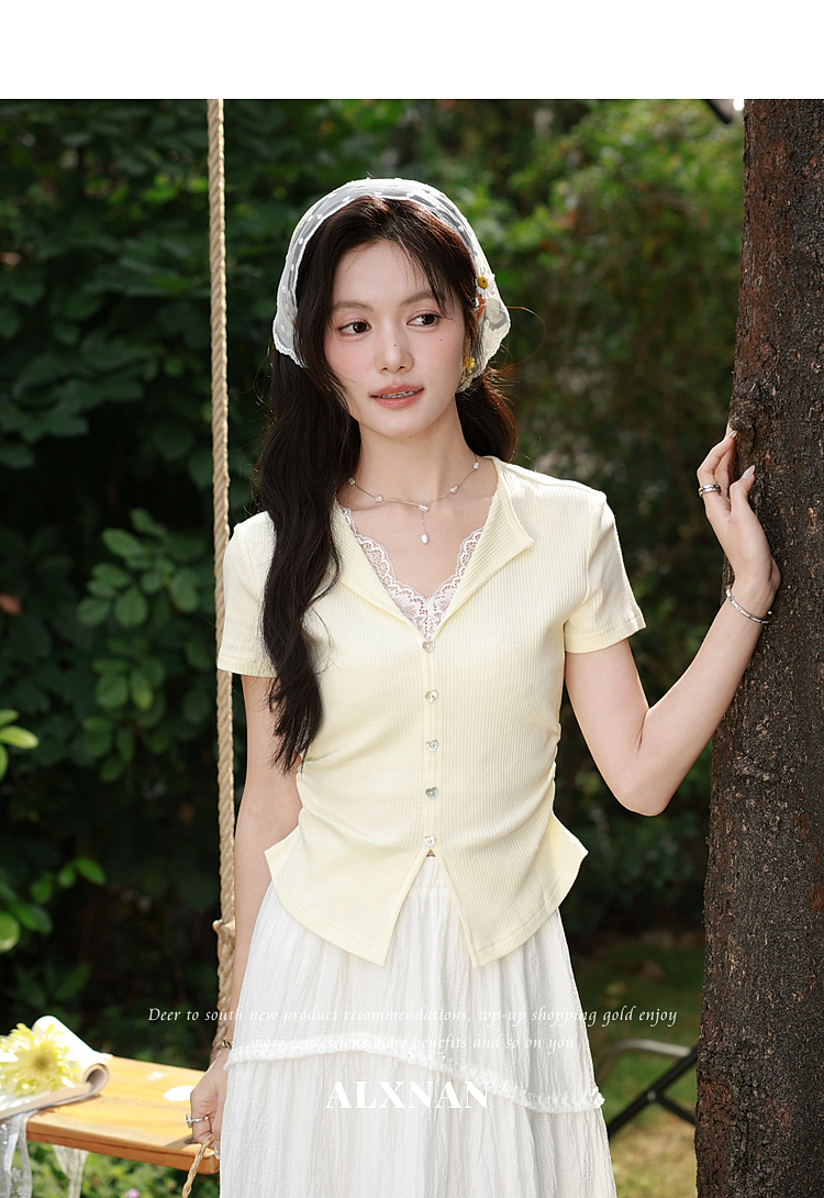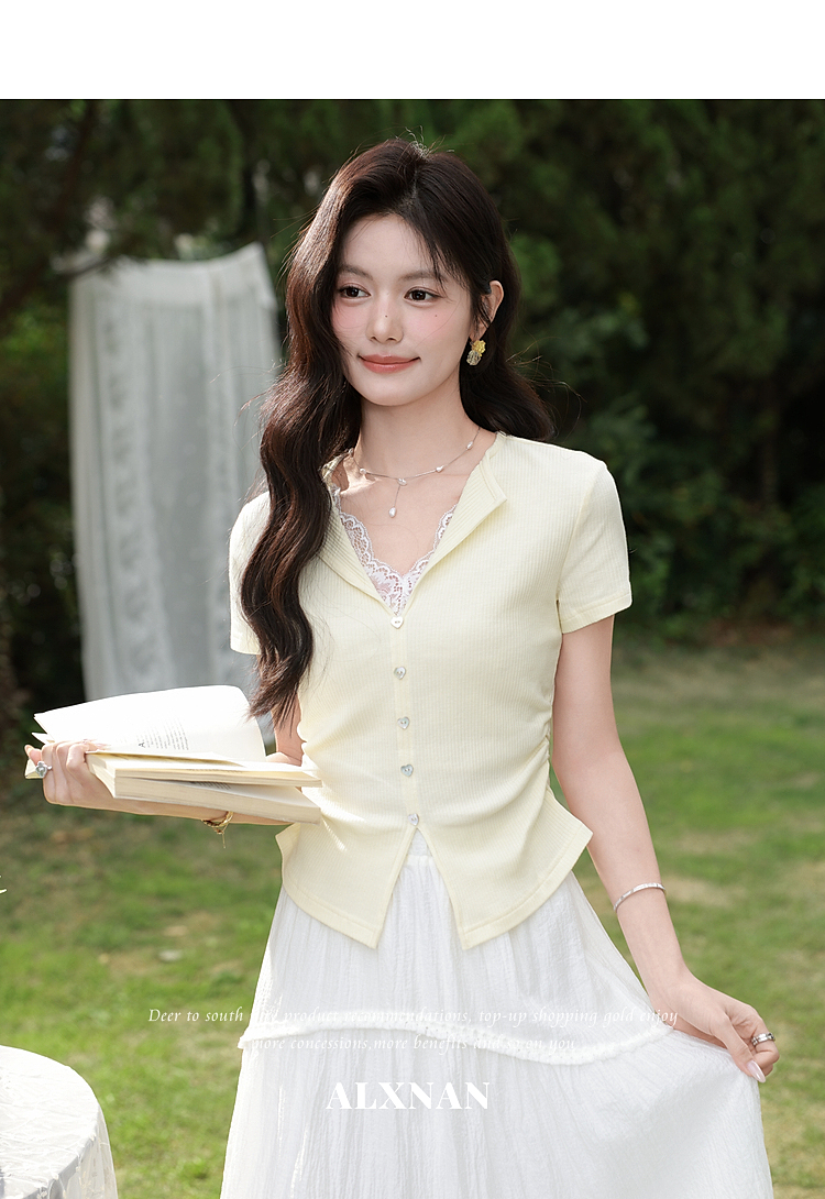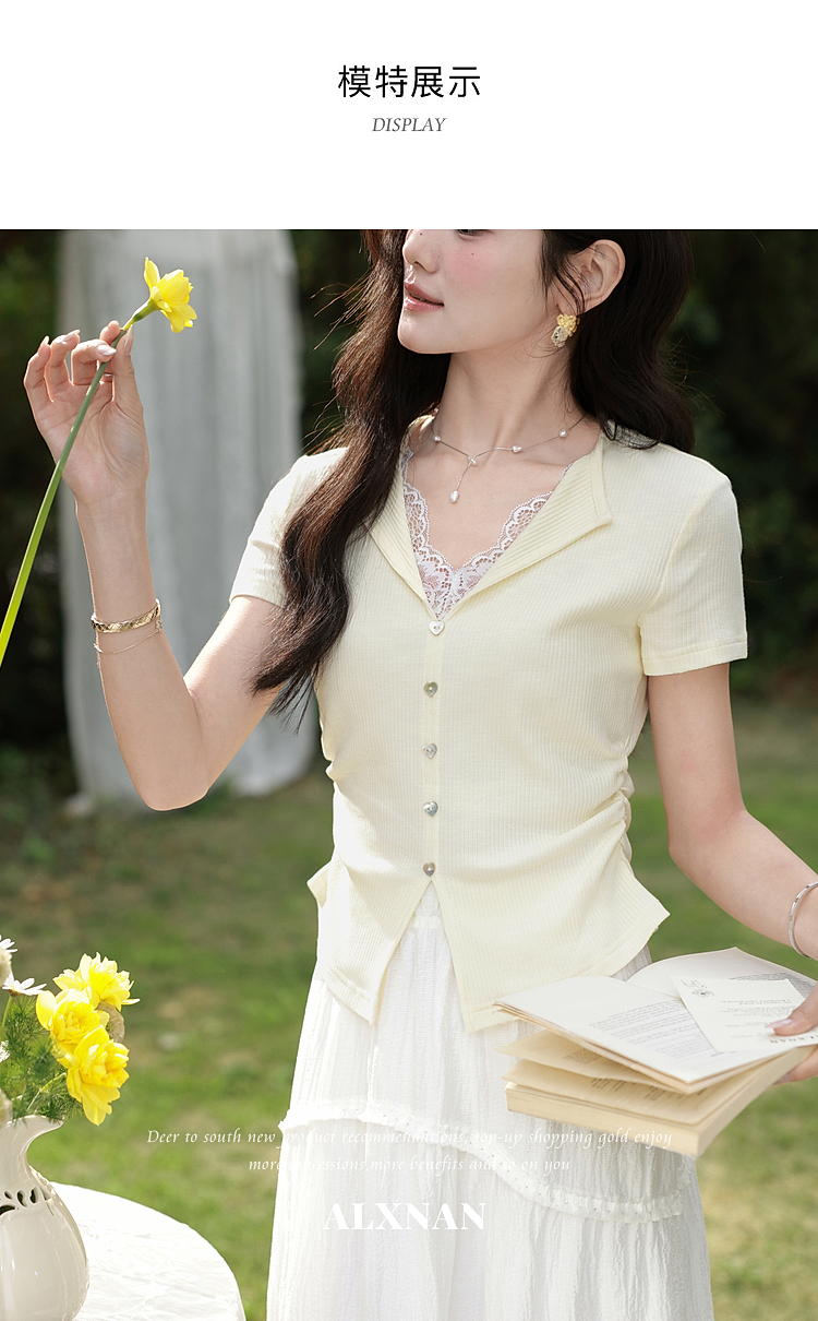 鹿向南「花野漫夏」高级感杏色短袖T恤女夏季新款减龄V领蕾丝上衣