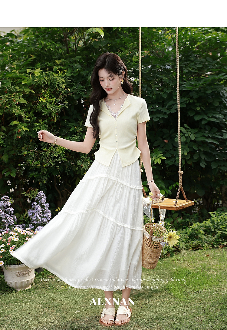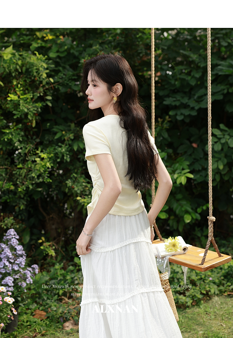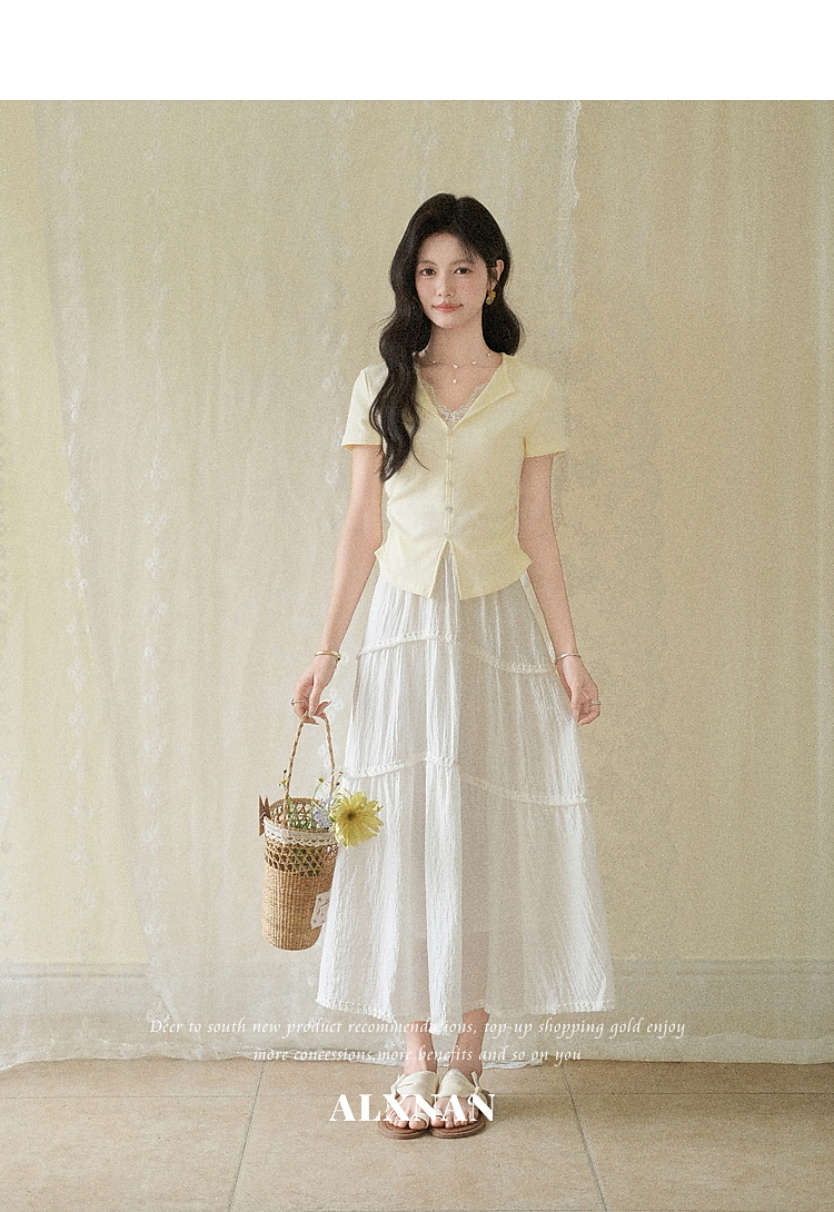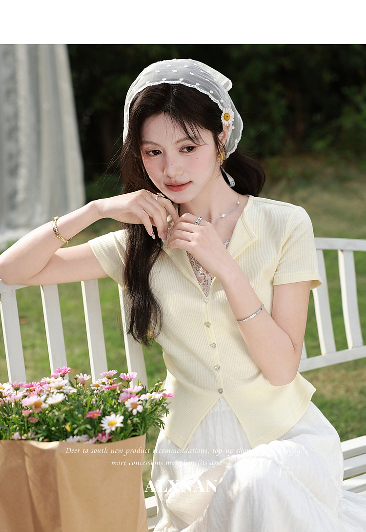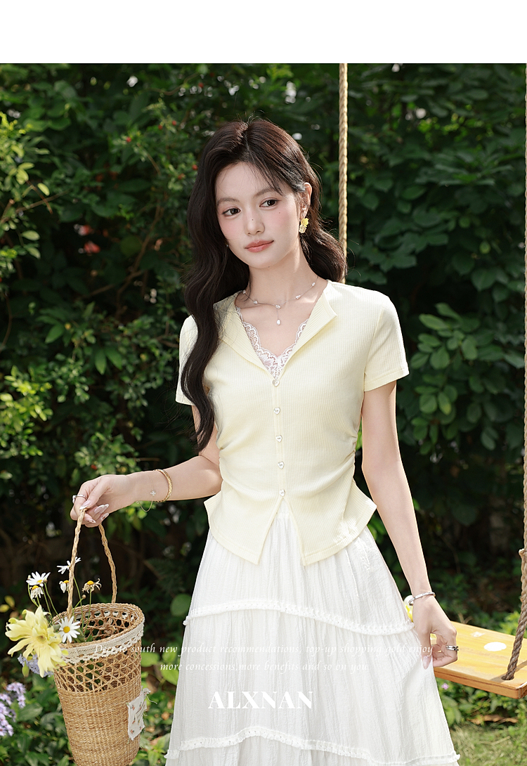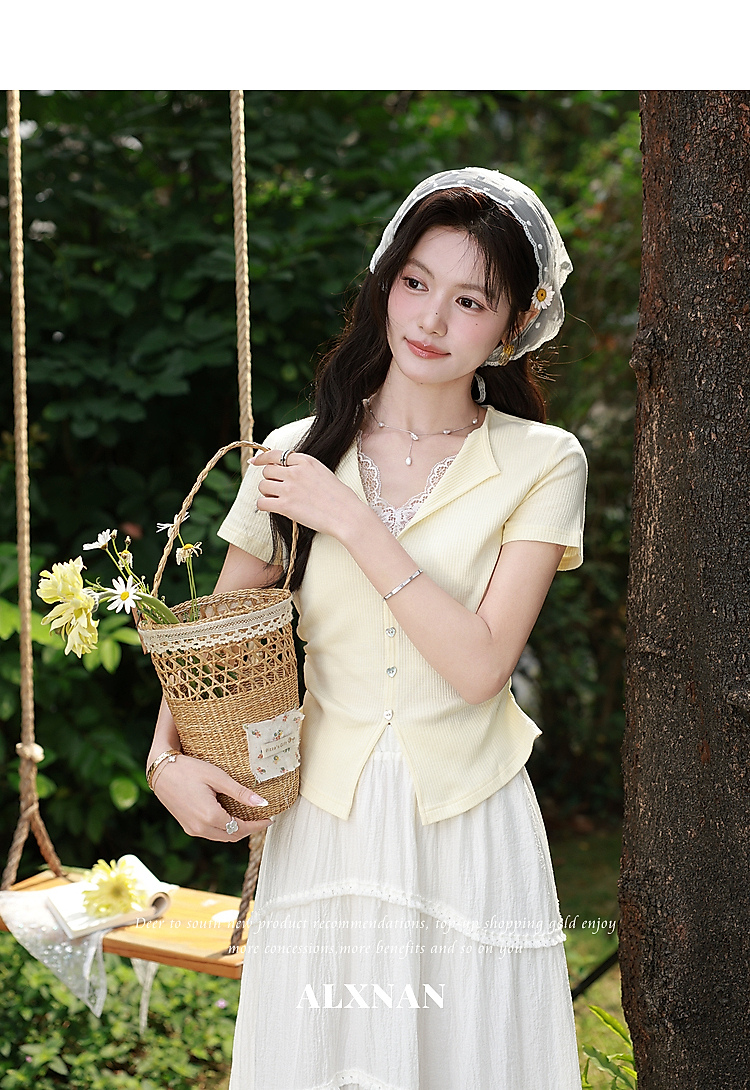 鹿向南「花野漫夏」高级感杏色短袖T恤女夏季新款减龄V领蕾丝上衣