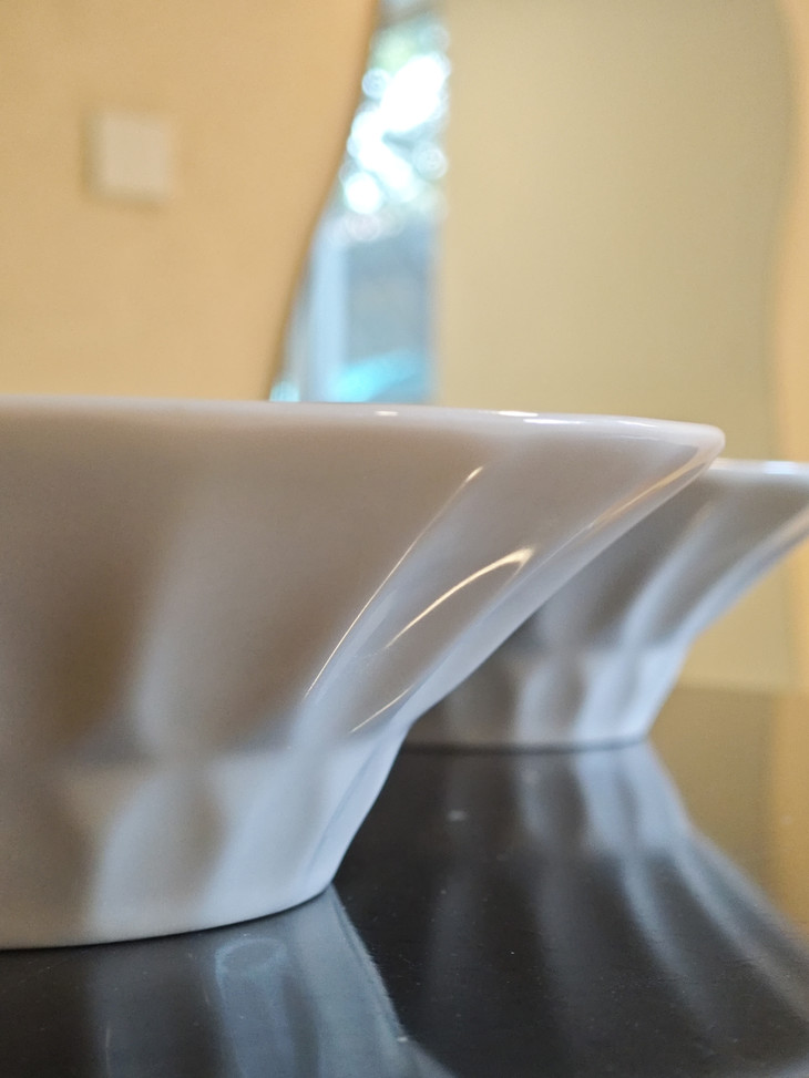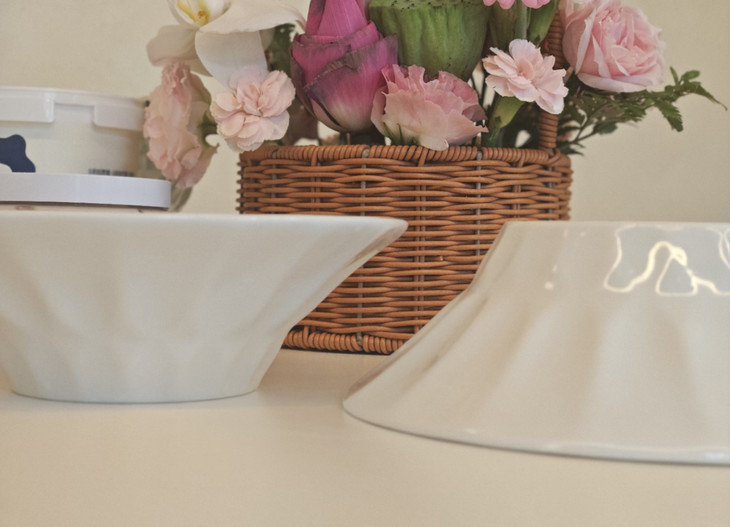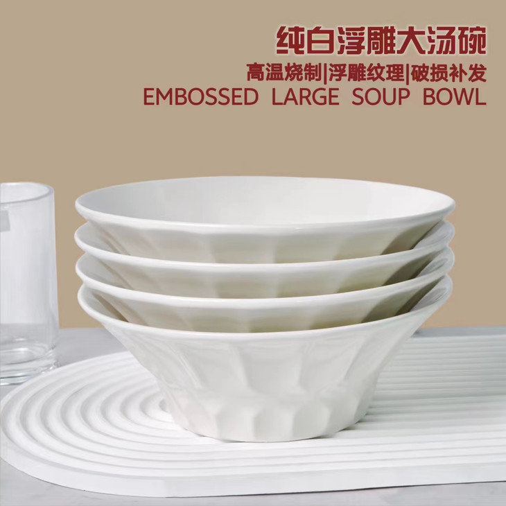 这个大汤碗就是高级奢华❗️❗️❗️ 本来29.9两个,结果工厂一看就剩下这1000组 就说29.9五个清吧 白色餐具真是永远的神 英国订单,英国老牌百货订单 整批走了,这是多做的1000组 浮雕的质感很好,就是清晰且平滑 用的是高温陶瓷 🔺能进微波炉|洗碗机|蒸笼 随便你嗦粉、沙拉、拌菜、吃面 29.9活活五个❗️❗️❗️❗️❗️