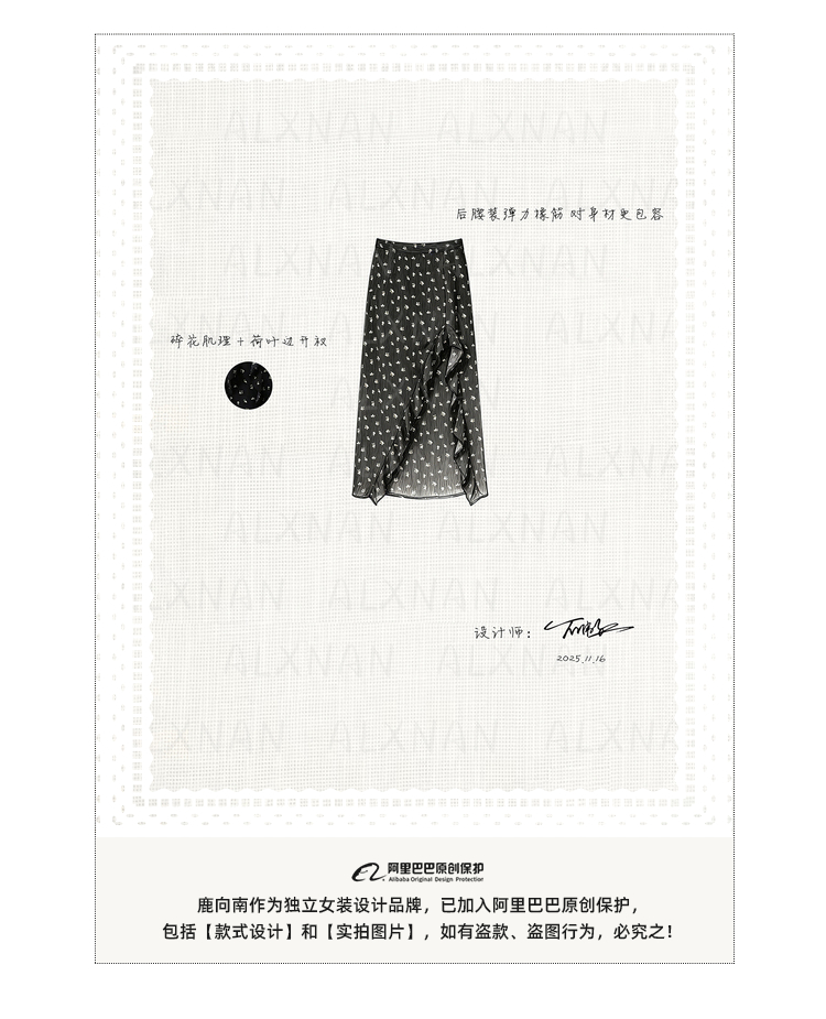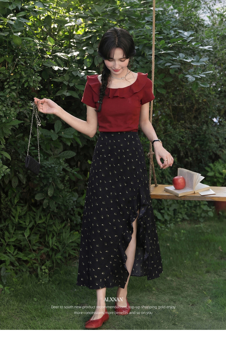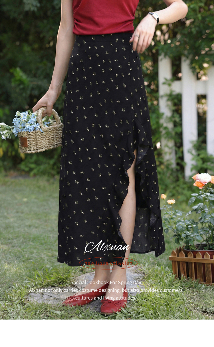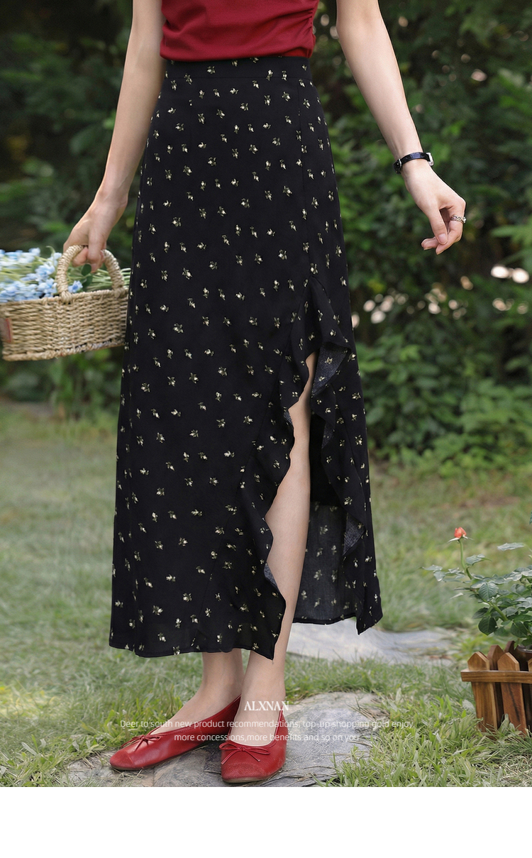 鹿向南「夜色蔷薇」黑色碎花半身裙女春气质开叉高腰显瘦A字长裙