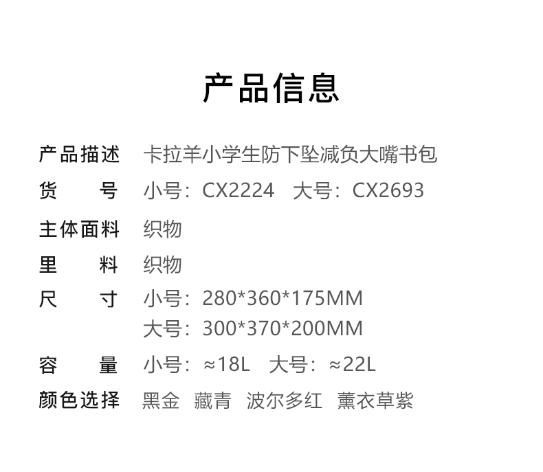 这么好看又高性价比的卡拉羊书包,今天除了有大小两号,而且还有四个颜色可选。