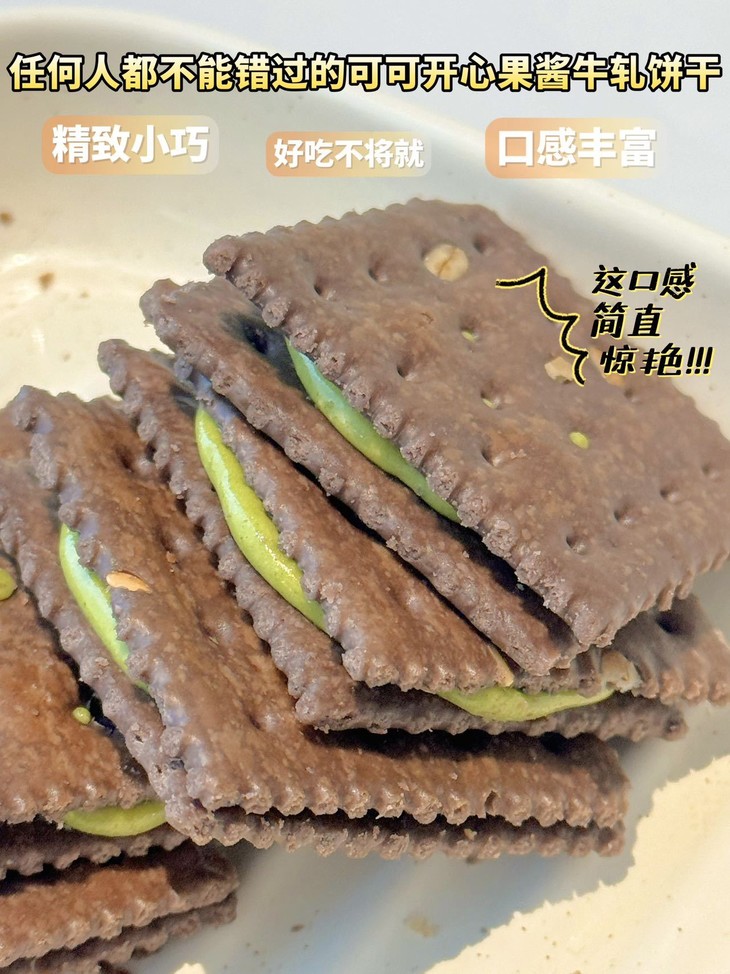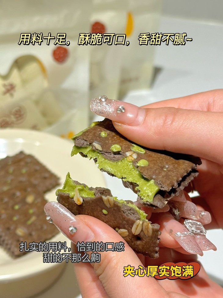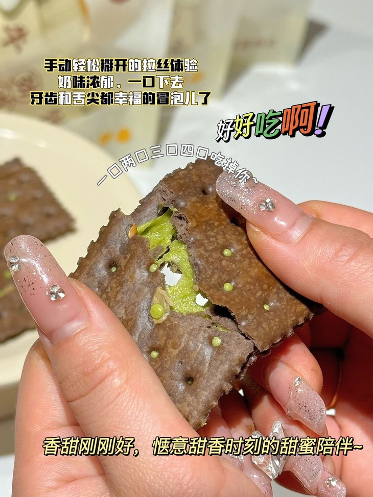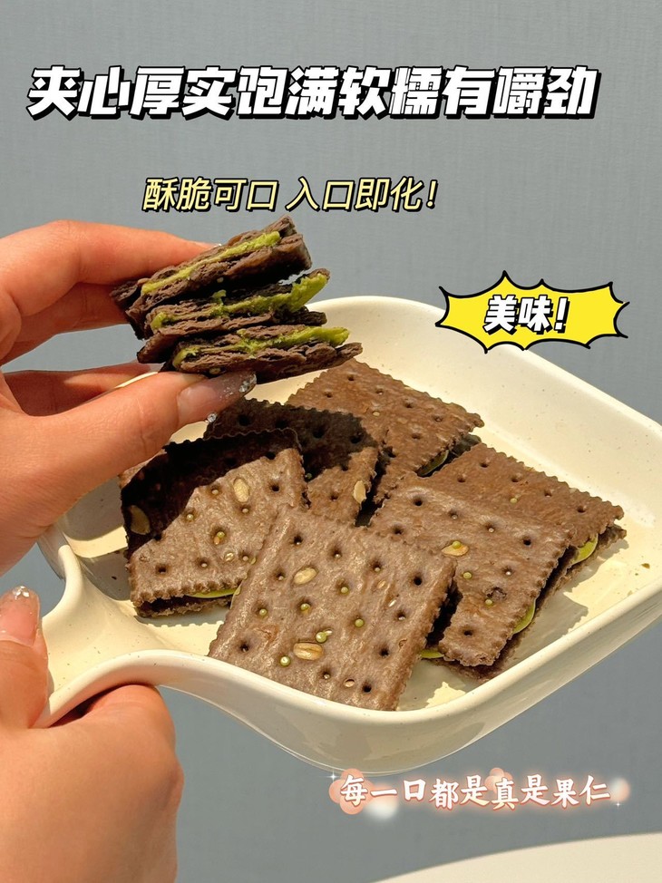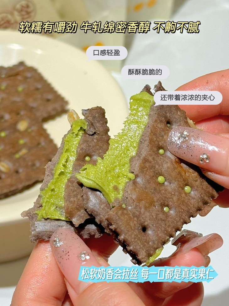 真是给姐妹们挖到宝了 开心果酱牛轧好香好好吃 像手工现做的棉花糖一样 柔软又有点韧性☁️ 一口咬下,麦香、奶香、甜香在嘴里散开~ 这饼干真的吃多少都不会腻呀!很上头🥰 开心果酱牛轧糖的软糯➕可可饼干的酥脆交织 奶香搭配麦香都快溢出来了 口感丰富 有层次感 甜度刚刚好 吃一次就被狠狠拿捏好吧🤤
