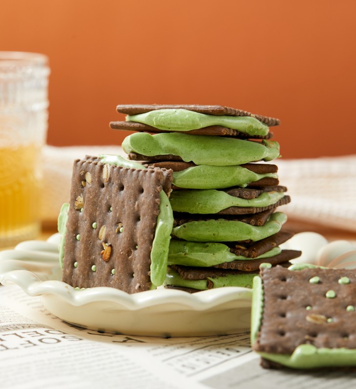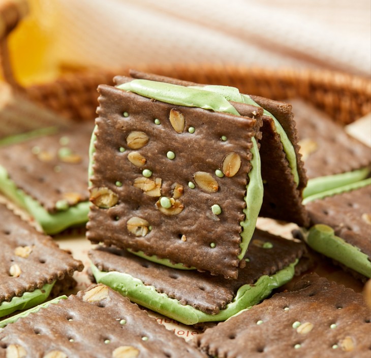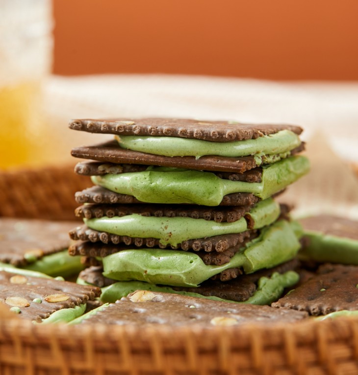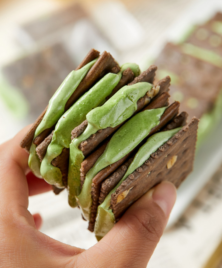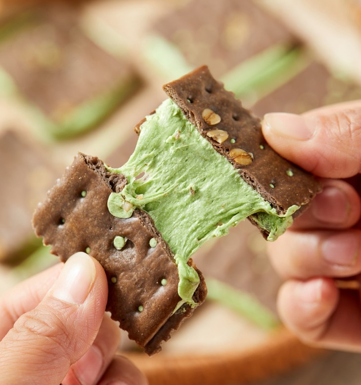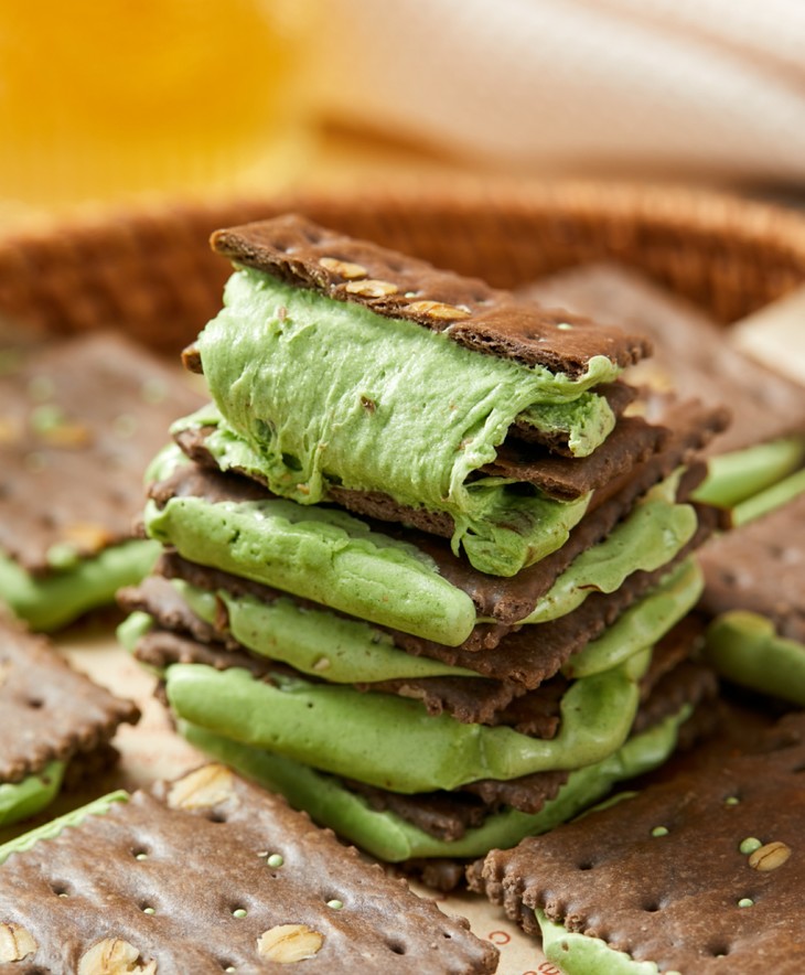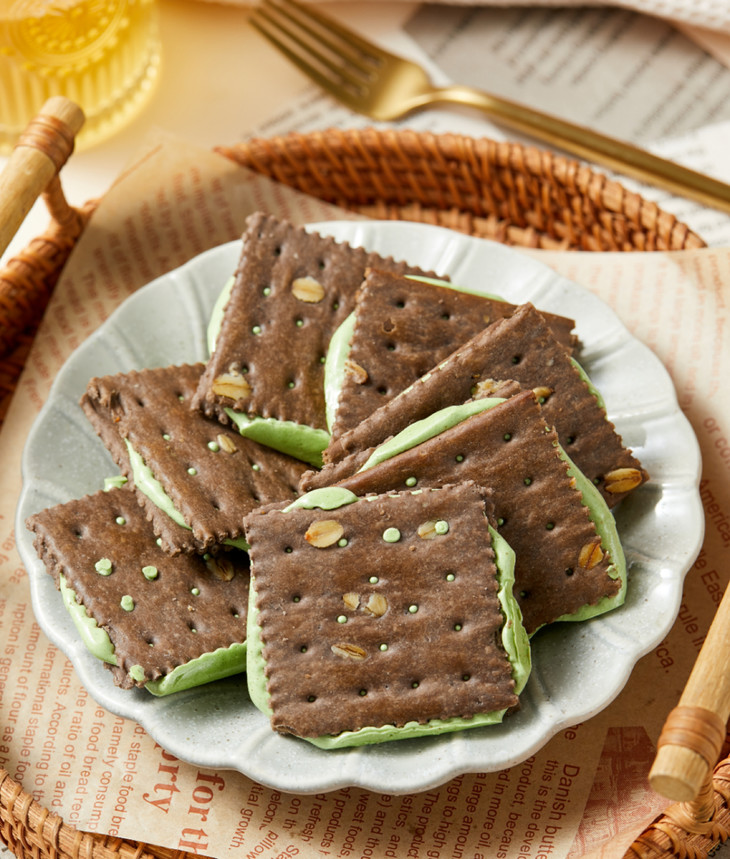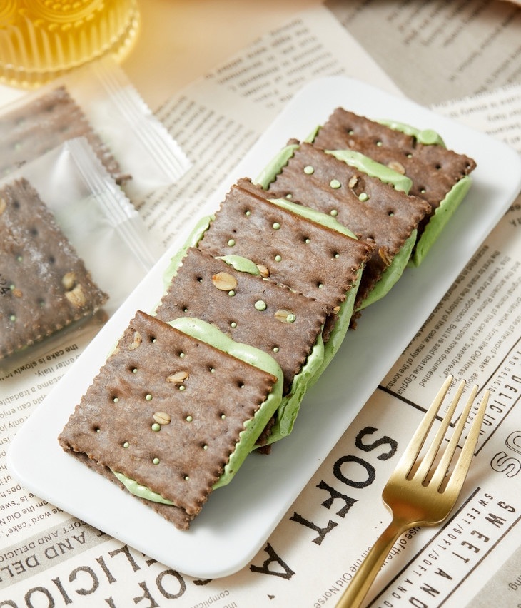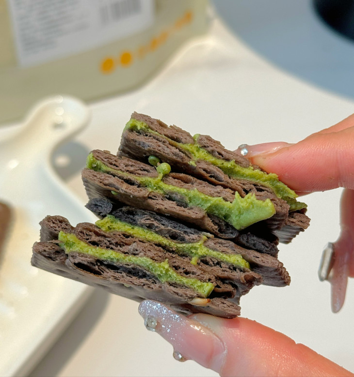 细细咀嚼 还能吃到实实在在的开心果碎🥜 每一口都超有料 这种搭配真的很少见 酥脆松香的可可饼干 夹着奶香浓郁开心果酱牛轧糖 🍪可可味饼干体贼香!!!牛轧还能拉丝儿~ 一口咬下去外酥里糯 好吃到掉牙❗ 而且一点也不会齁甜 吃着也不腻!🤗