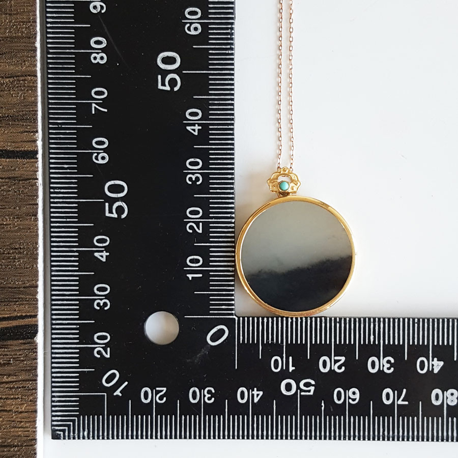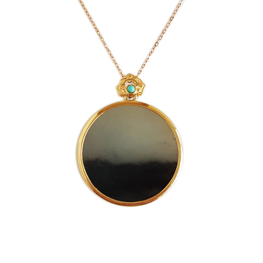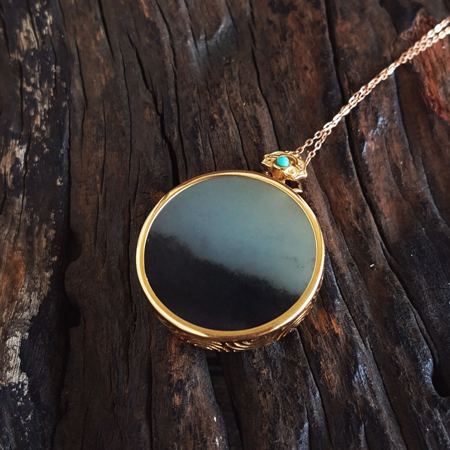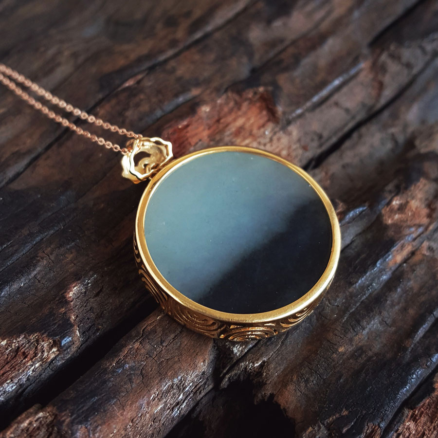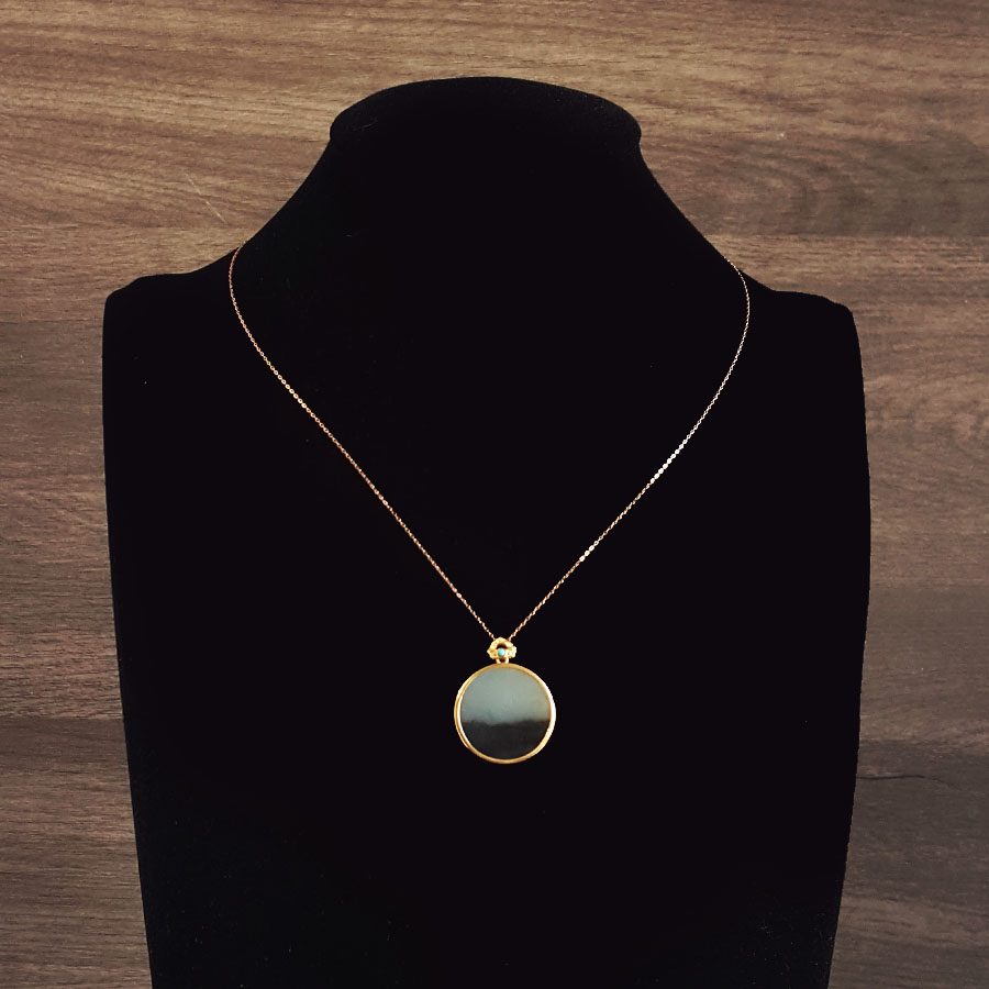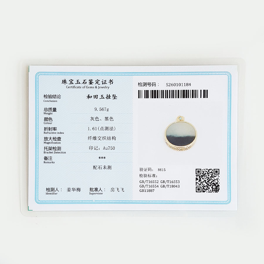 名称 | AU750黄金镶天然细腻新疆料青花圆形平安无事牌和田玉吊坠项链 |