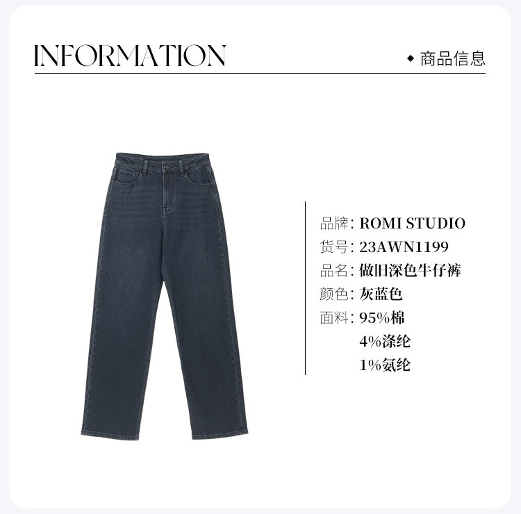ROMI STUDIO“随性丹宁”高比例棉水洗做旧弹力深蓝牛仔裤23AWN1199
