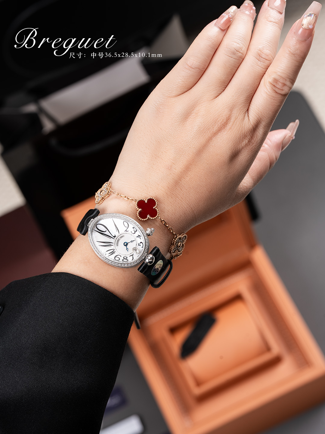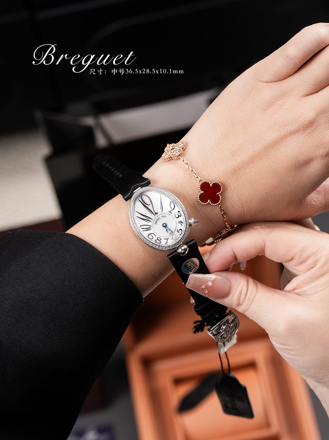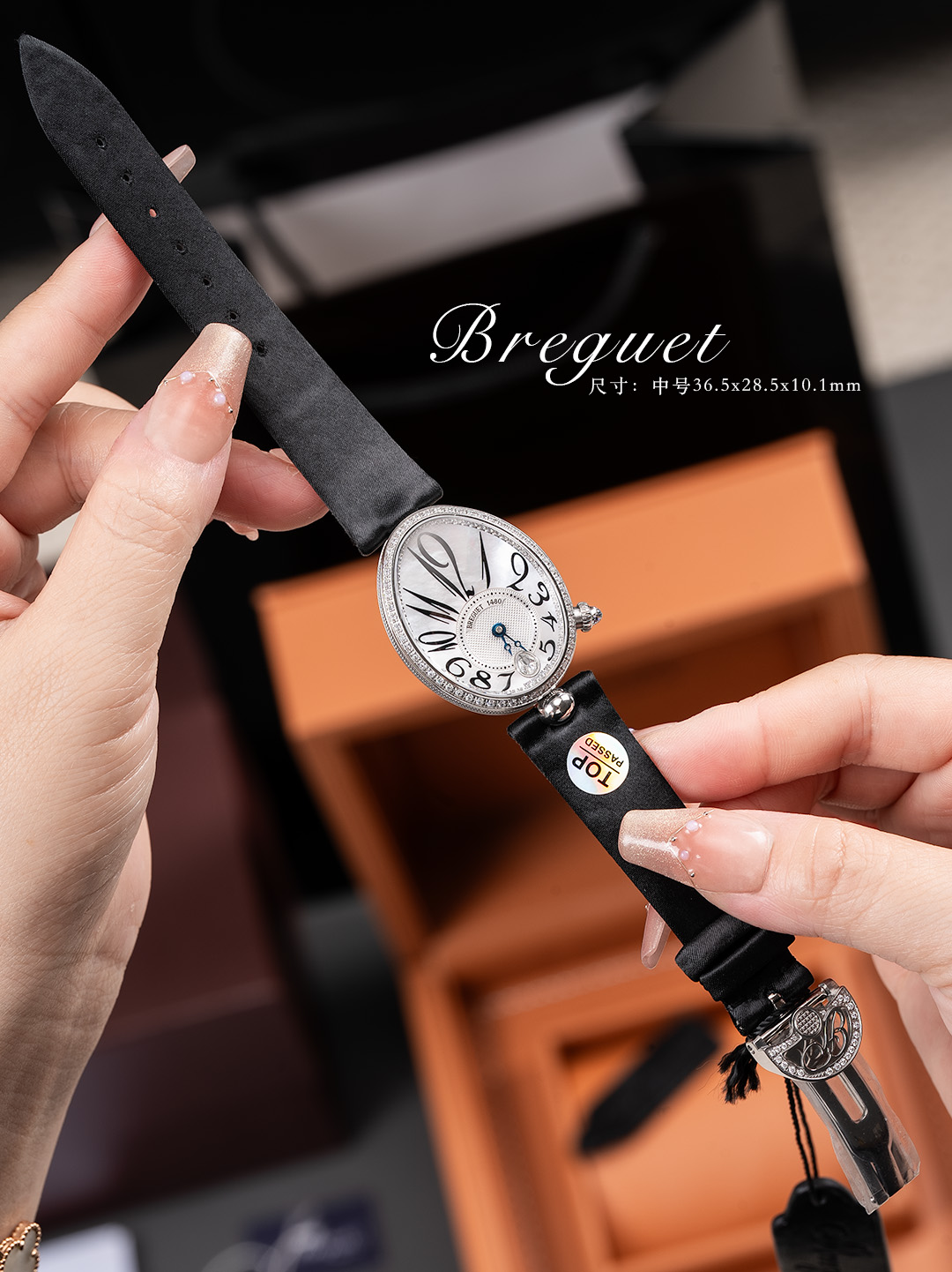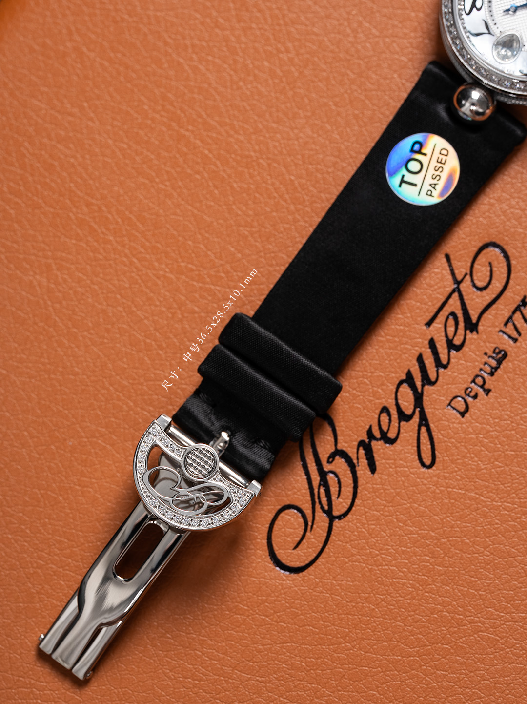 【表带】绢丝(小羊皮包裹丝绸)表带如肌肤般温柔,宝玑式折叠表扣秀雅精巧。