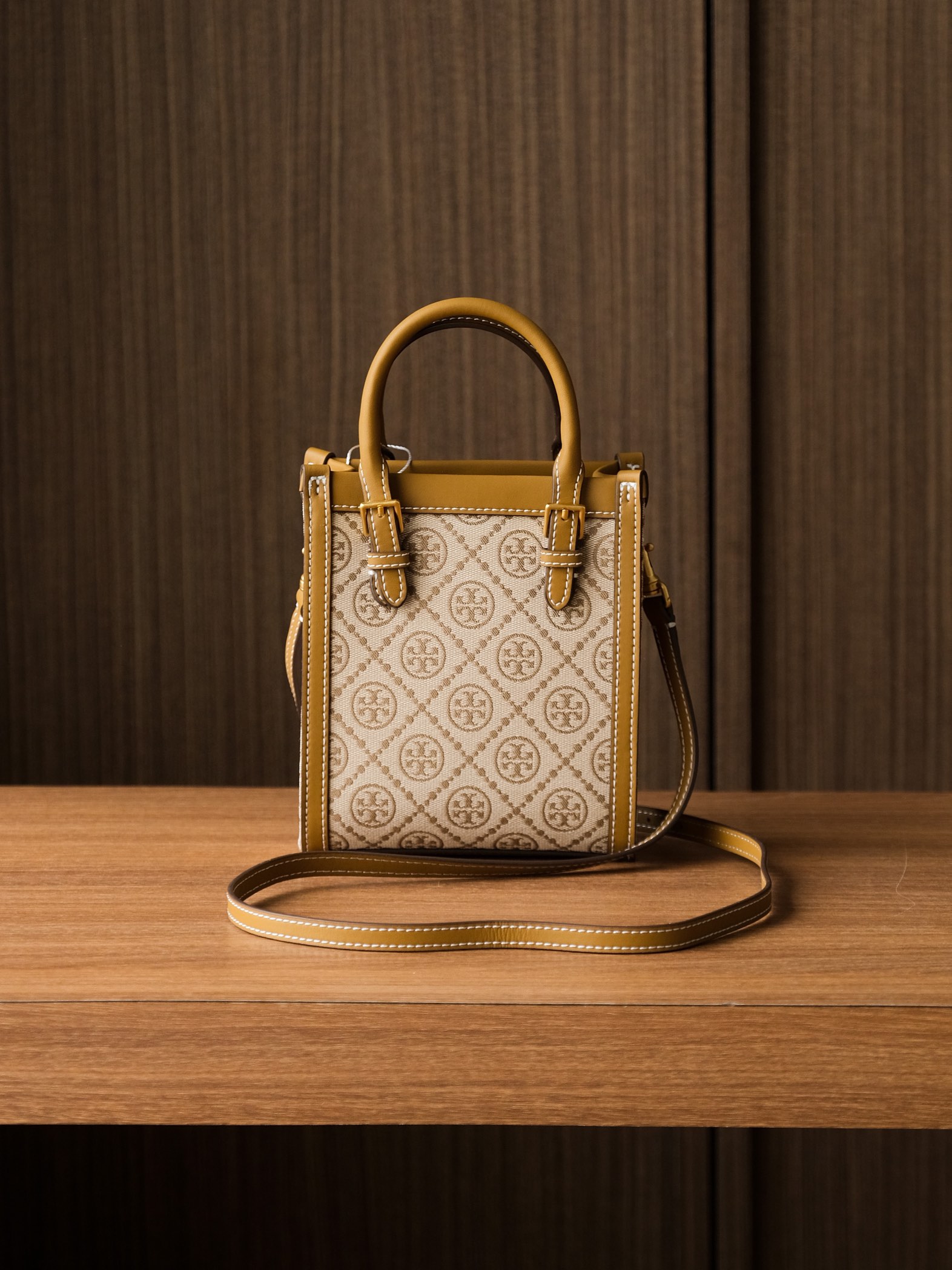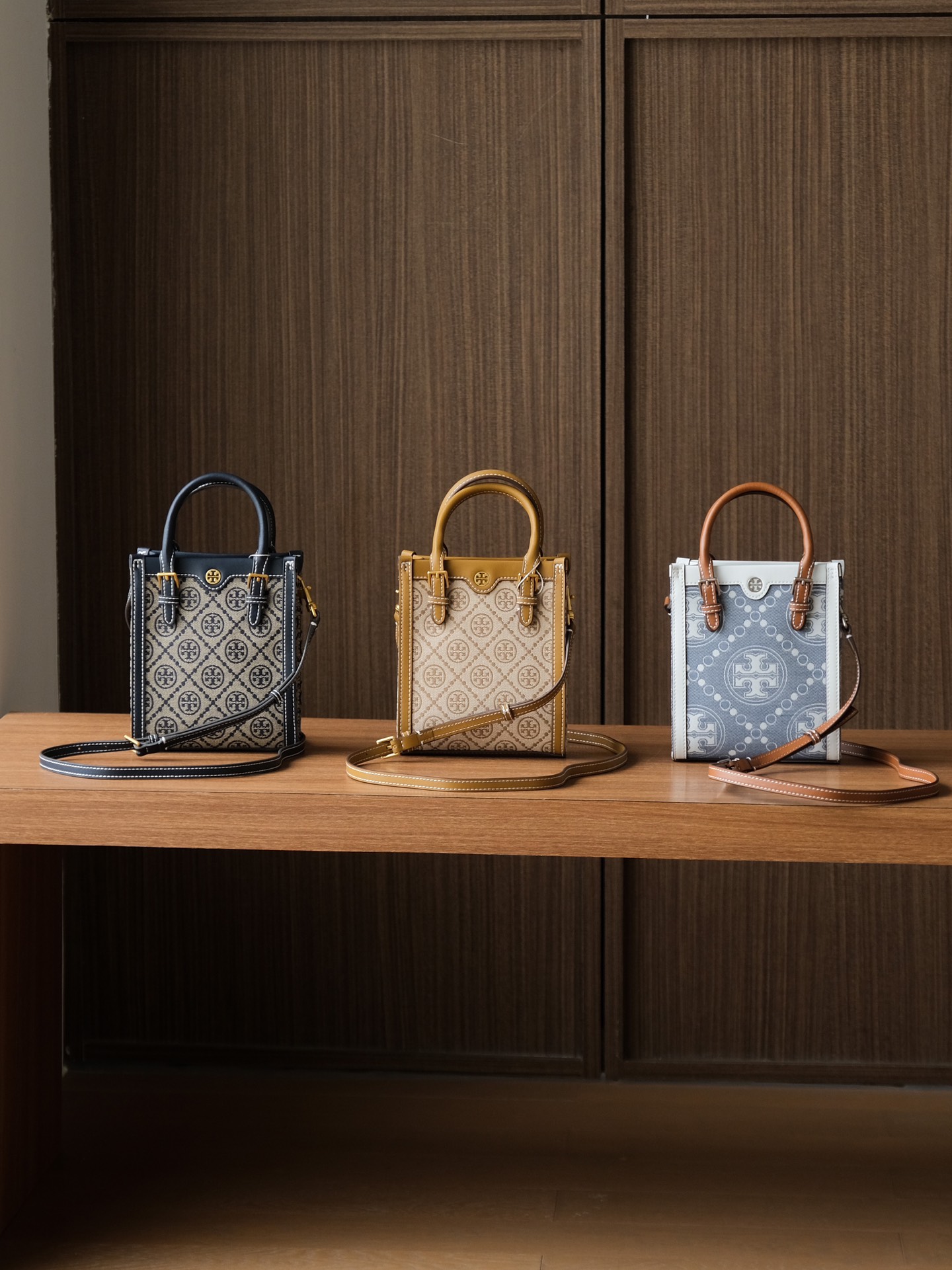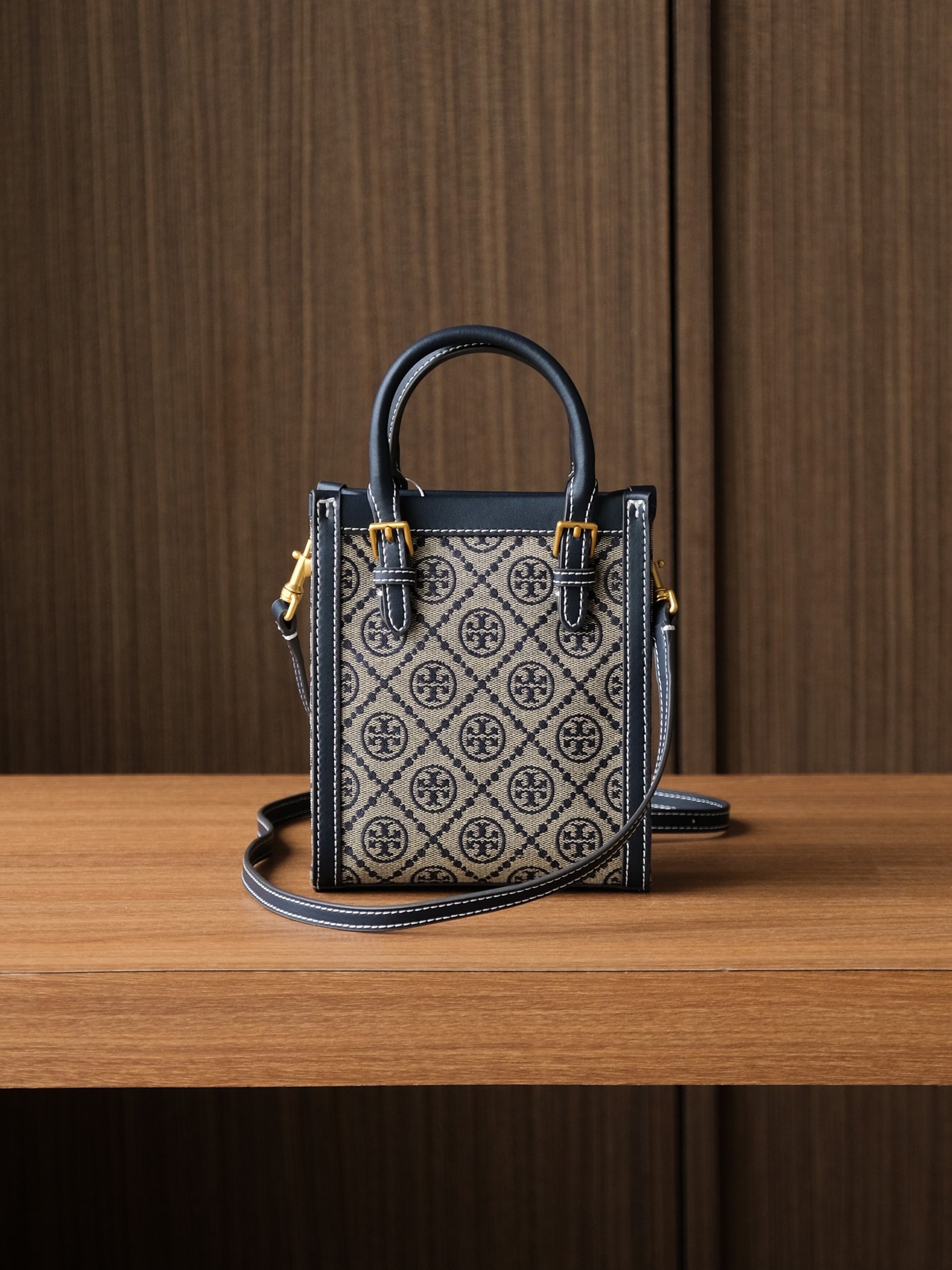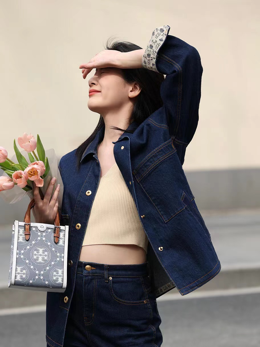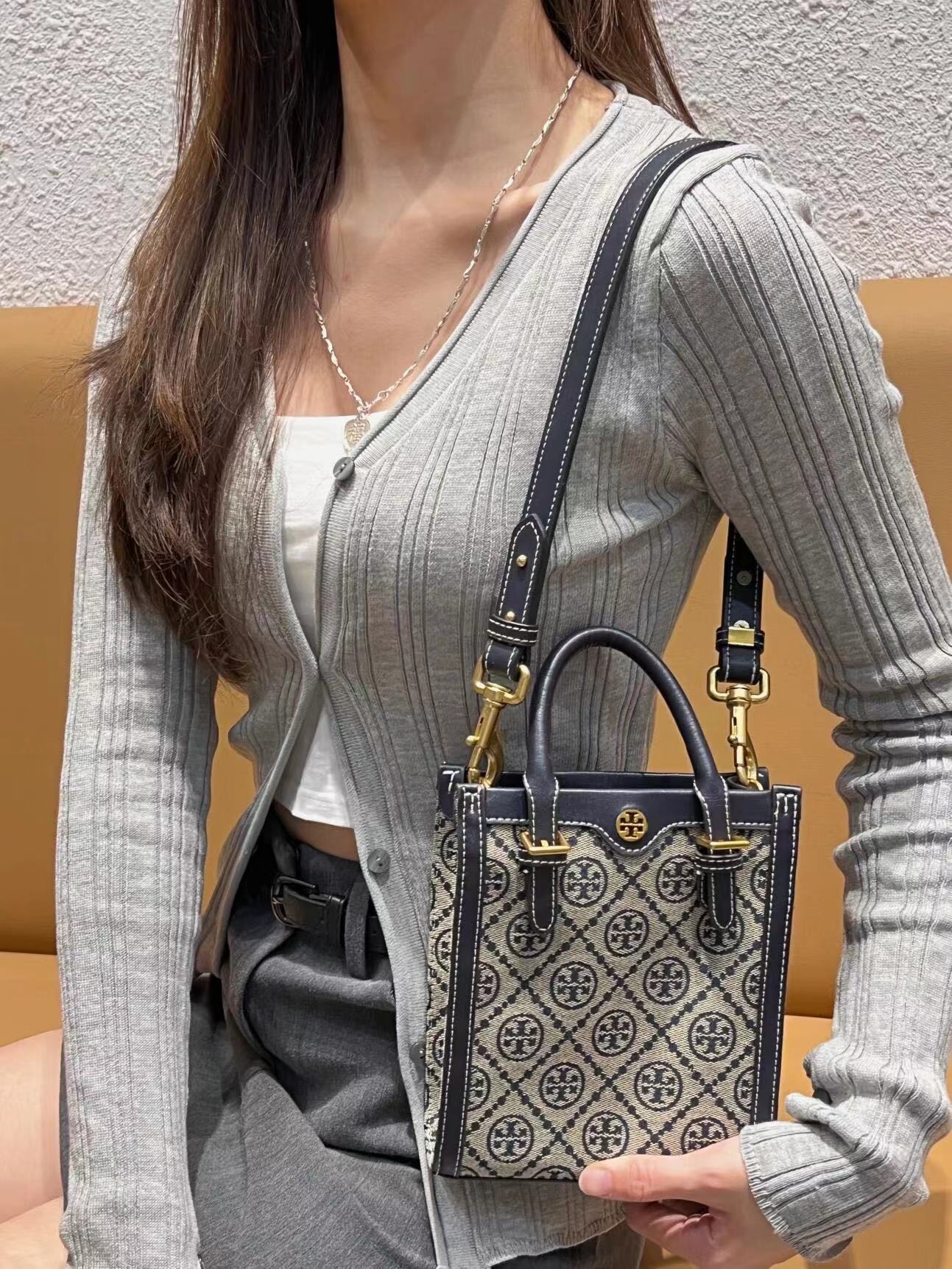 纯原 TORY BURCH T MONOGRAM JACQUARD MINI N/S TOTE秋冬新款竖版复古风托特包