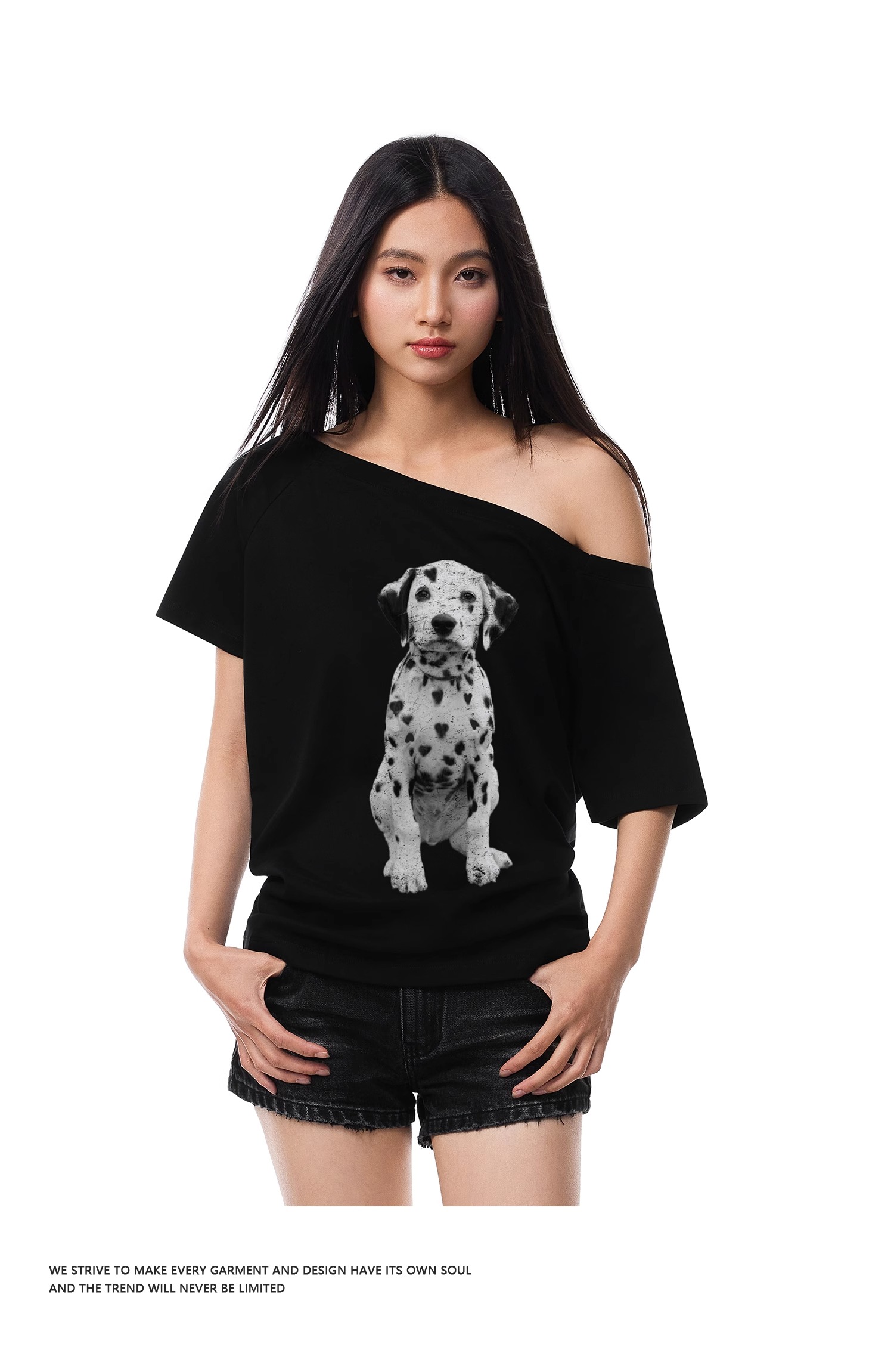 FDR官方店 爱心斑点小狗辣妹斜肩短袖t恤女夏季露肩宽松上衣