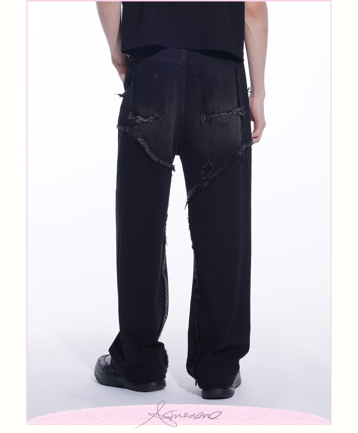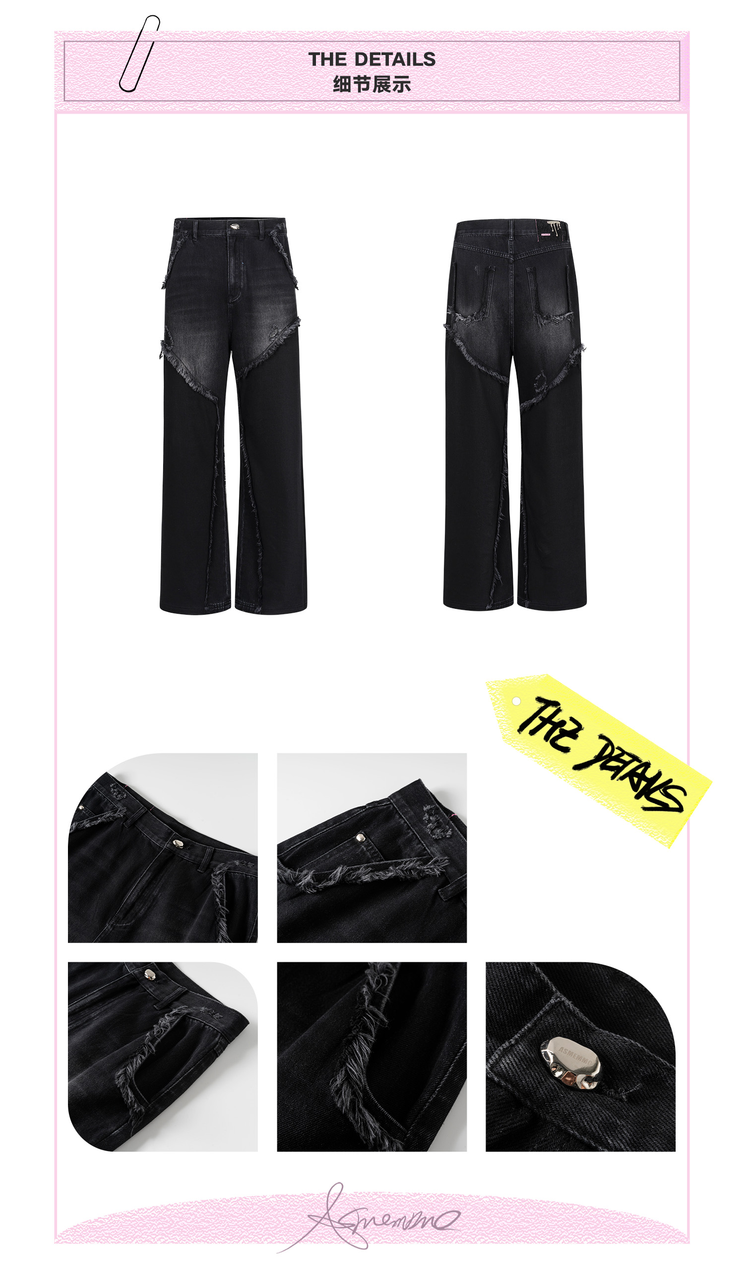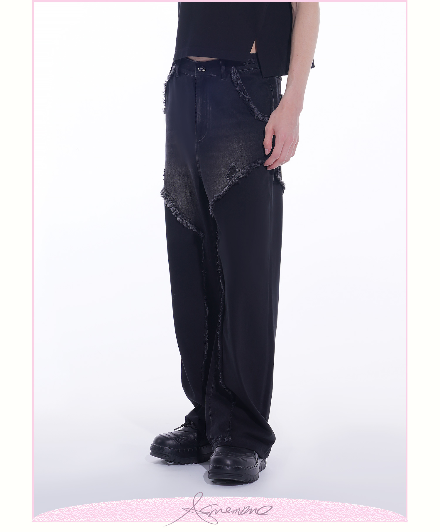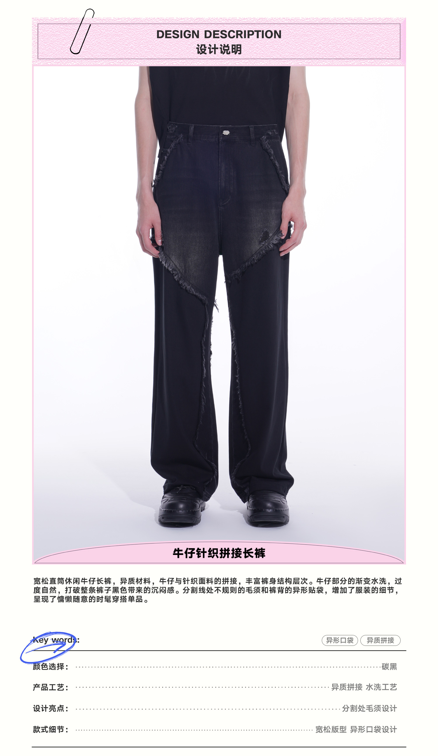 ASMEMMO咦哇•牛仔针织拼接长裤夏季黑色毛边直筒百搭休闲裤男潮