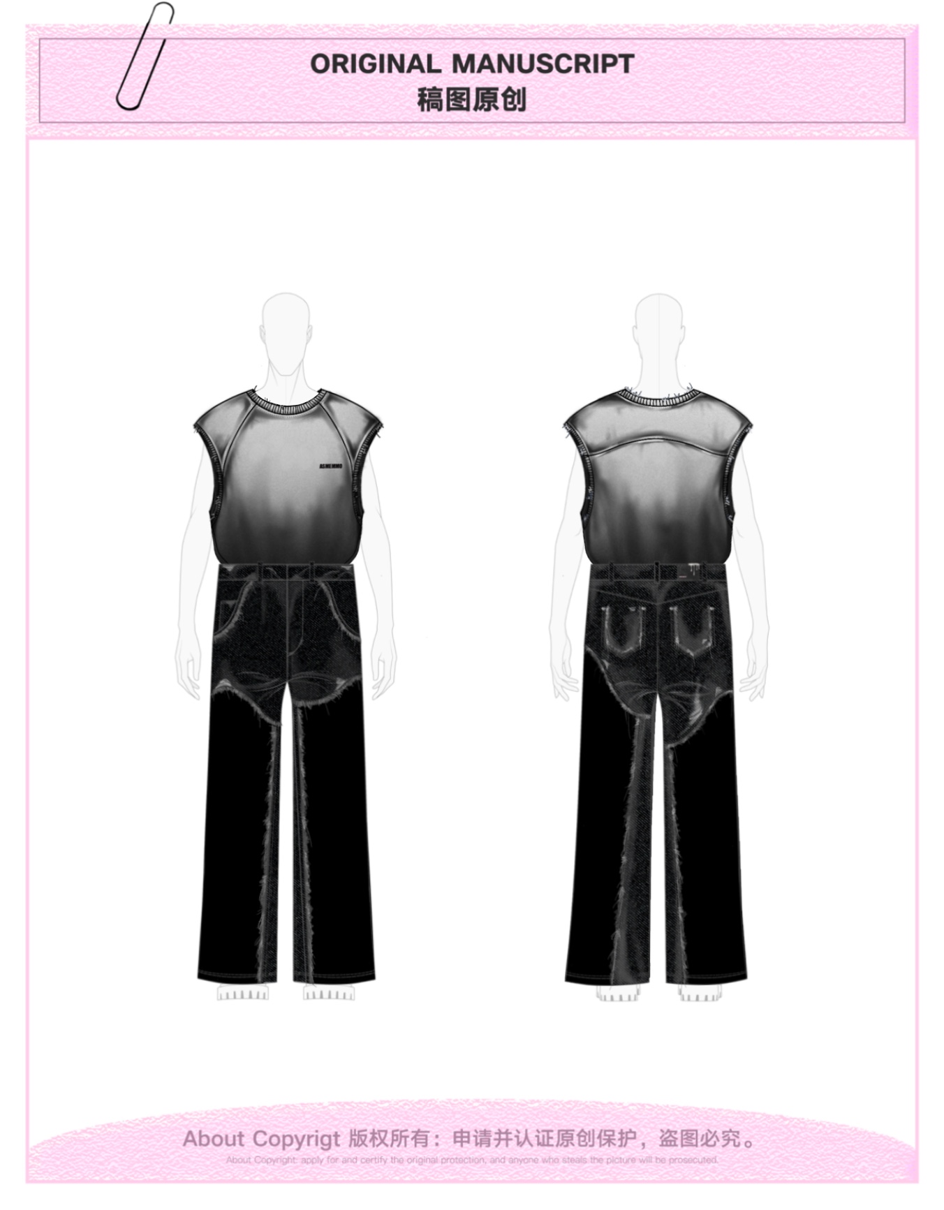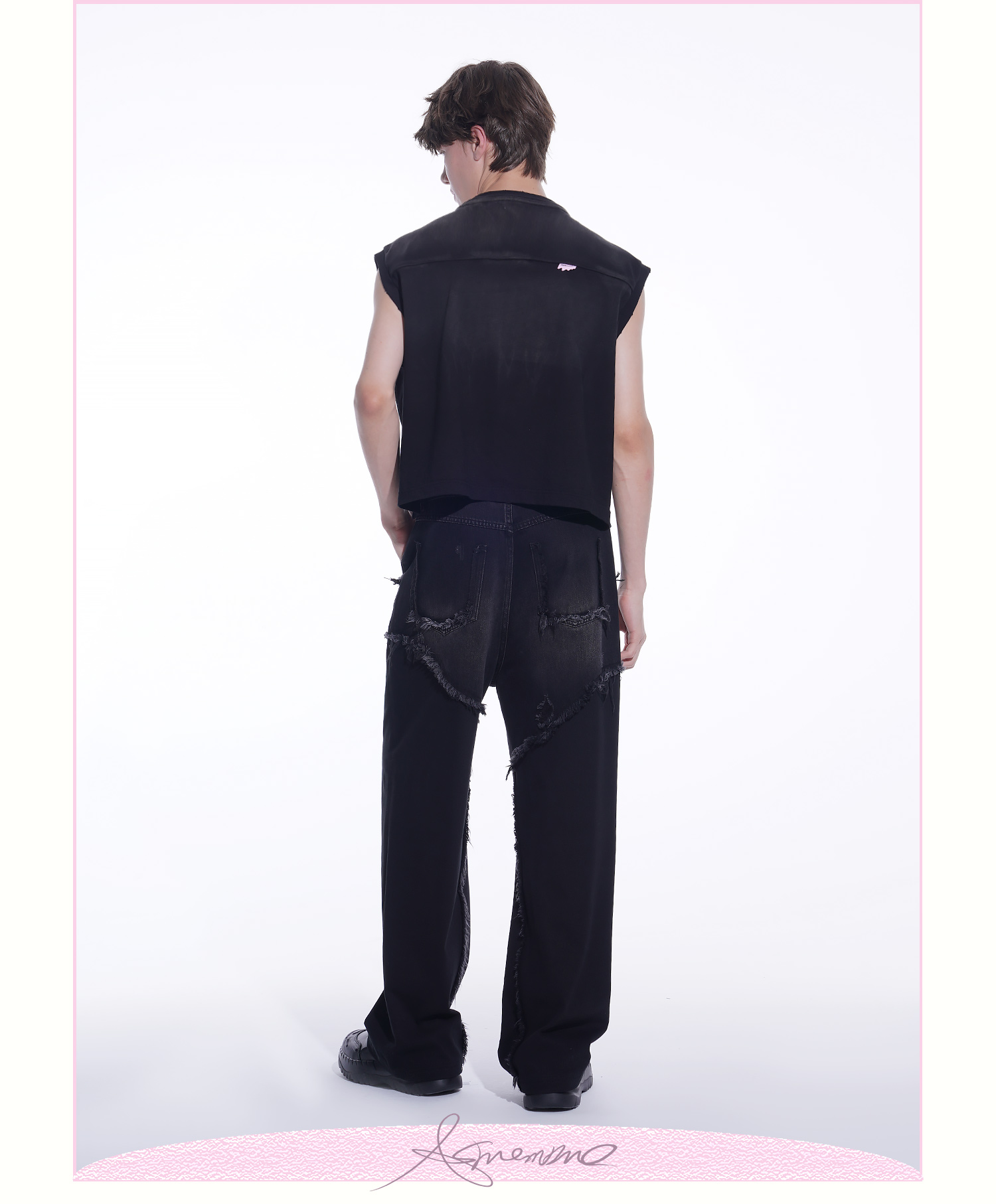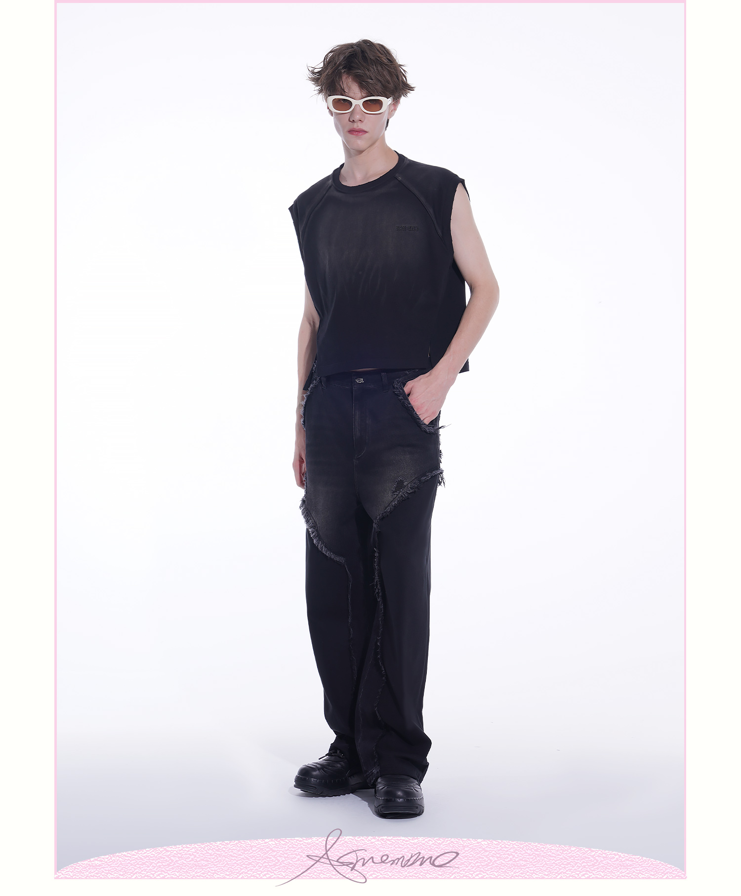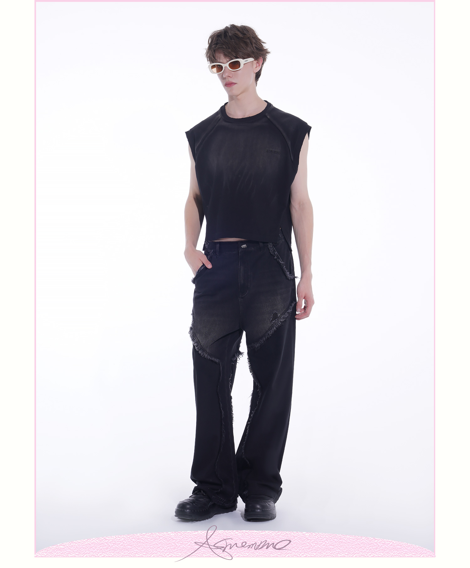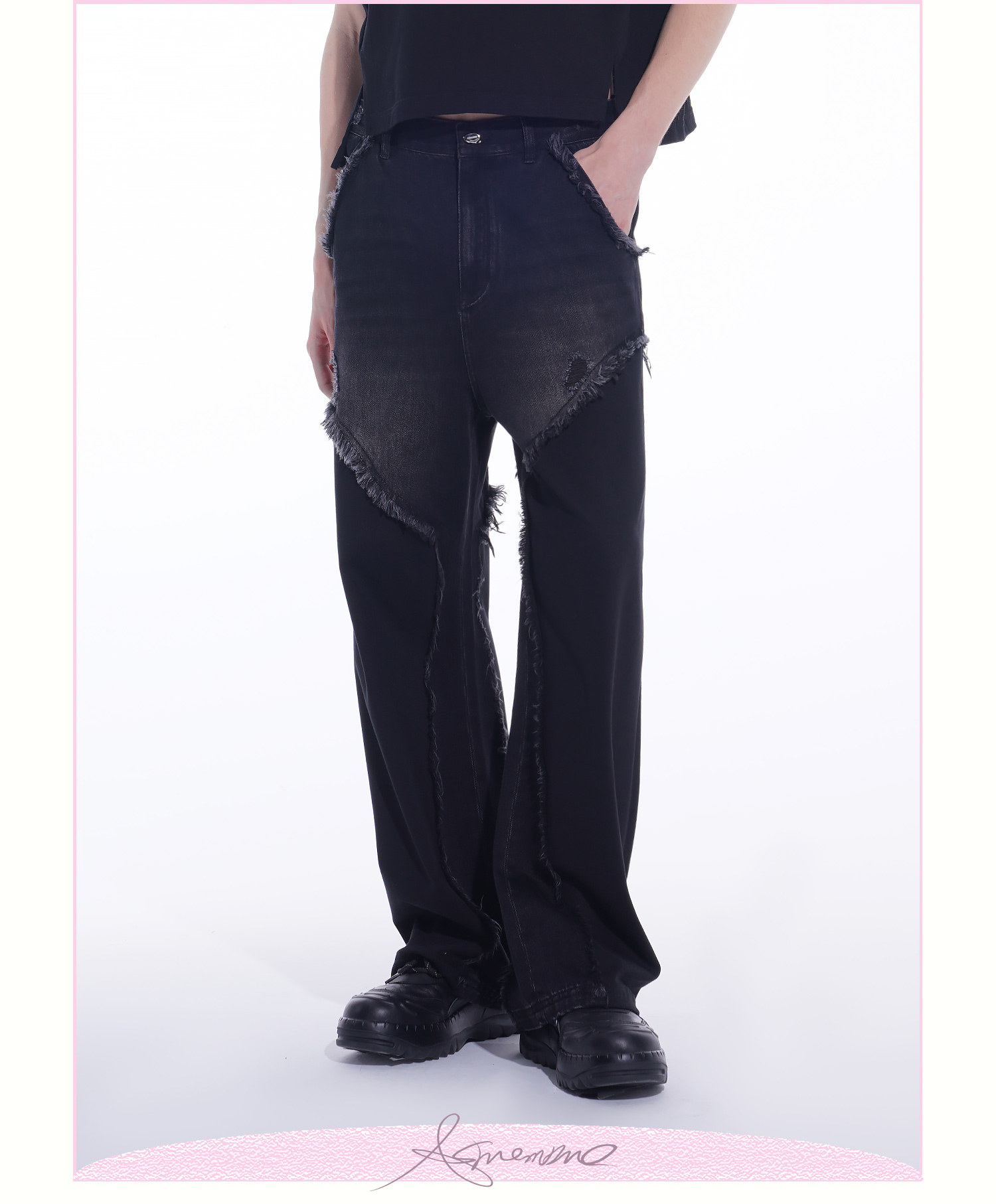ASMEMMO咦哇•牛仔针织拼接长裤夏季黑色毛边直筒百搭休闲裤男潮