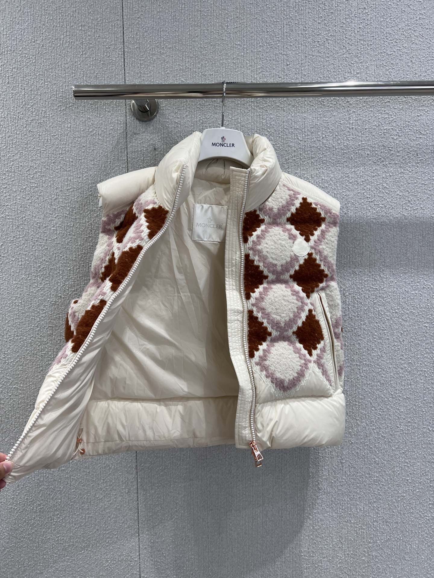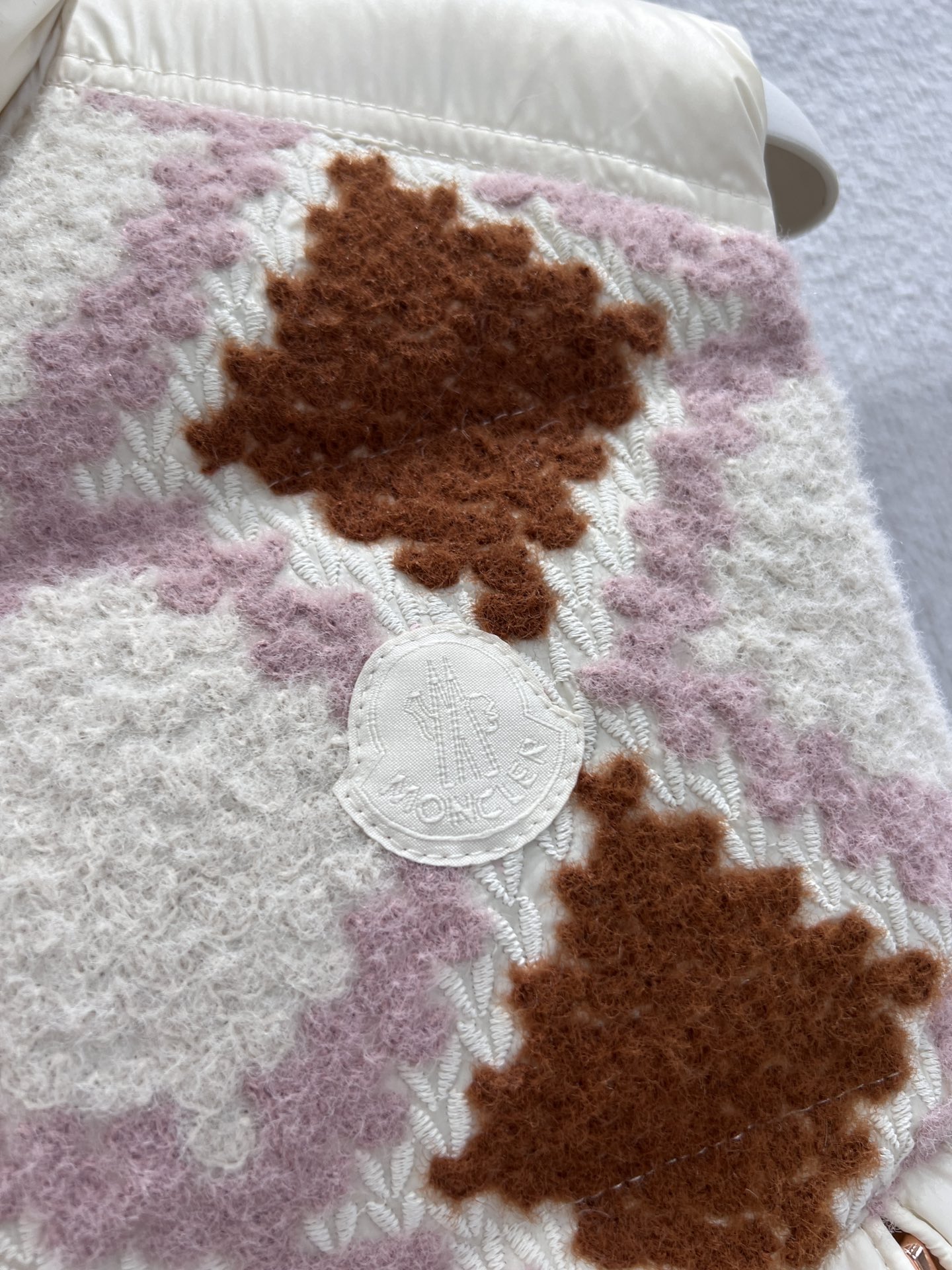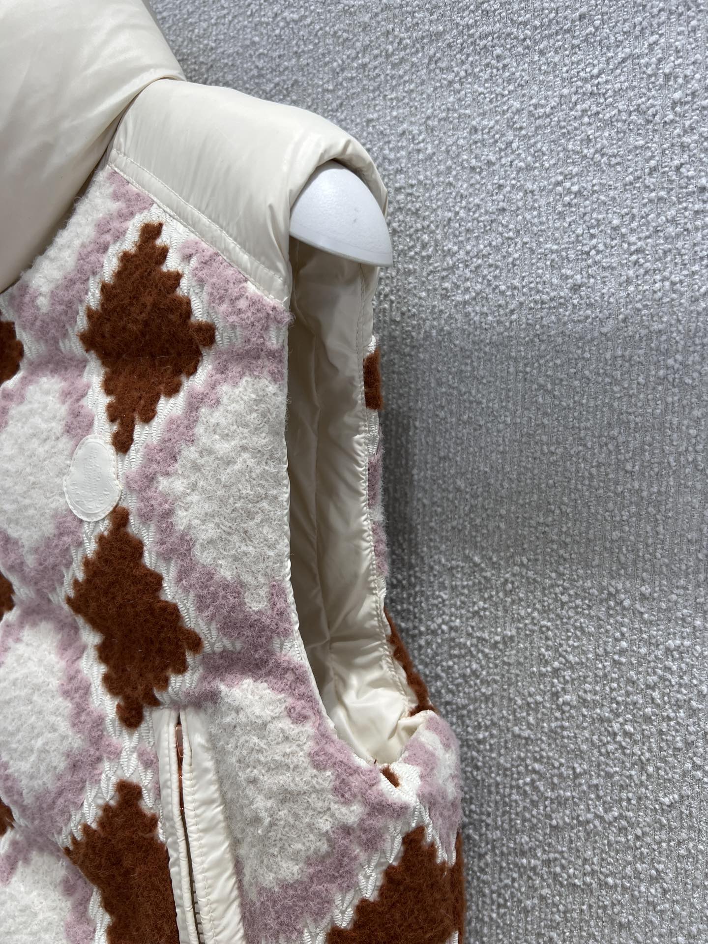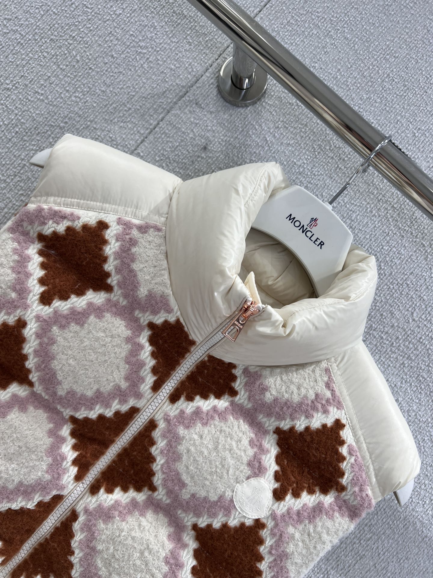 Moncle* 25Fw秋冬新款 Armathia立领格纹短款羽绒马甲丨⚠独家yb开发!高版出品!采用短款立领廓形,利落剪裁瞬间提升腰线,立领设计既能抵御寒风又添飒爽气场;粉棕菱格纹针织拼接羽绒面料,将复古格纹的优雅与标志性的羽绒保暖性大胆融合,金属拉链与品牌徽标细节,更在精致感与机能感间达成精妙平衡。