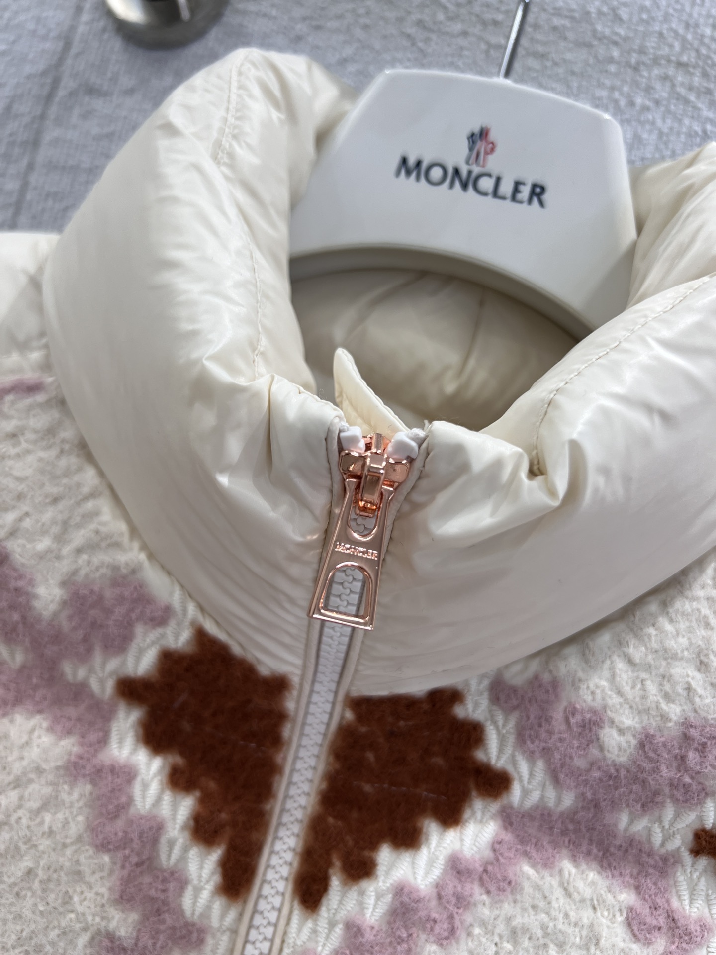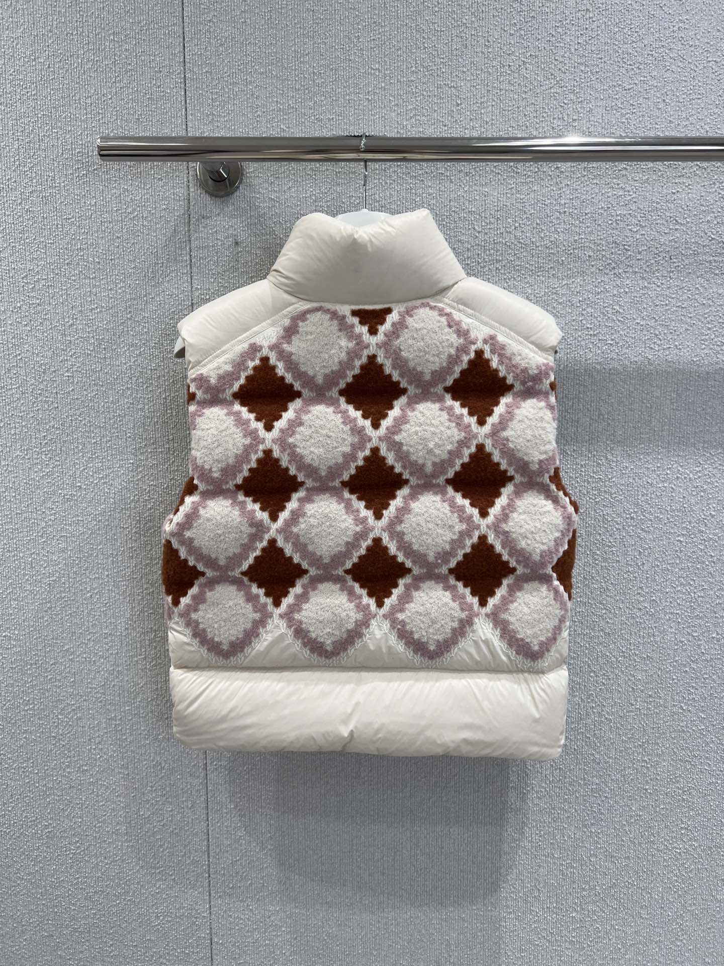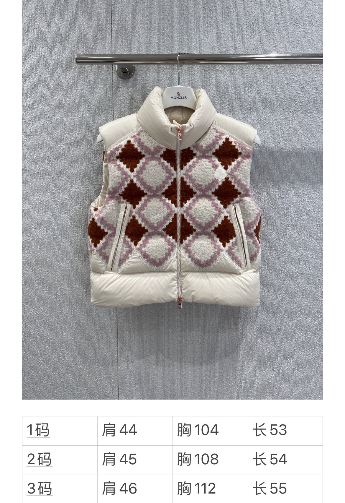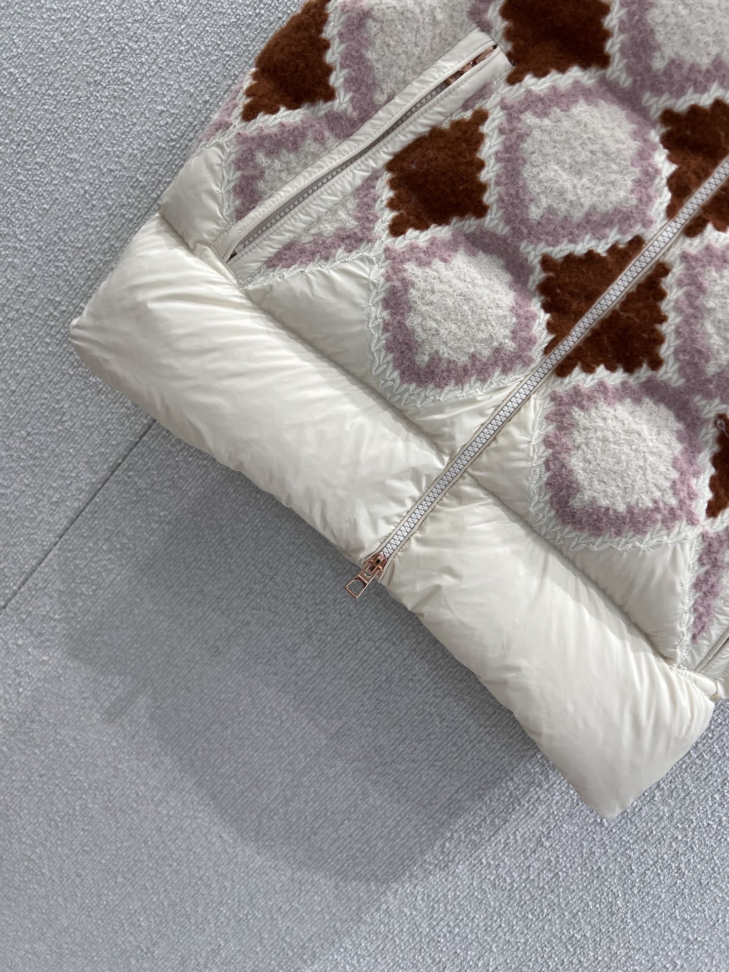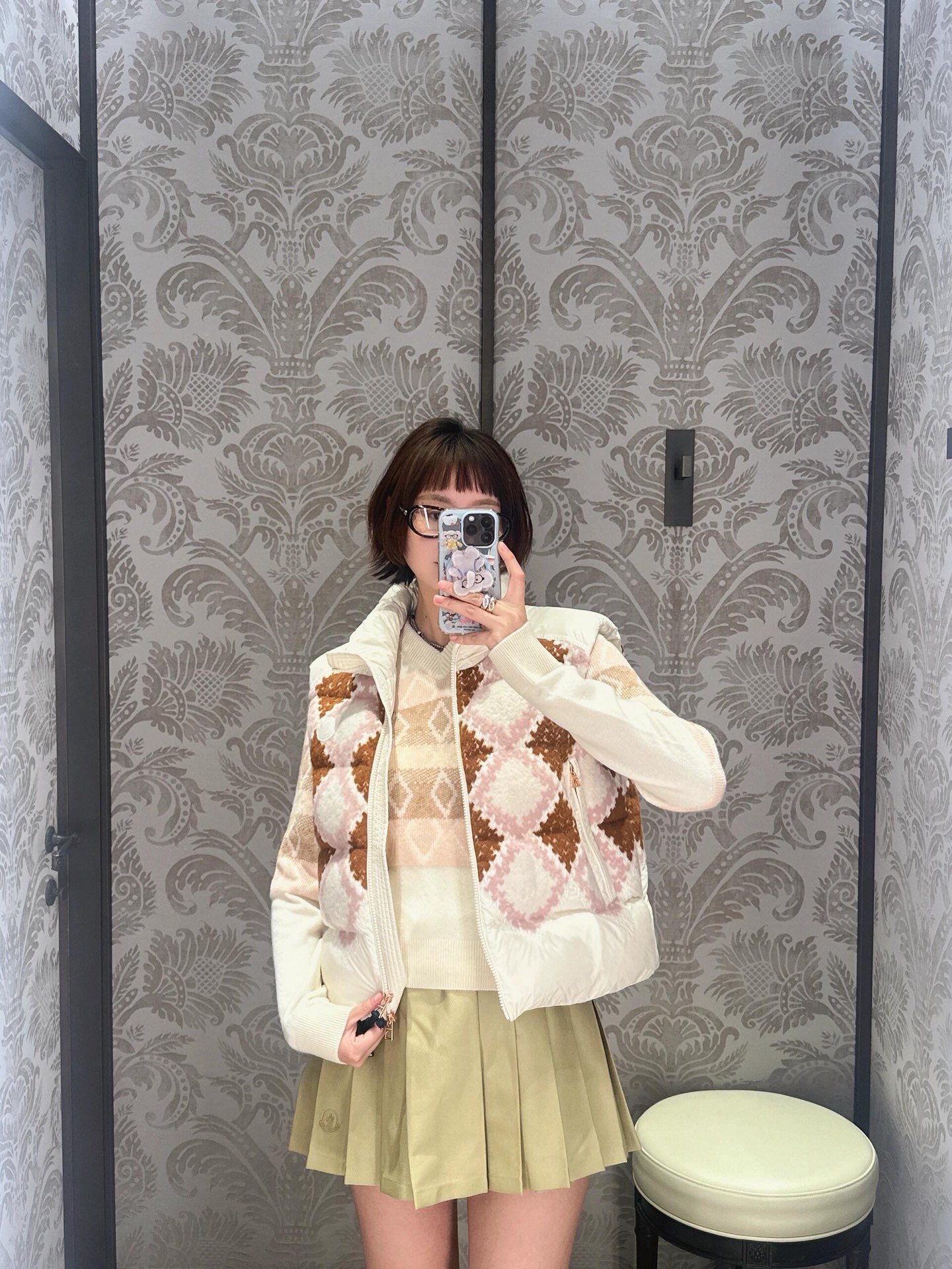 Moncle* 25Fw秋冬新款 Armathia立领格纹短款羽绒马甲丨⚠独家yb开发!高版出品!采用短款立领廓形,利落剪裁瞬间提升腰线,立领设计既能抵御寒风又添飒爽气场;粉棕菱格纹针织拼接羽绒面料,将复古格纹的优雅与标志性的羽绒保暖性大胆融合,金属拉链与品牌徽标细节,更在精致感与机能感间达成精妙平衡。