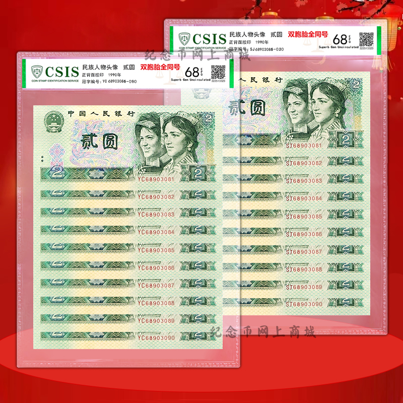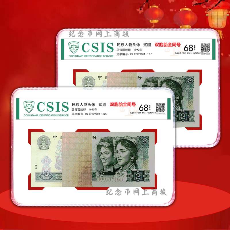 四版90版2元,2张纸币号码全部相同,双胞胎全同号