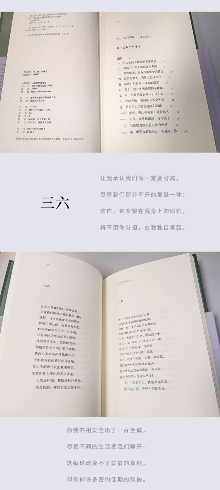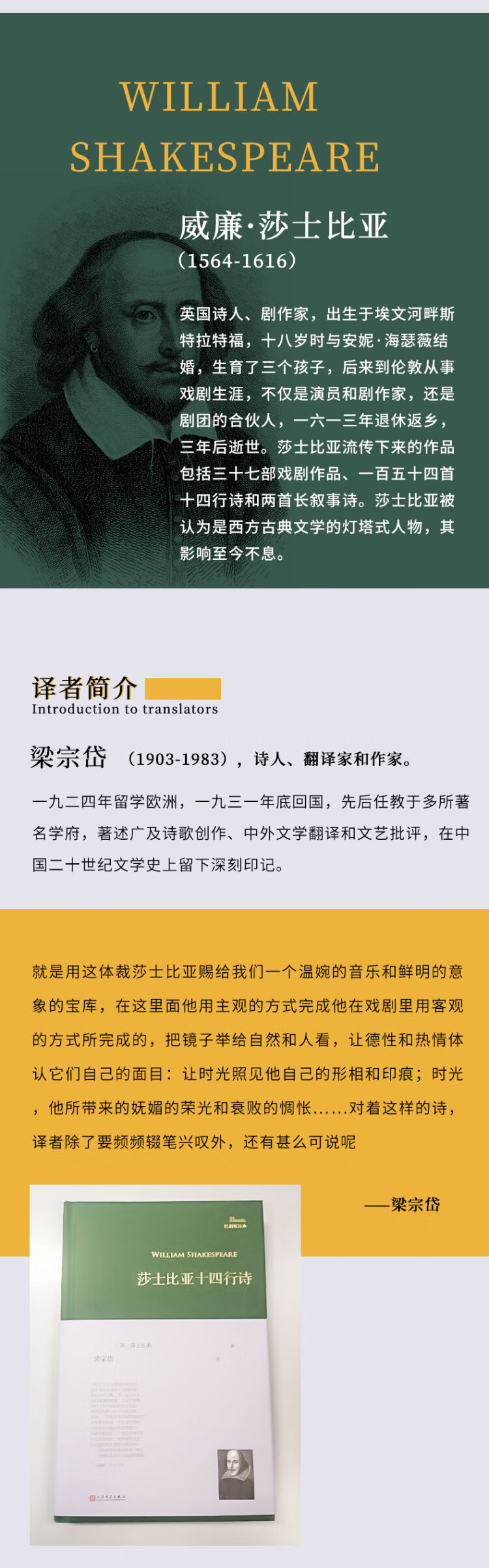 就是用这体裁莎士比亚赐给我们一个温婉的音乐和鲜明的意象的宝库,在这里面他用主观的方式完成他在戏剧里用客观的方式所完成的,把镜子举给自然和人看,让德性和热情体认它们自己的面目:让时光照见他自己的形相和印痕;时光,他所带来的妩媚的荣光和衰败的惆怅……对着这样的诗,译者除了要频频辍笔兴叹外,还有甚么可说呢?