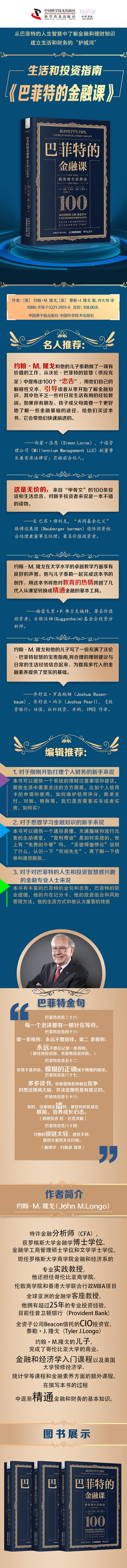 本书内容既包括诸如货币的时间价值和复利、债券和通货膨胀、股票市场基础、三大财务报表等基本概念,还有对股票进行估值的方法,如何根据巴菲特的黄金法则来建立一个投资组合等,无论我们是想发展我们的个人财务,发展我们的商业头脑或提高软职业技能,如情商,都可以从巴菲特的忠告中找到合适的技巧。