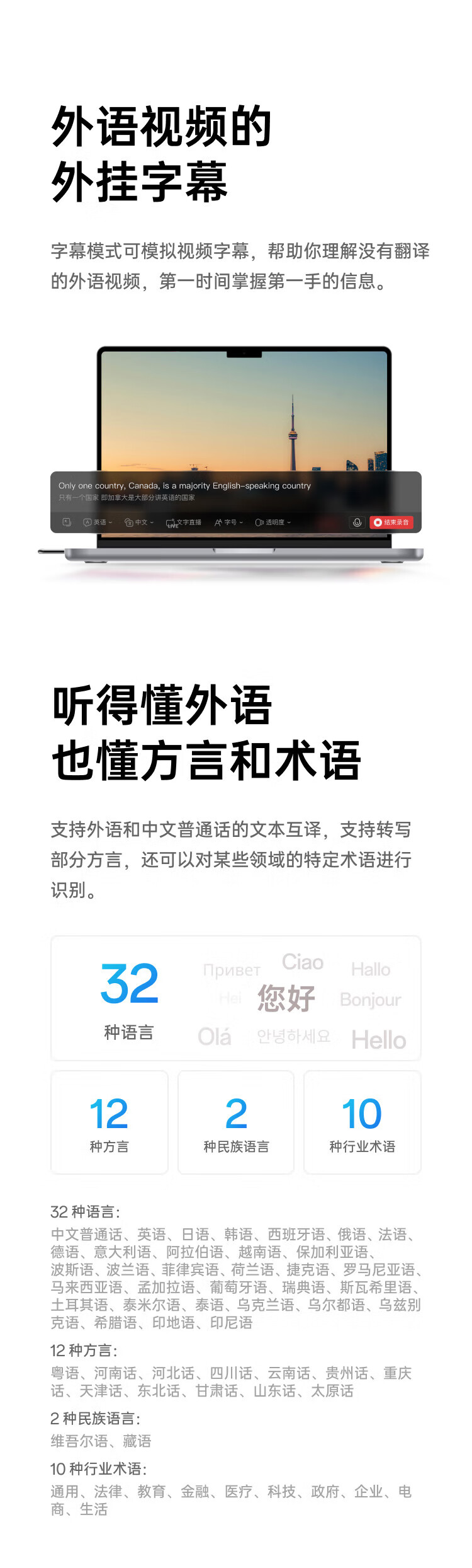 语言支持:支持 32 种语言、12 种方言和 10 种行业术语的识别转译,还可以作为外语视频的外挂字幕。