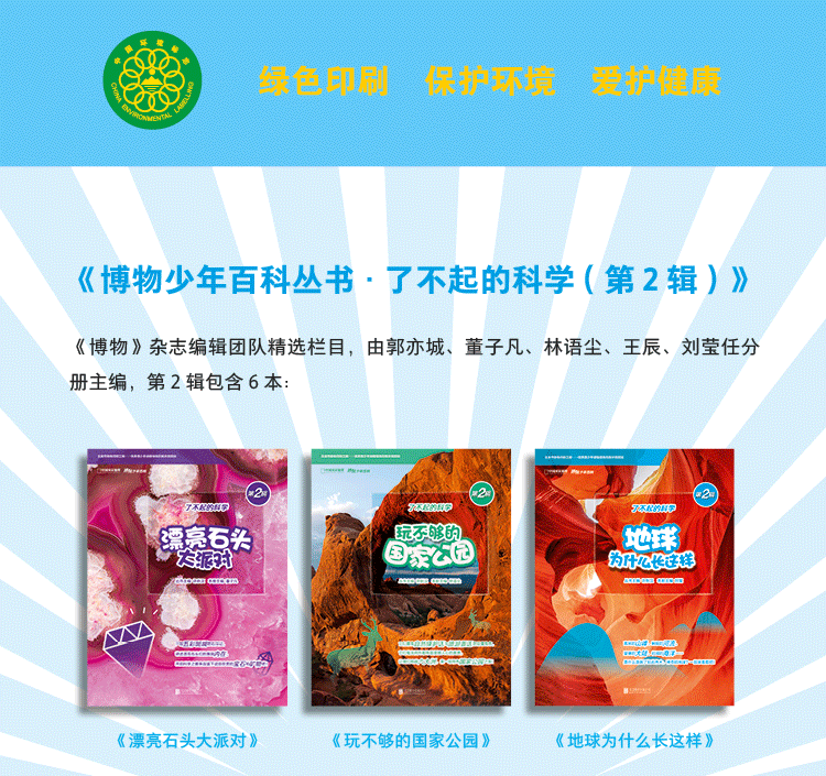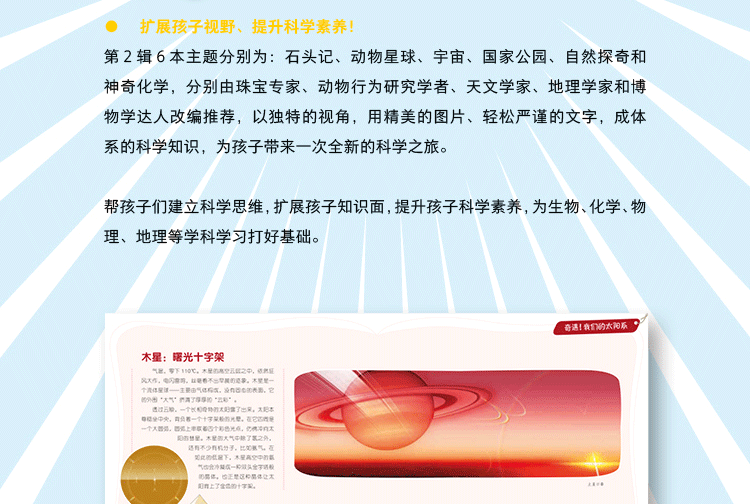 第2辑6本主题分别为:石头记、动物星球、宇宙、国家公园、自然探奇和神奇化学,分别由珠宝鉴定师、动物行为研究学者、天文学家、地理学家和博物学达人改编推荐,以独特的视角,用精美的图片、轻松严谨的文字,成体系的科学知识,为孩子带来一次全新的科学之旅。