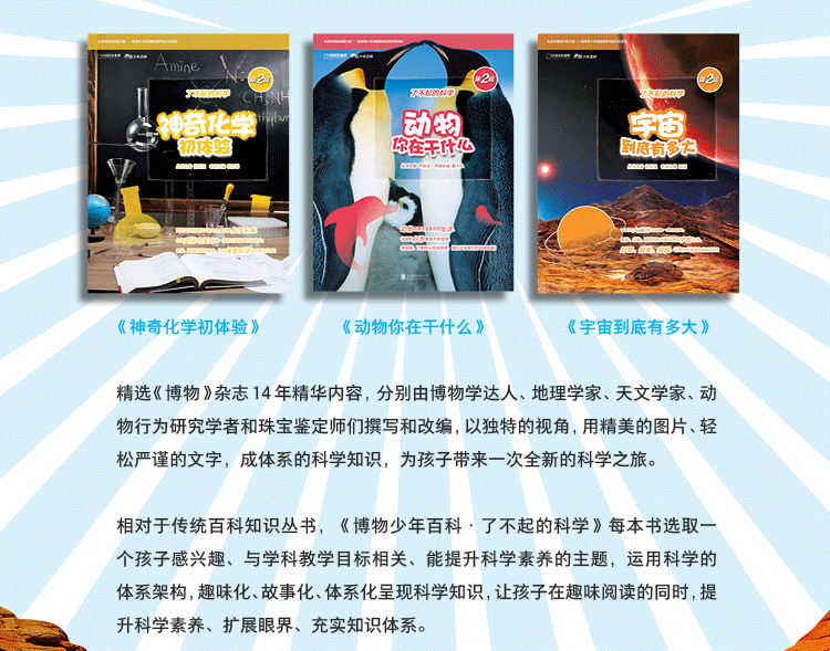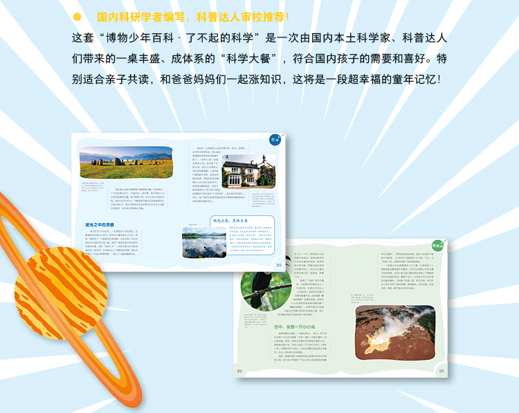 这套“博物少年百科·了不起的科学”是一次由国内本土科学家、科普达人们带来的一桌丰盛、成体系的“科学大餐”,符合国内孩子的需要和喜好。特别适合亲子共读,和爸爸妈妈们一起涨知识,这将是一段超幸福的童年记忆!