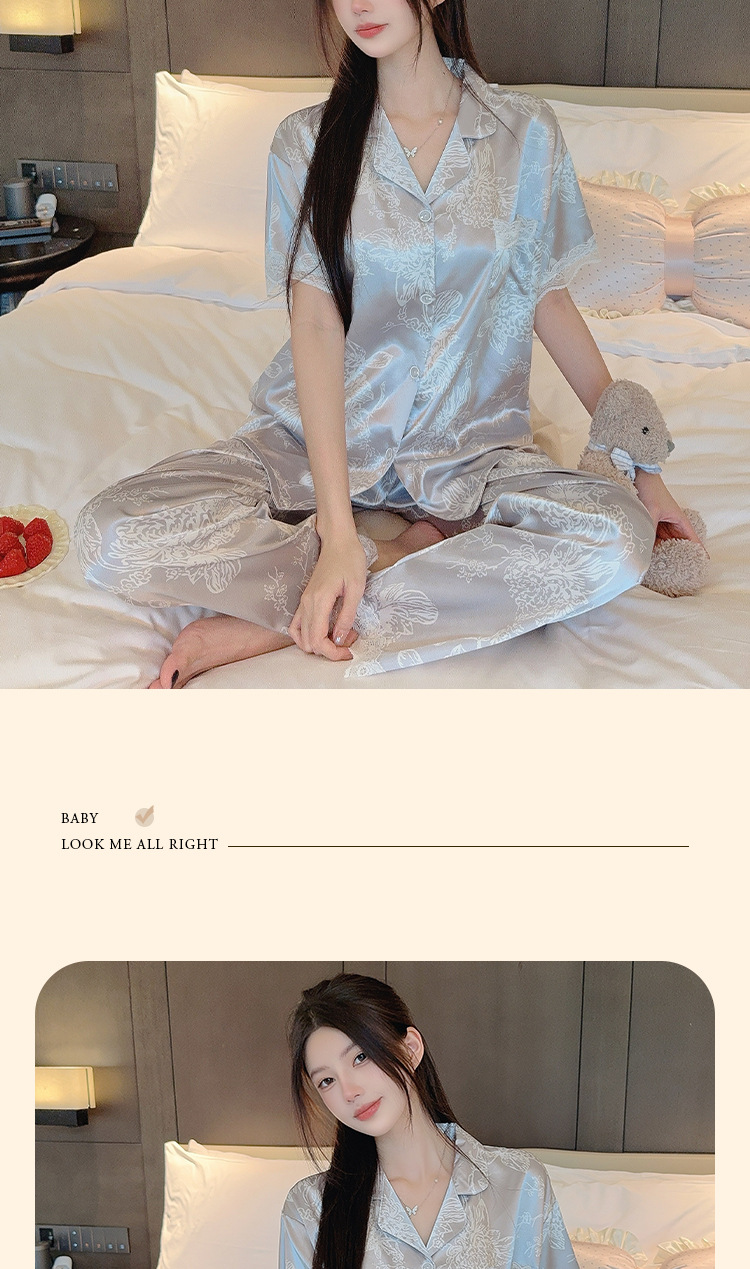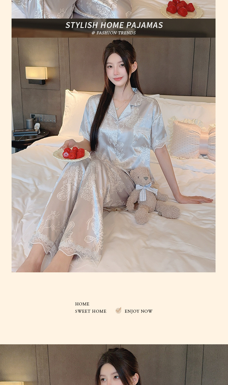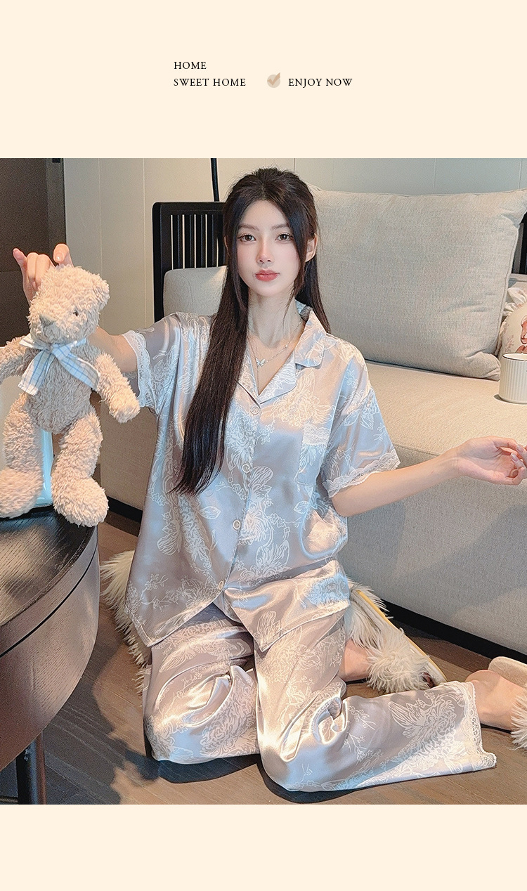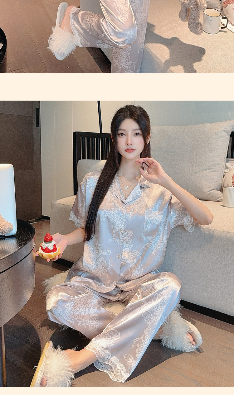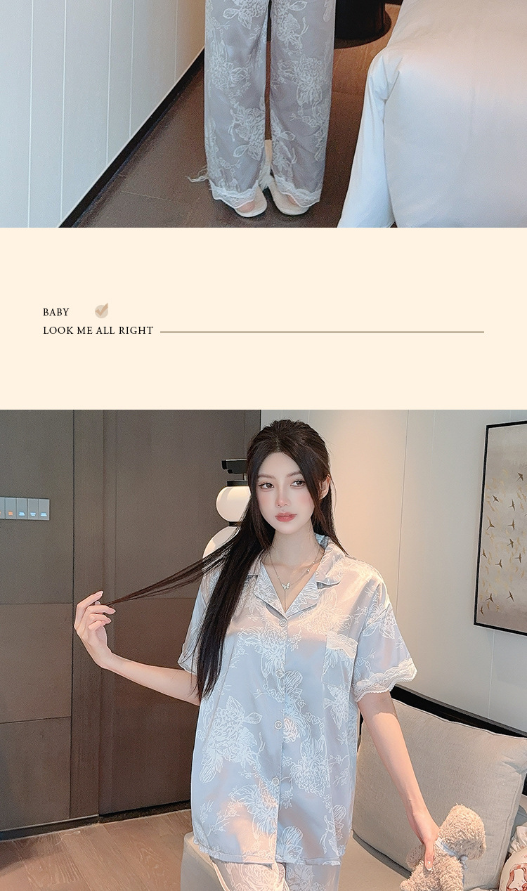 花卉ins风高级感冰丝睡衣女夏季短袖长裤休闲气质套装家居服批发