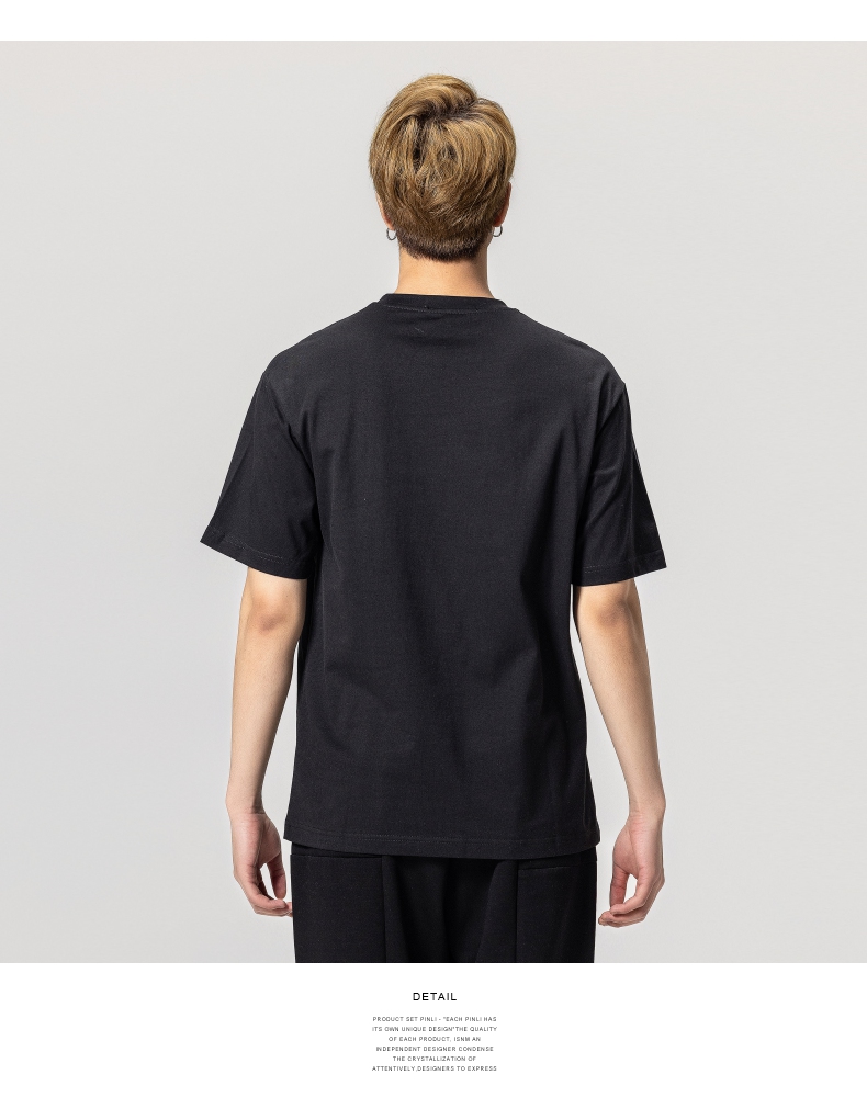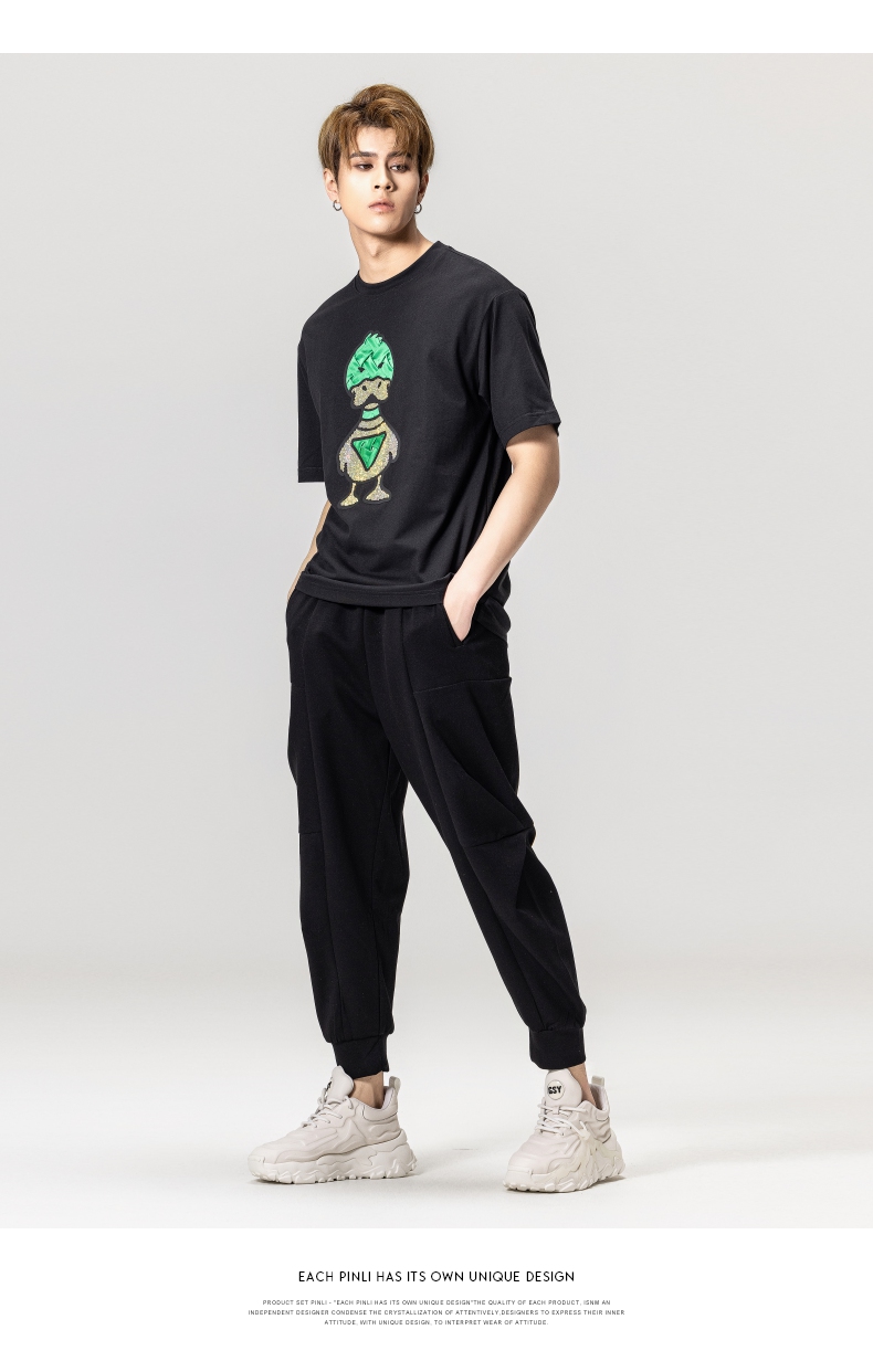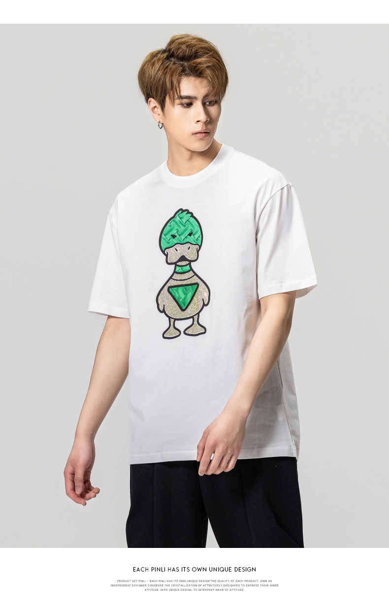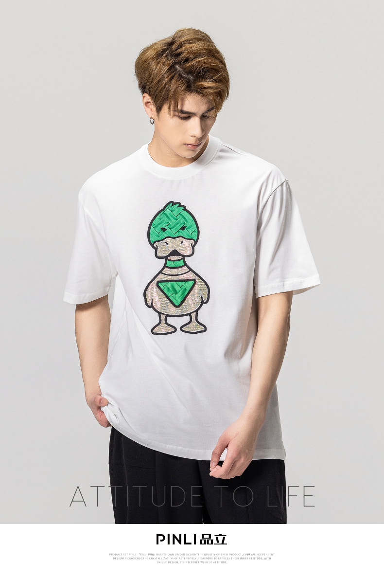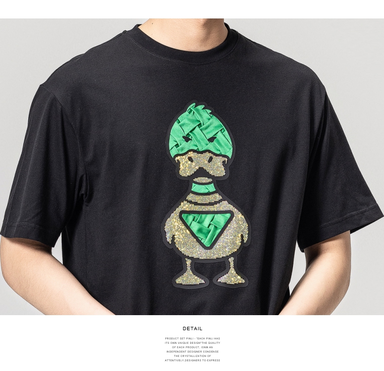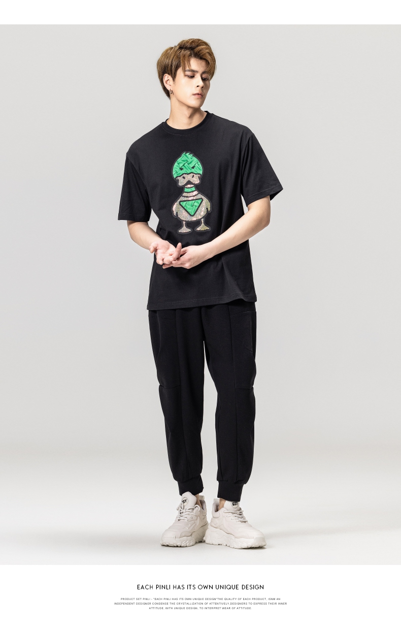 PINLI品立2023夏季新款男士圆领贴布烫钻短袖T恤上衣BG231111056