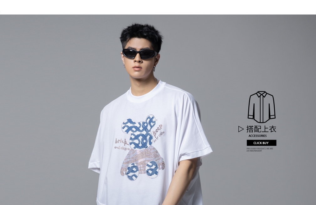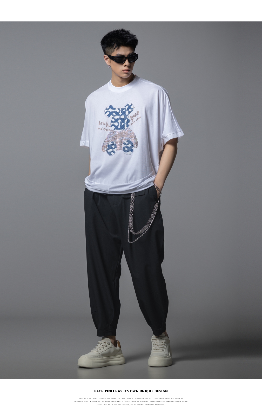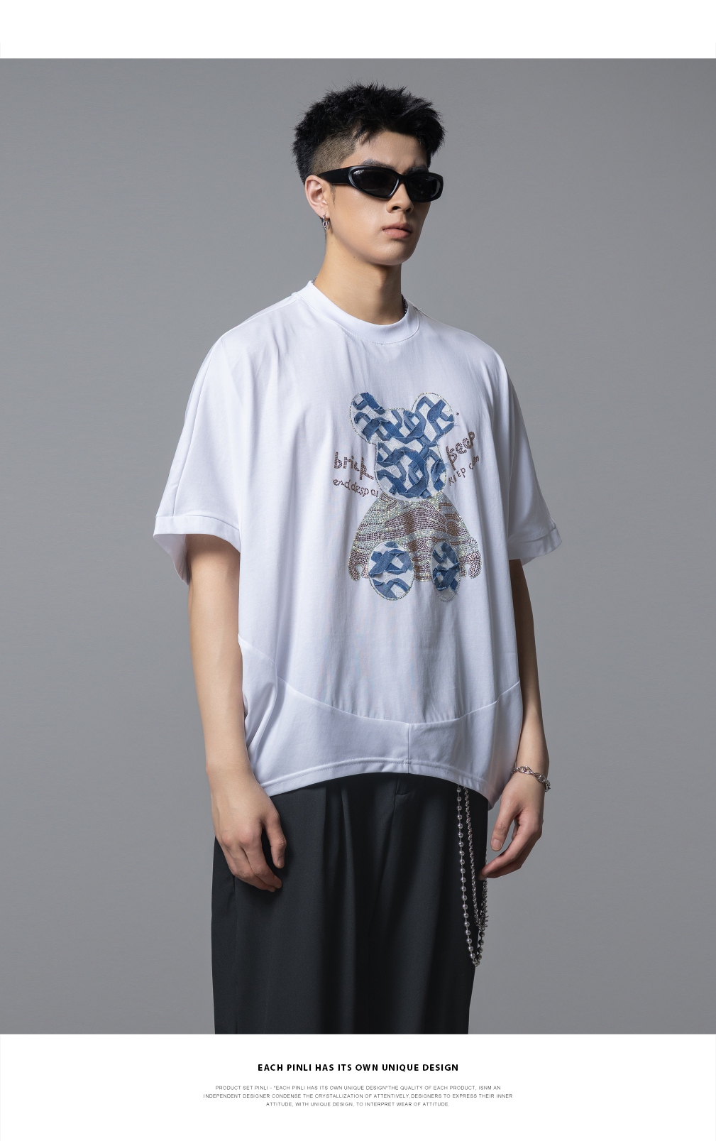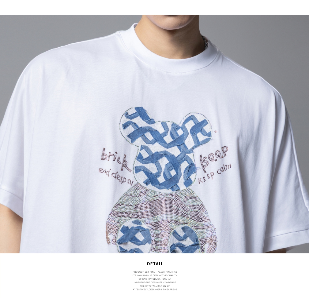 PINLI品立2025夏季新款小熊字母烫钻烫布圆领短袖T恤上衣体恤男士BG252111054