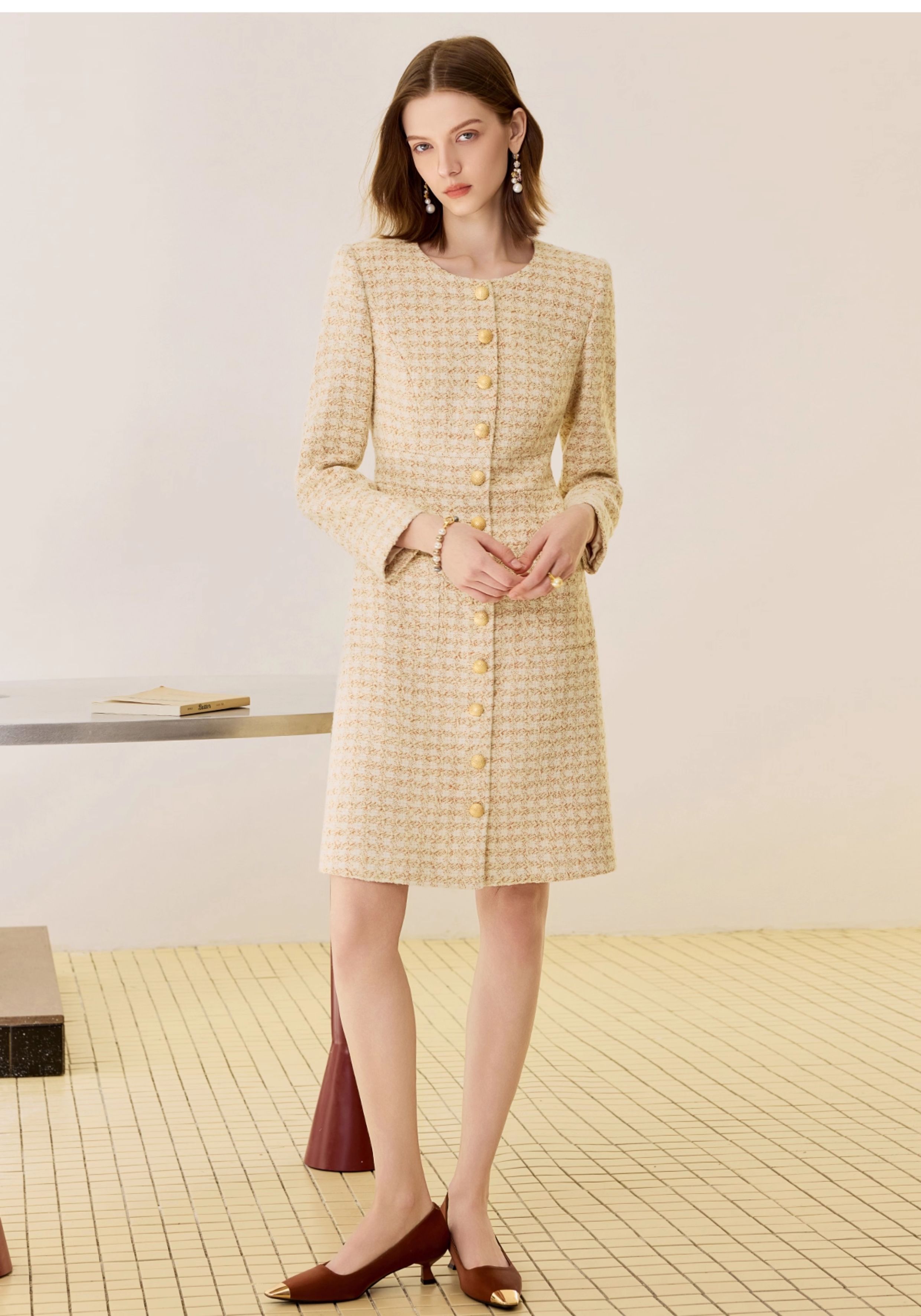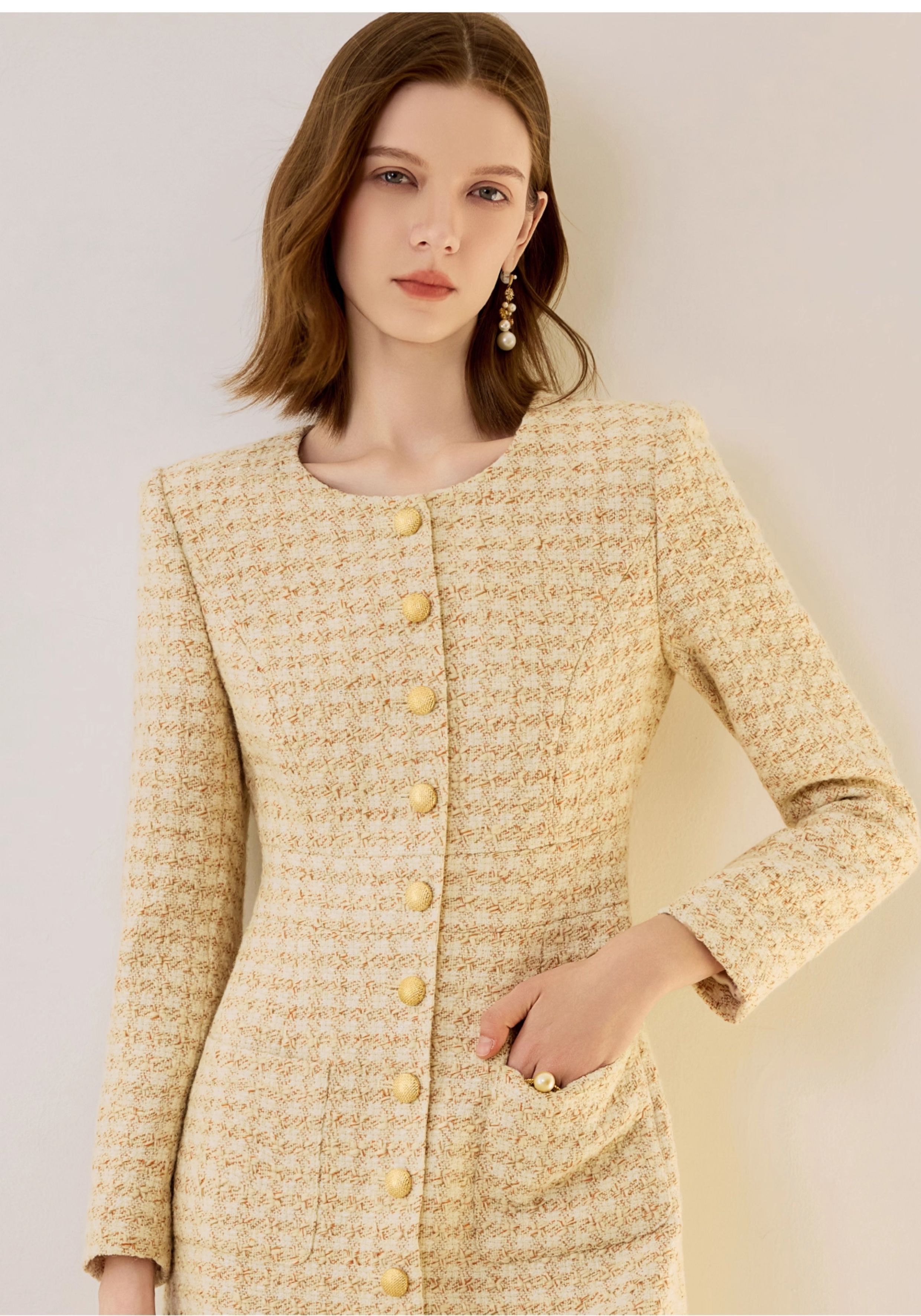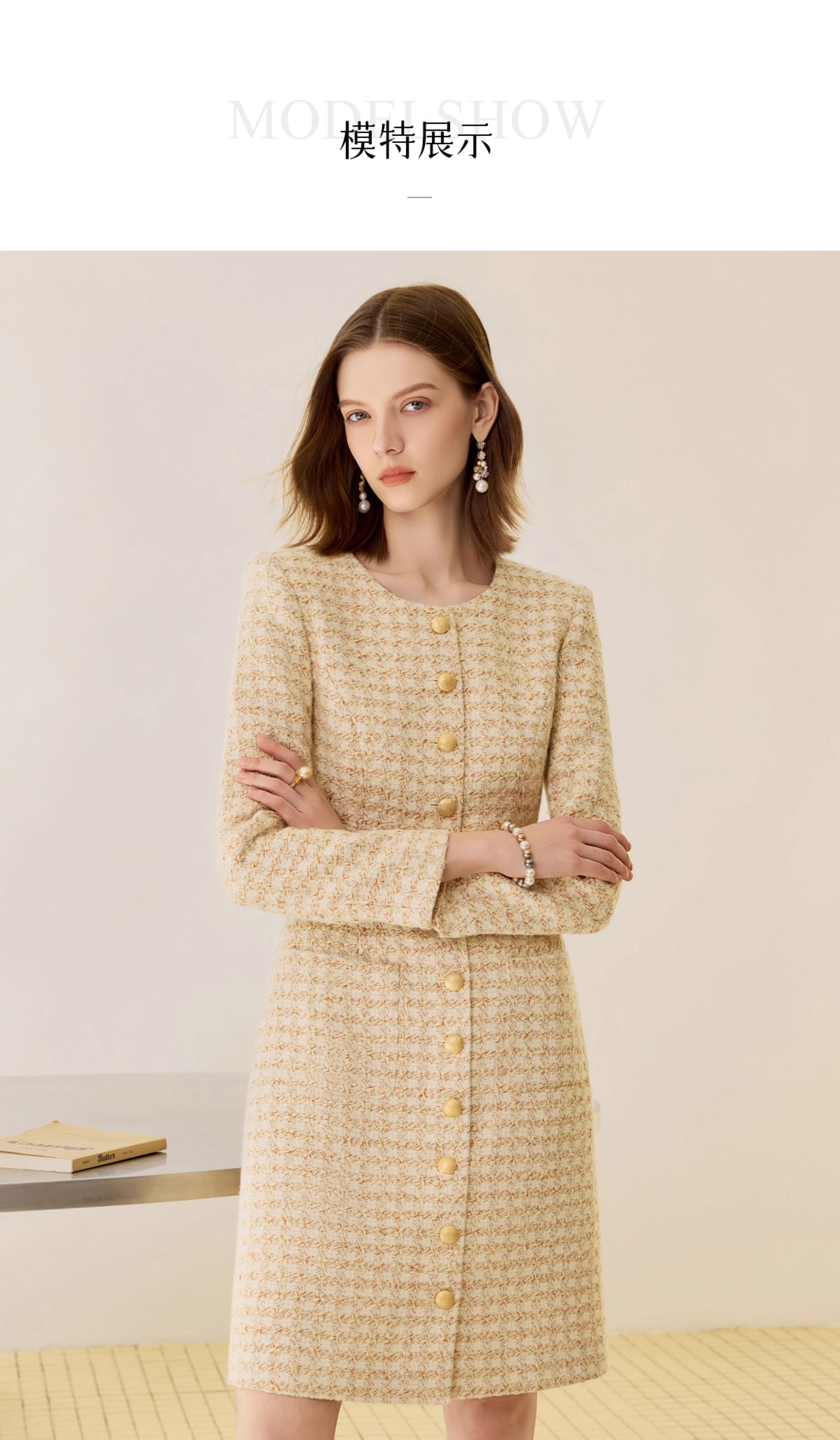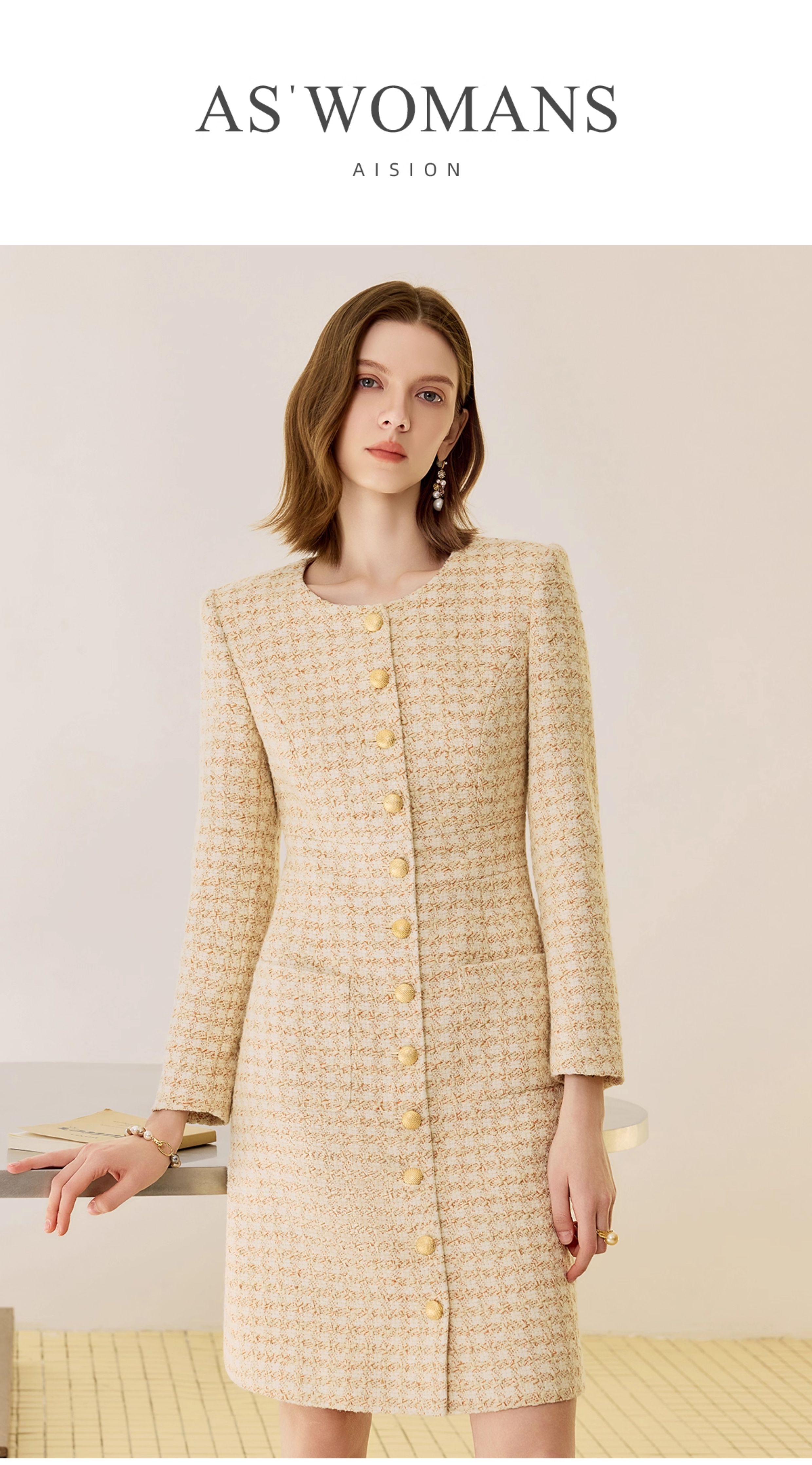艾尚臣羊毛西装连衣裙女秋冬新款圆领粗花呢中长裙法式小香风裙子