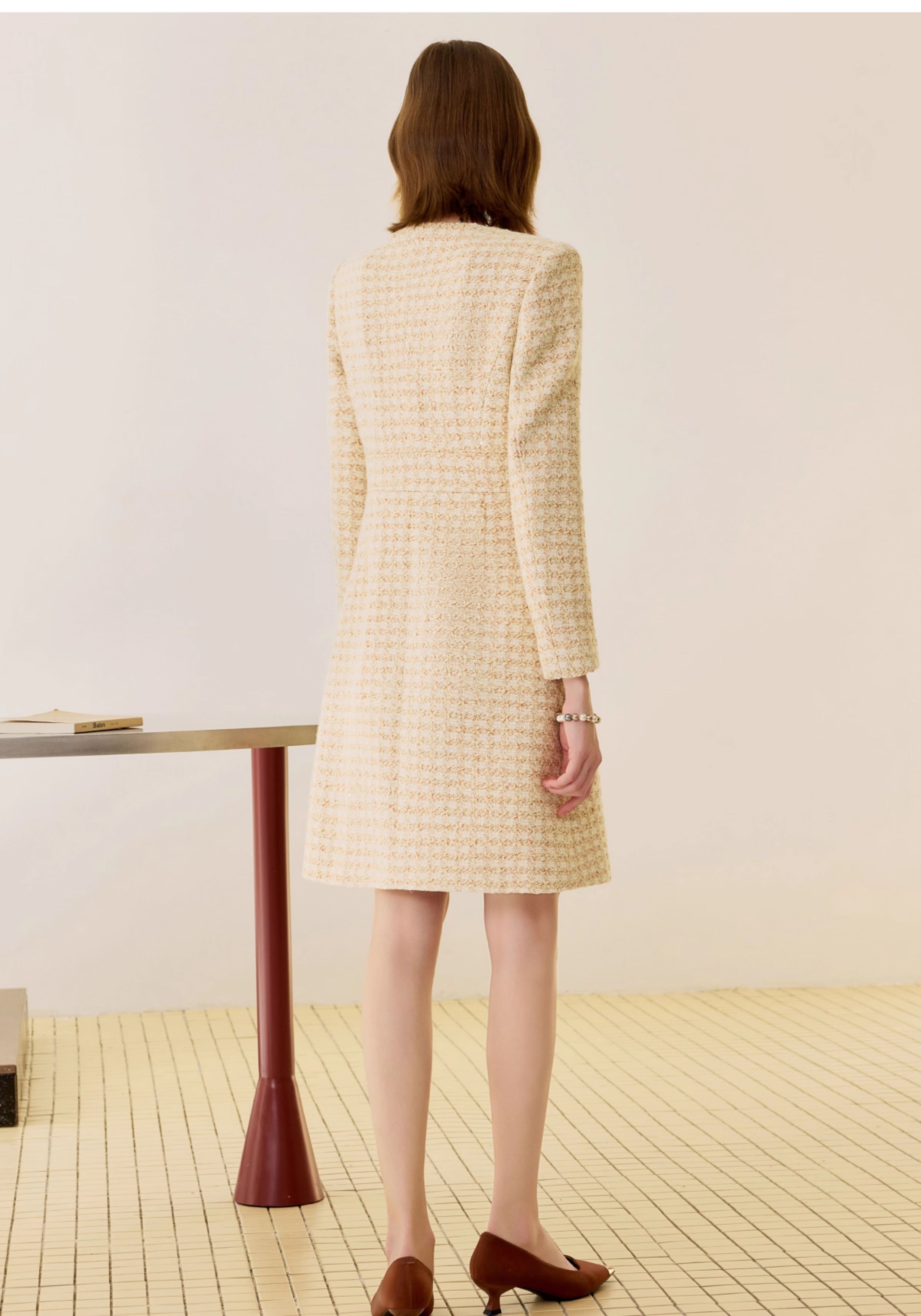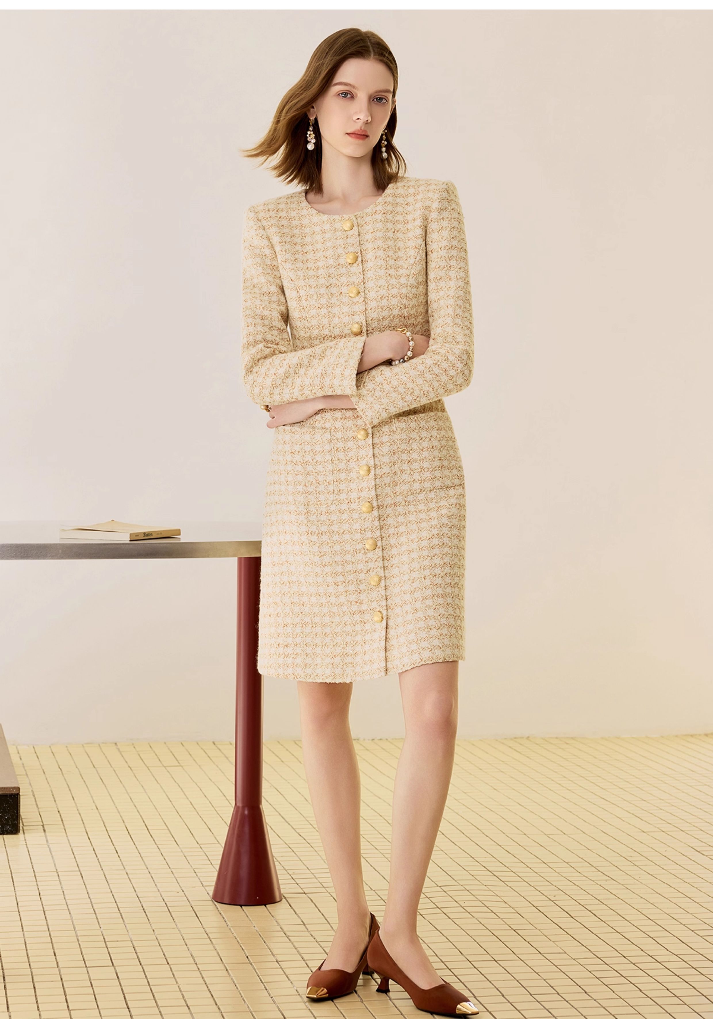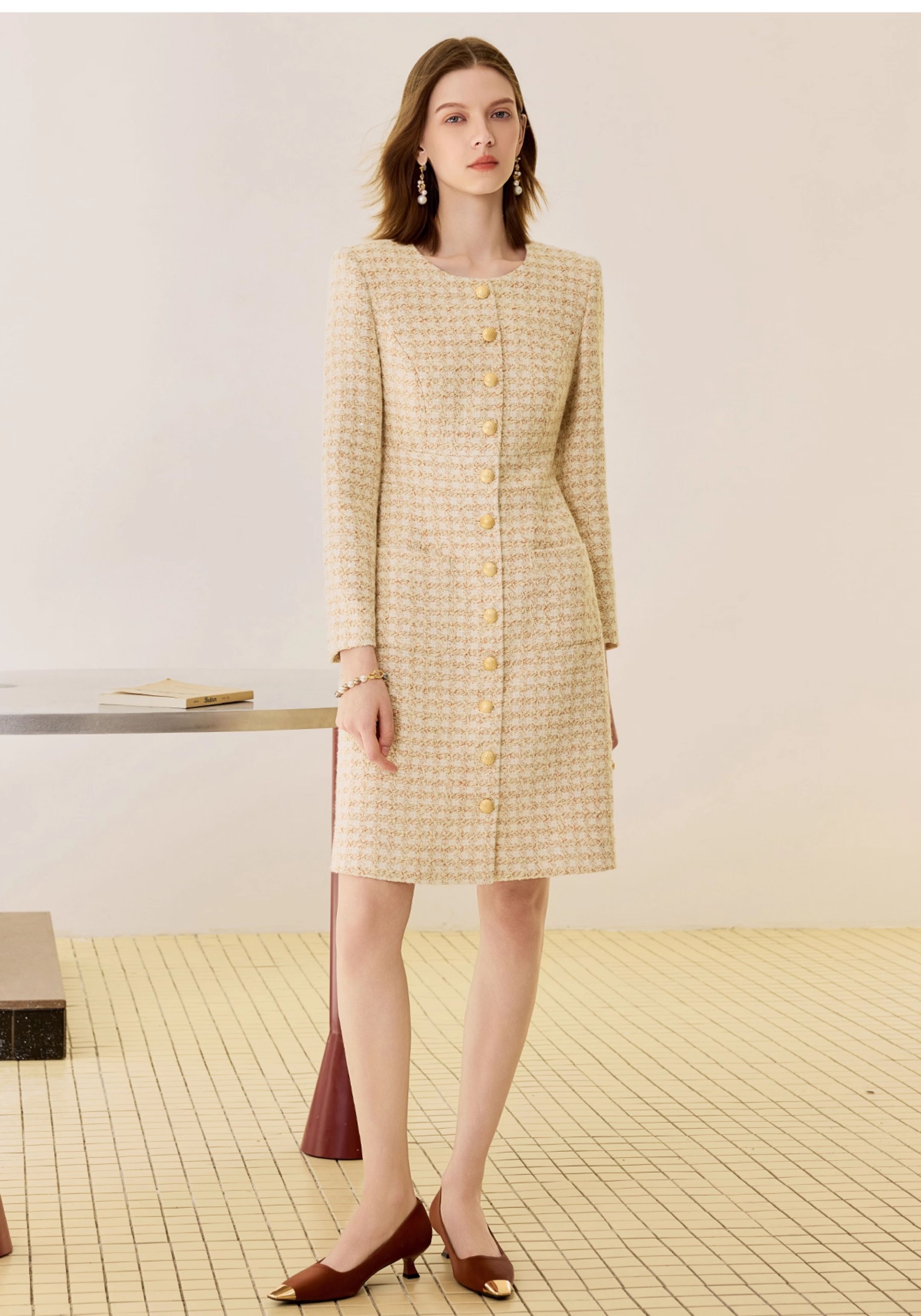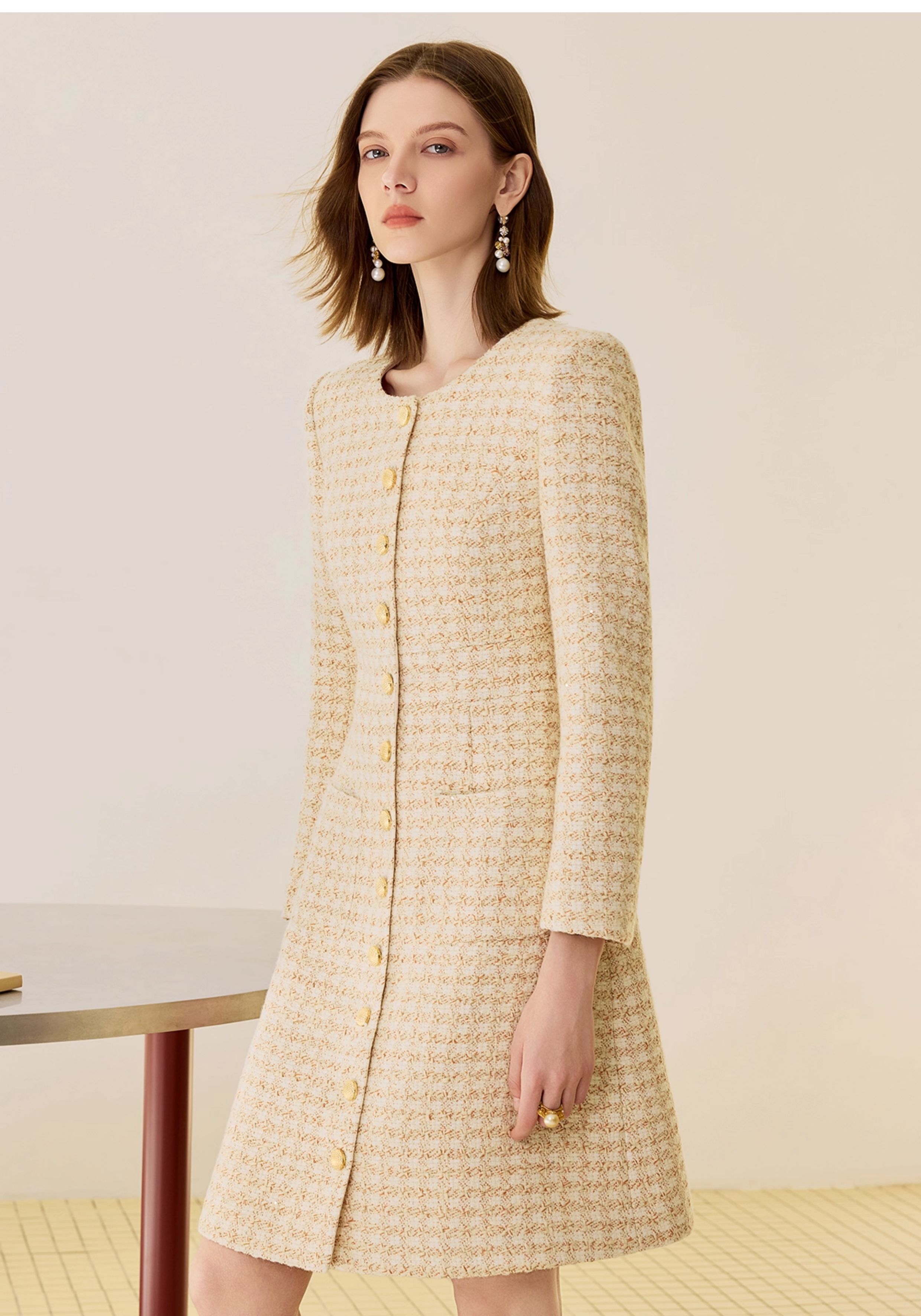 艾尚臣羊毛西装连衣裙女秋冬新款圆领粗花呢中长裙法式小香风裙子