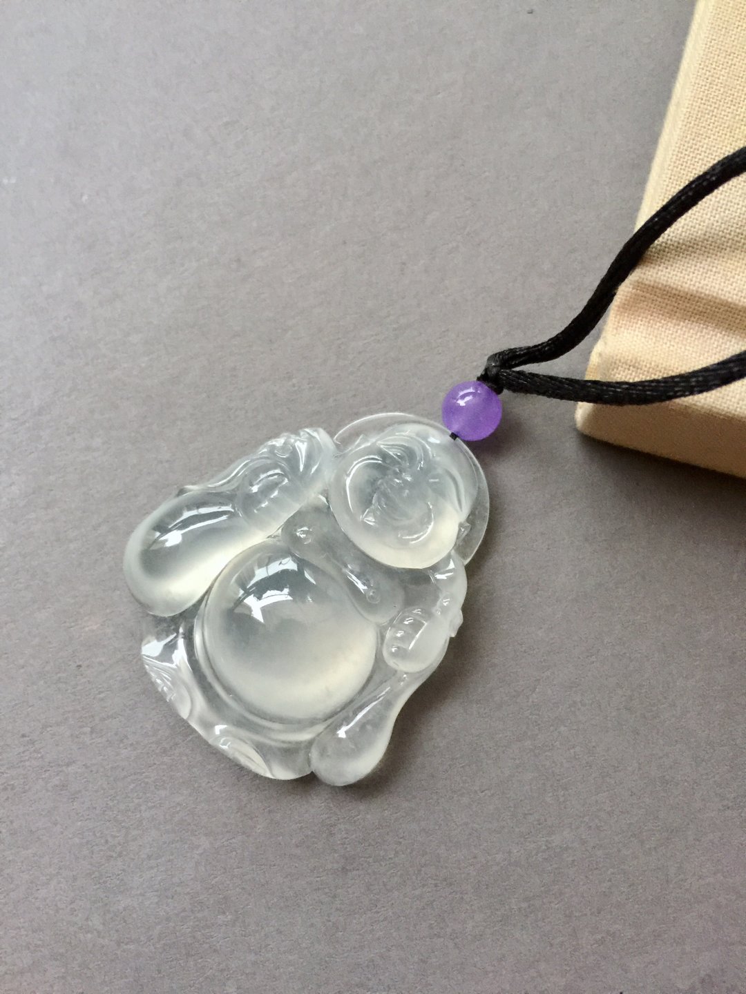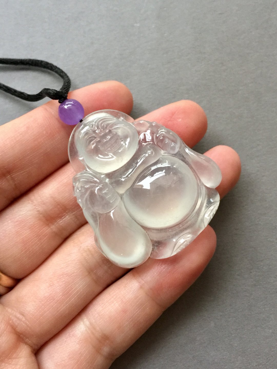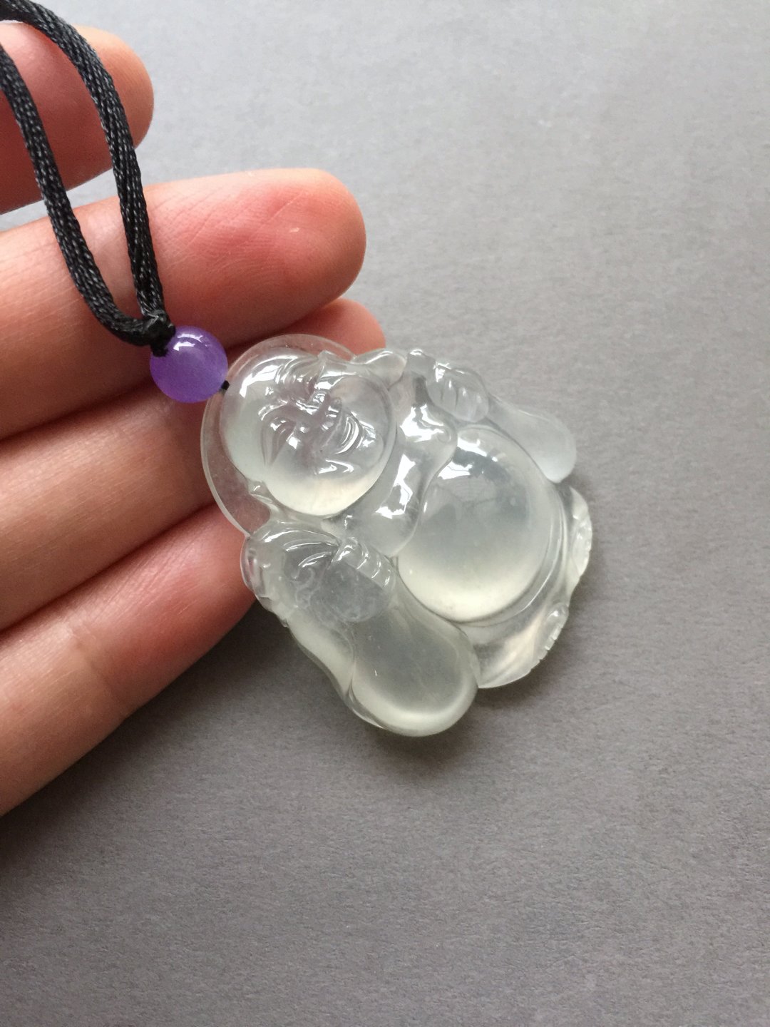 收藏级别,翡翠冰种弥勒佛,41.1×36.4×10.3mm。尺寸大气,厚庄,精工雕刻,大面积留白,完整展现翡翠种水之美,晶莹剔透,荧光四射,肚子就是一个光球。从种水到尺寸到雕刻样样好,这么大规格净度光度这么好的佛,现在行情已经八万以上了,我们的价格简直惊喜,值得拥有