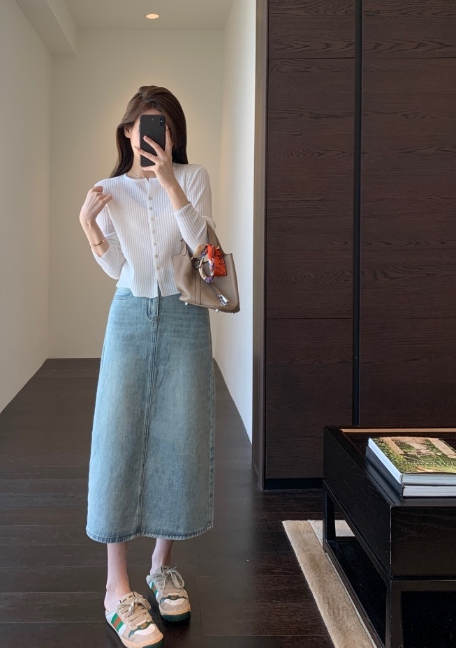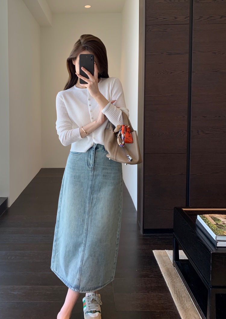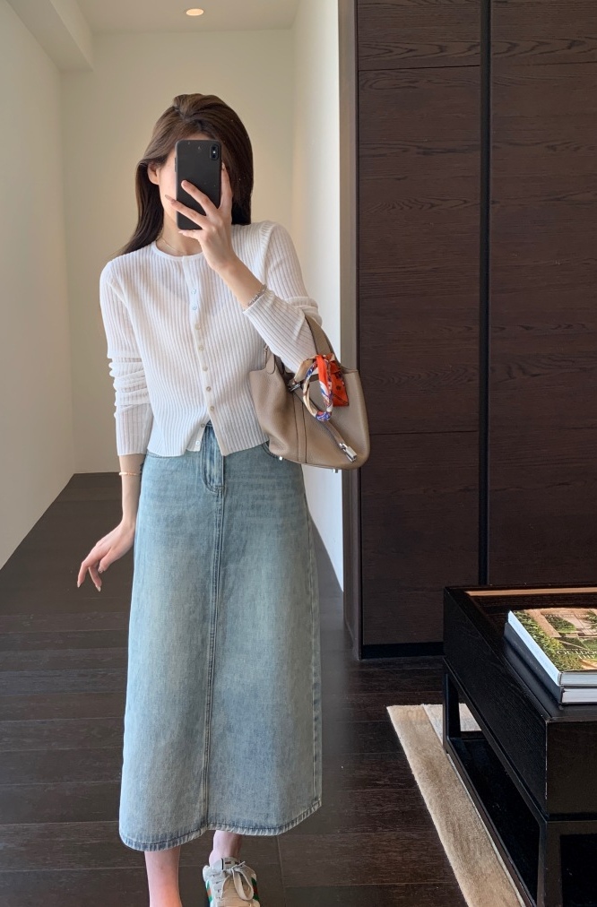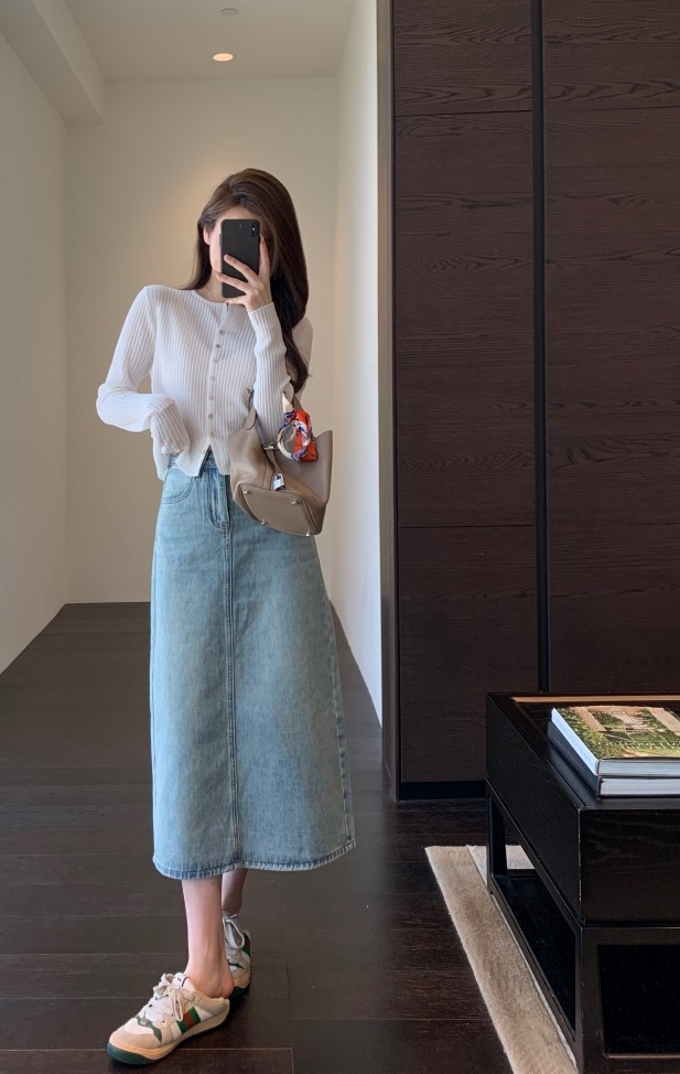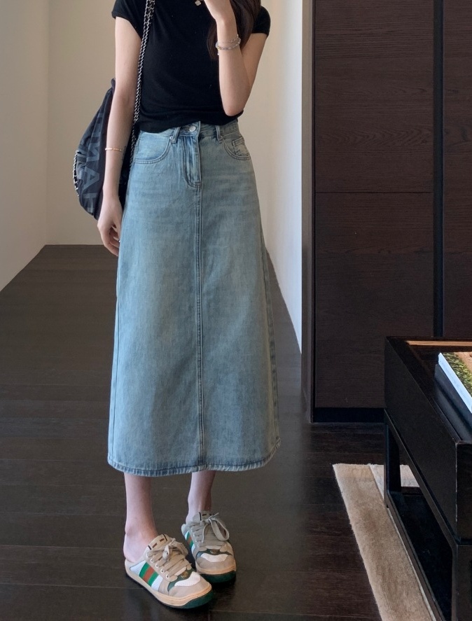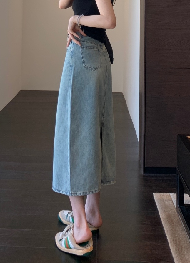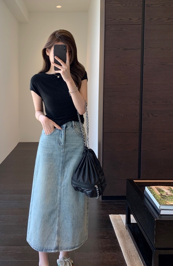 非常有女人味的牛仔半裙,好穿衣橱里号称“万金油的时髦单品”高腰A字版型,贴合腰身,拉长腿部线条,直接划分三七身材~束腰+提臀+修胯,打造女神级身材,腰臀线条很服帖,就像是量身定做的一样。