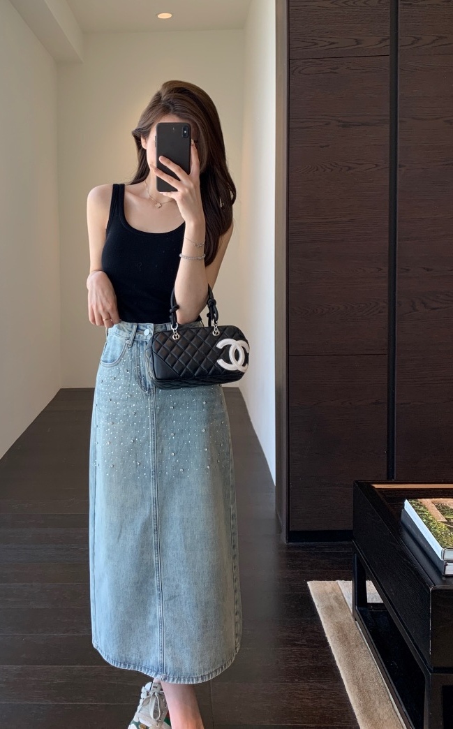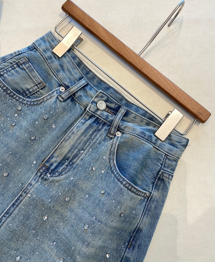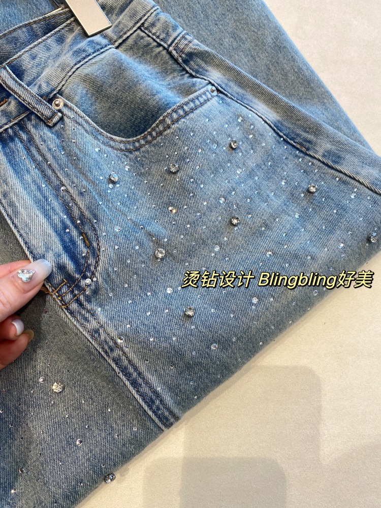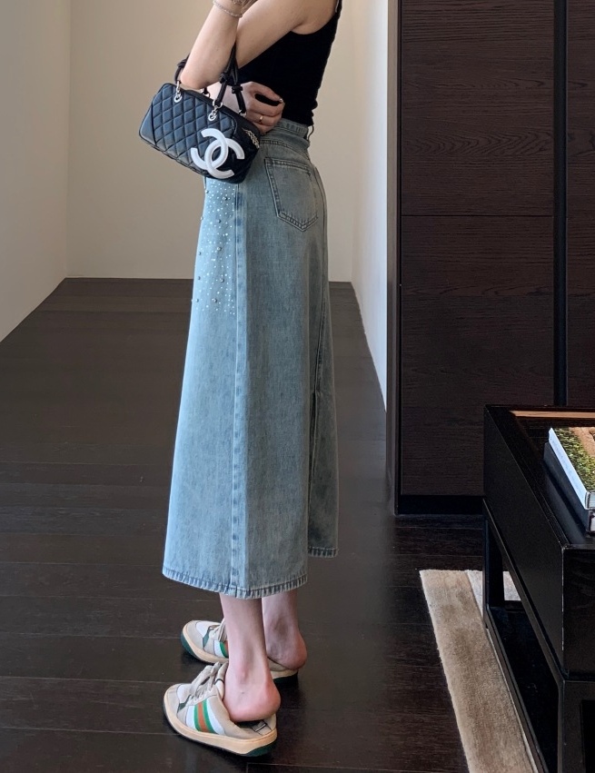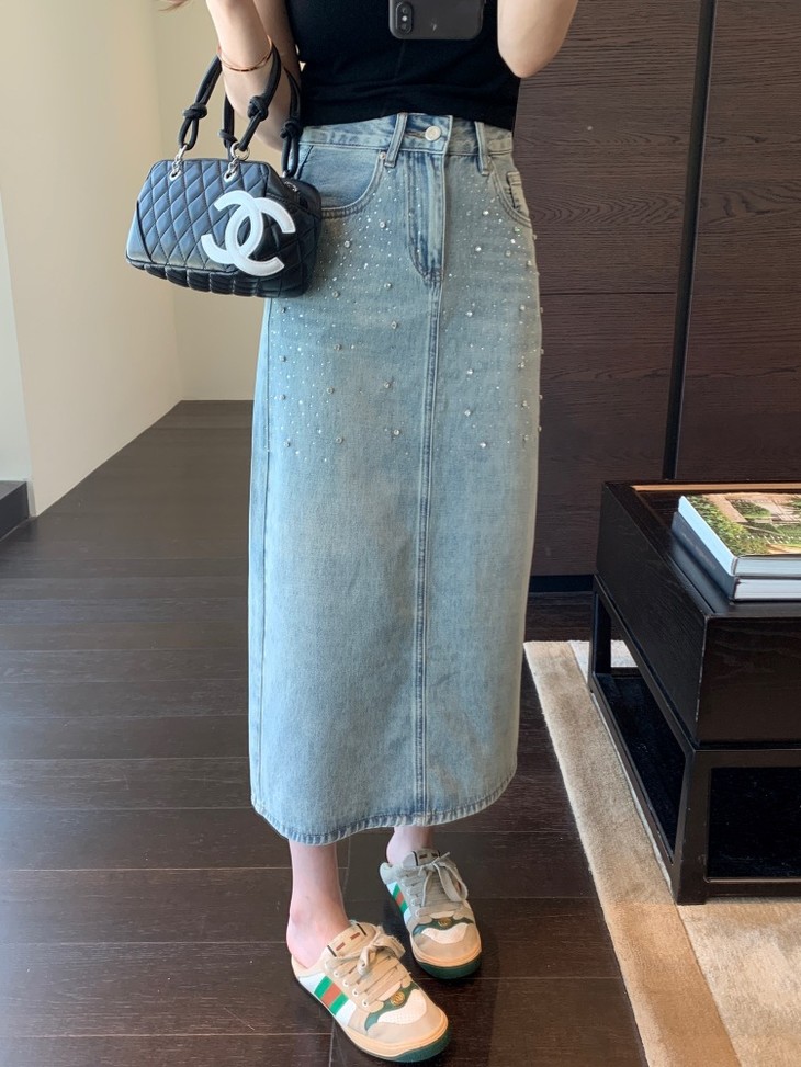 高温烫钻璀璨迷人,令原本略显平淡的牛仔裙,也有了“灵魂”时髦有层次!很亮眼吸睛的一款!后开衩,御姐女王Chic,女神范开衩的中长半裙,甜辣飒美!