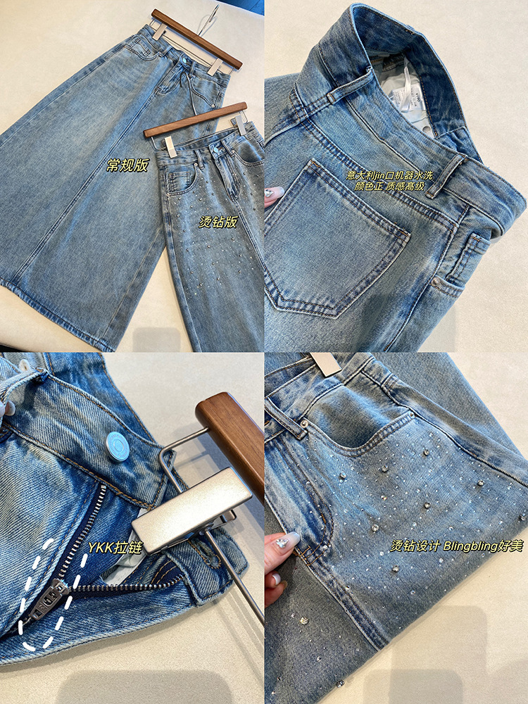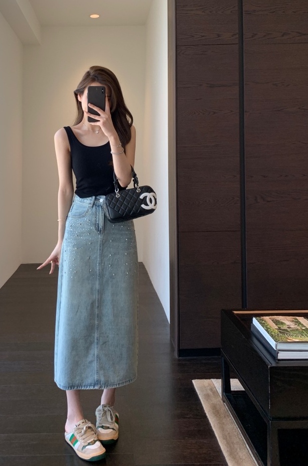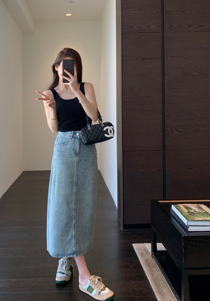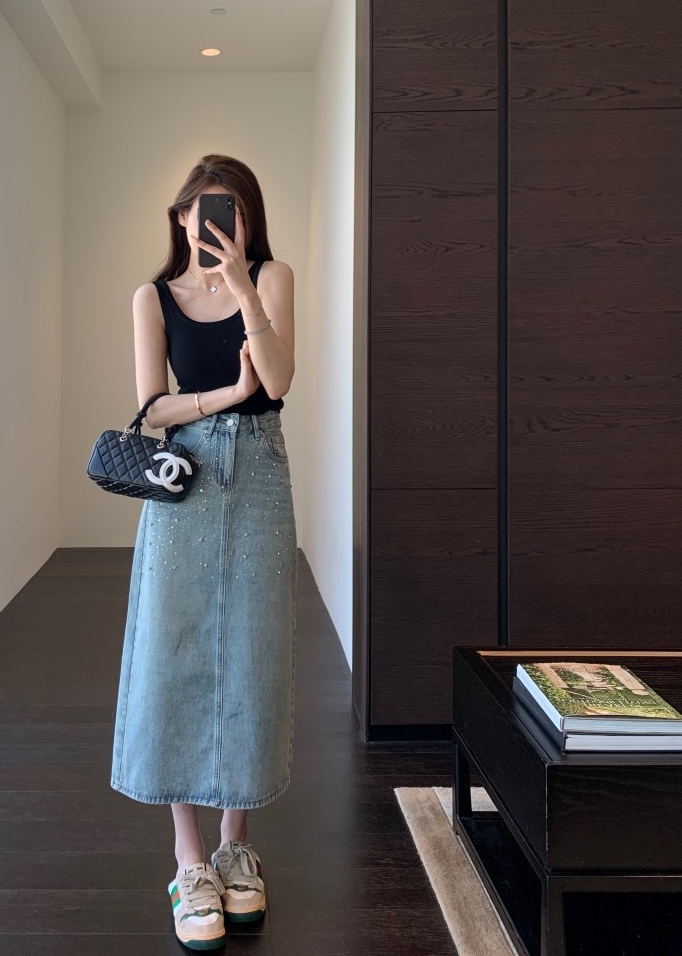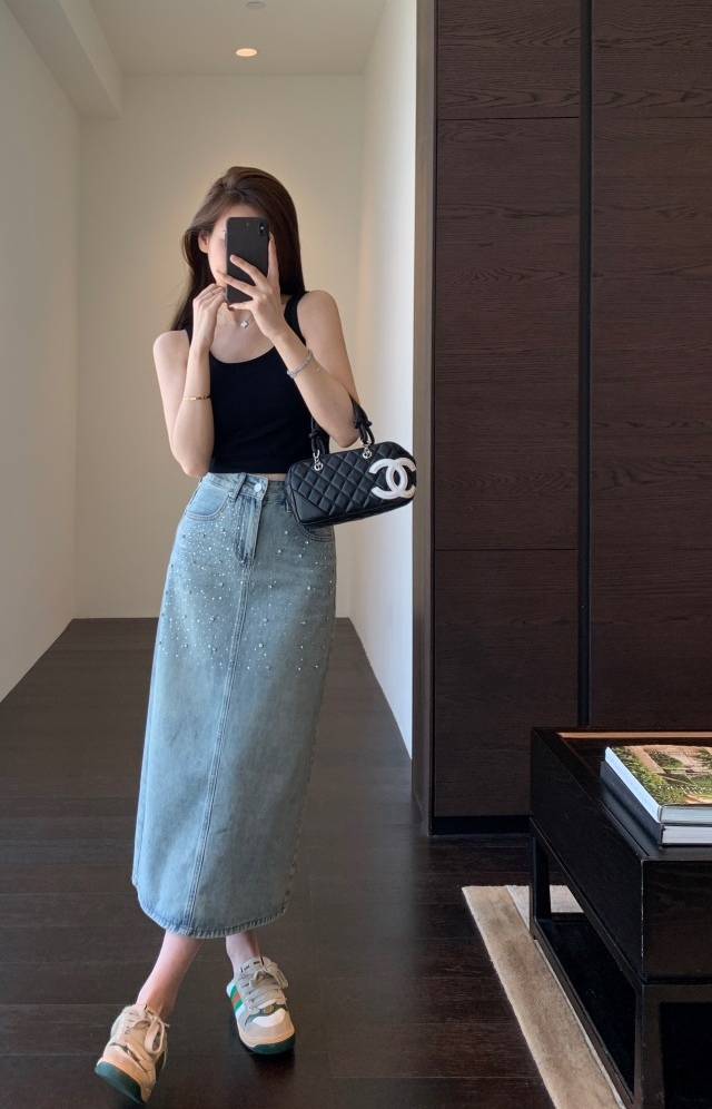 高温烫钻璀璨迷人,令原本略显平淡的牛仔裙,也有了“灵魂”时髦有层次!很亮眼吸睛的一款!后开衩,御姐女王Chic,女神范开衩的中长半裙,甜辣飒美!