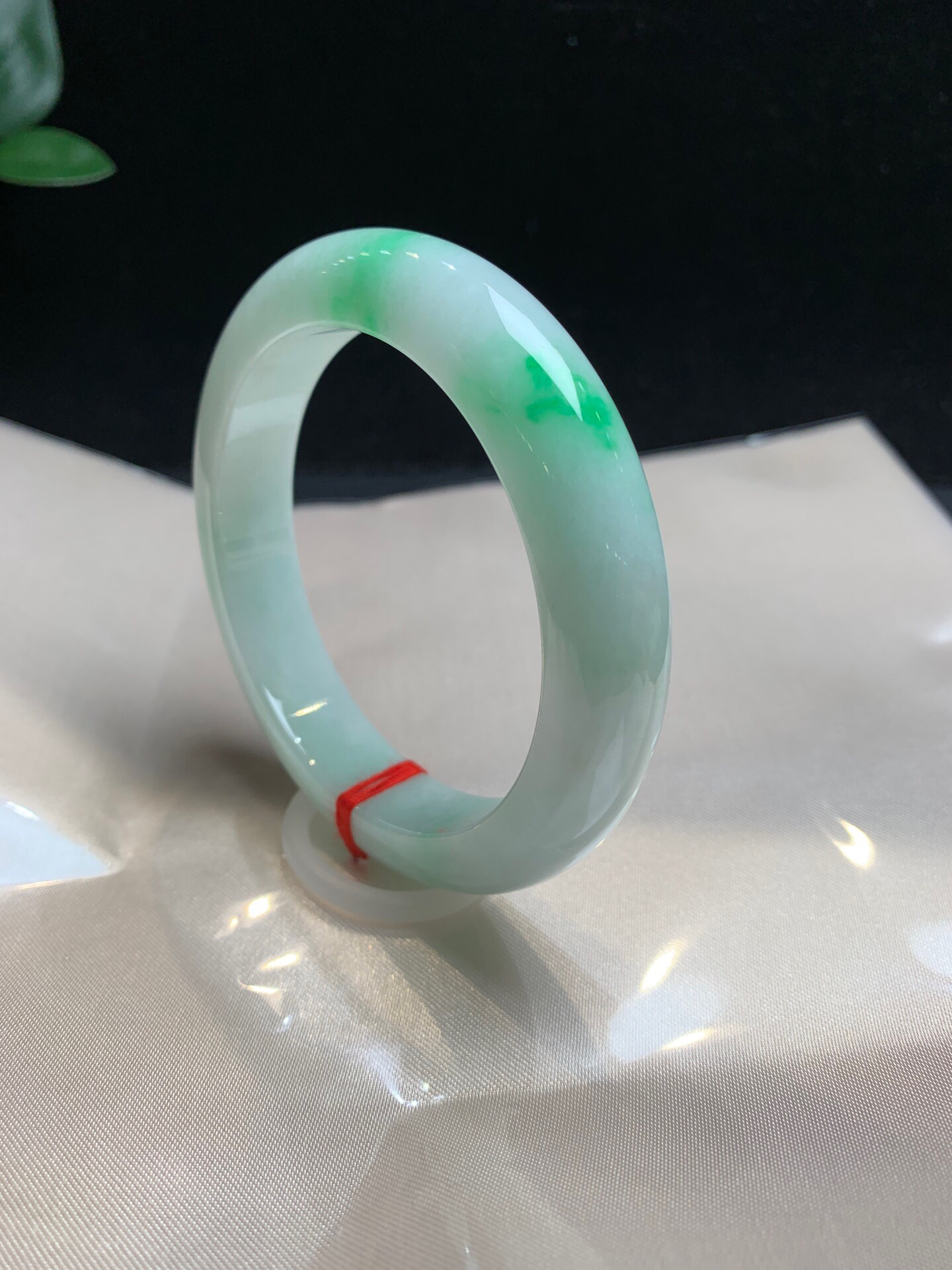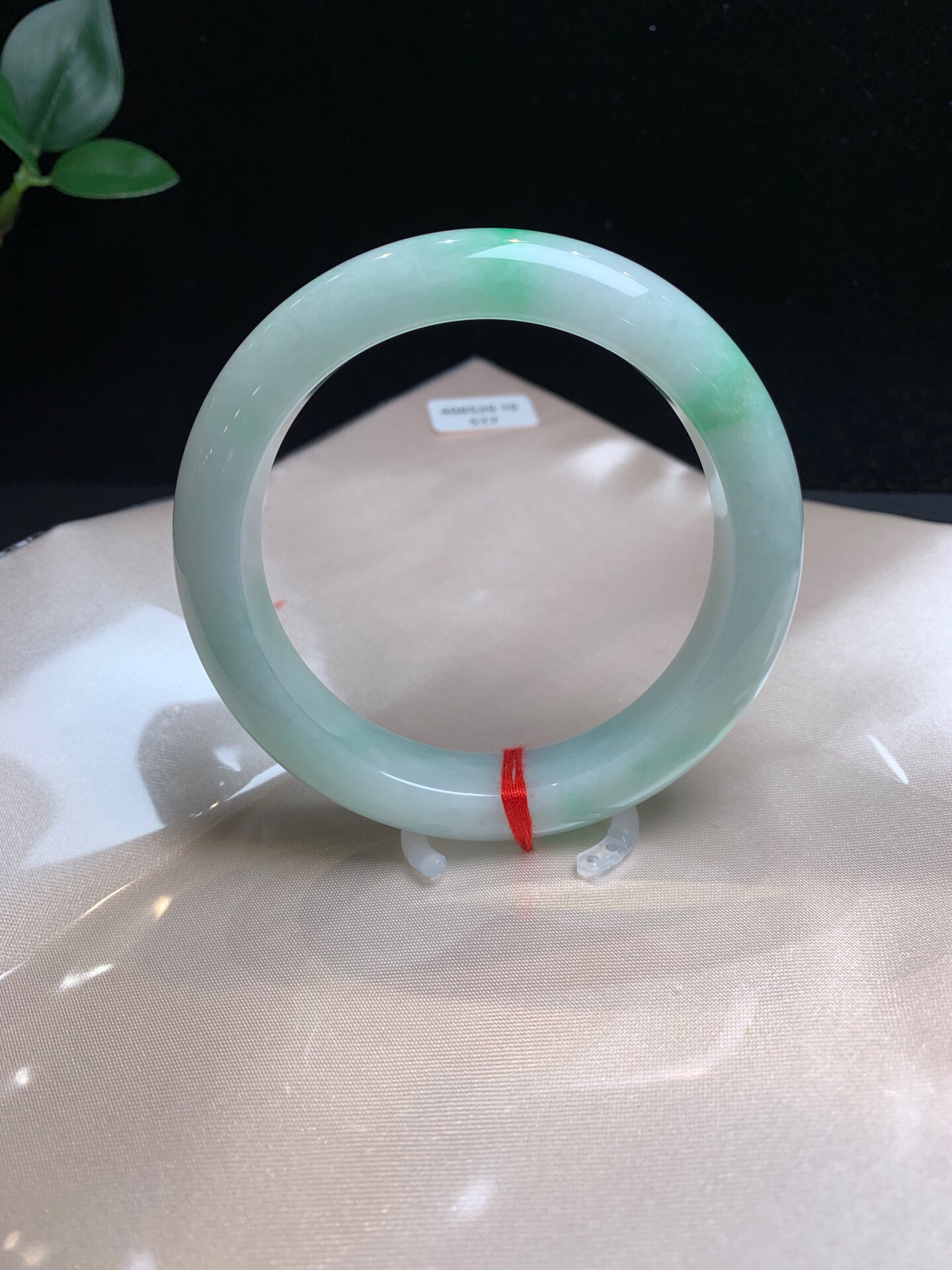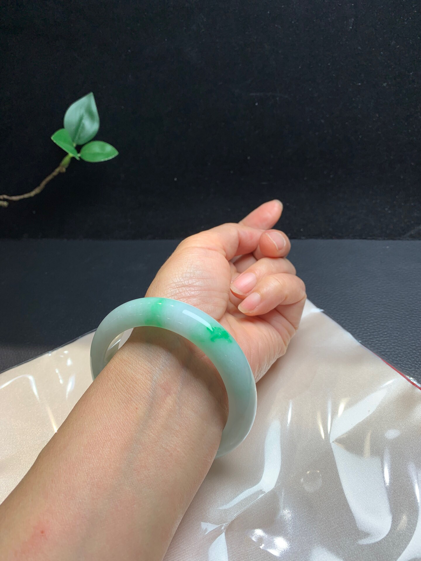 611566,57.7飘绿正圈手镯,12.7-9mm,底子干净均匀,飘几抹阳绿色,完美的,佩戴效果漂亮。💰15000 #优石客珠宝