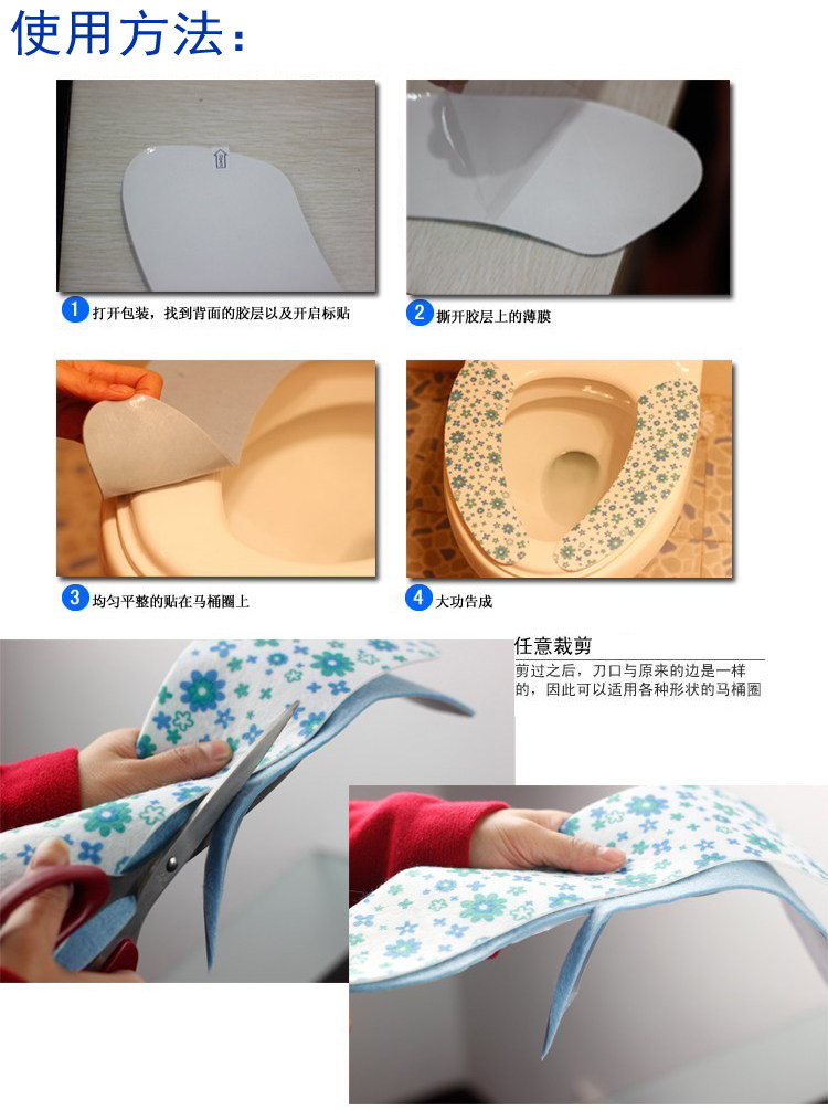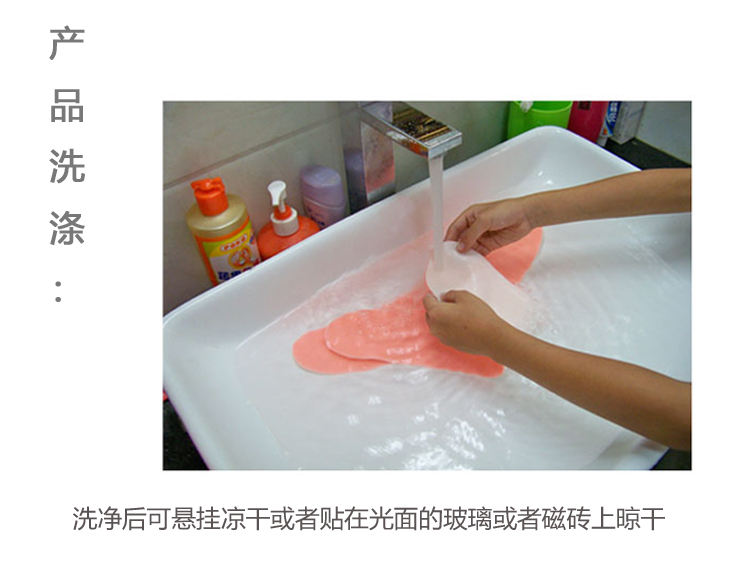 产品是保鲜膜吸附原理的,类似手机贴膜、汽车粘贴验车标志的静电膜,手用触碰基本无粘性,在光滑的表面可以稳定的吸附,不会像以前那种胶水马桶贴搞脏马桶。使用方便稳定,清洗取下很容易,