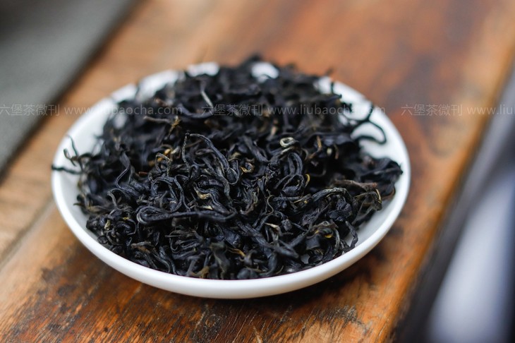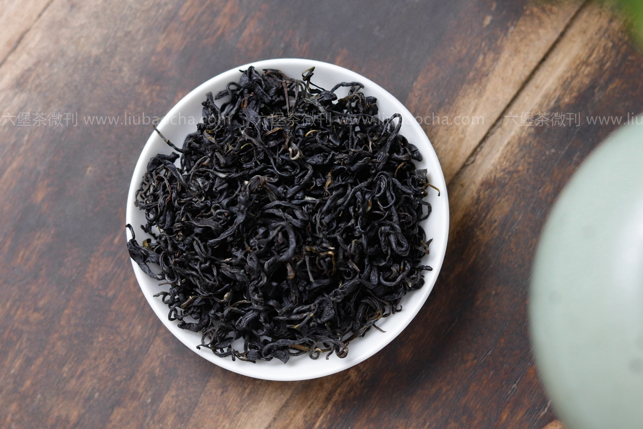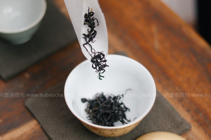 干茶色泽青黑、褐黑,油亮,条索紧细,呈鱼钩状。