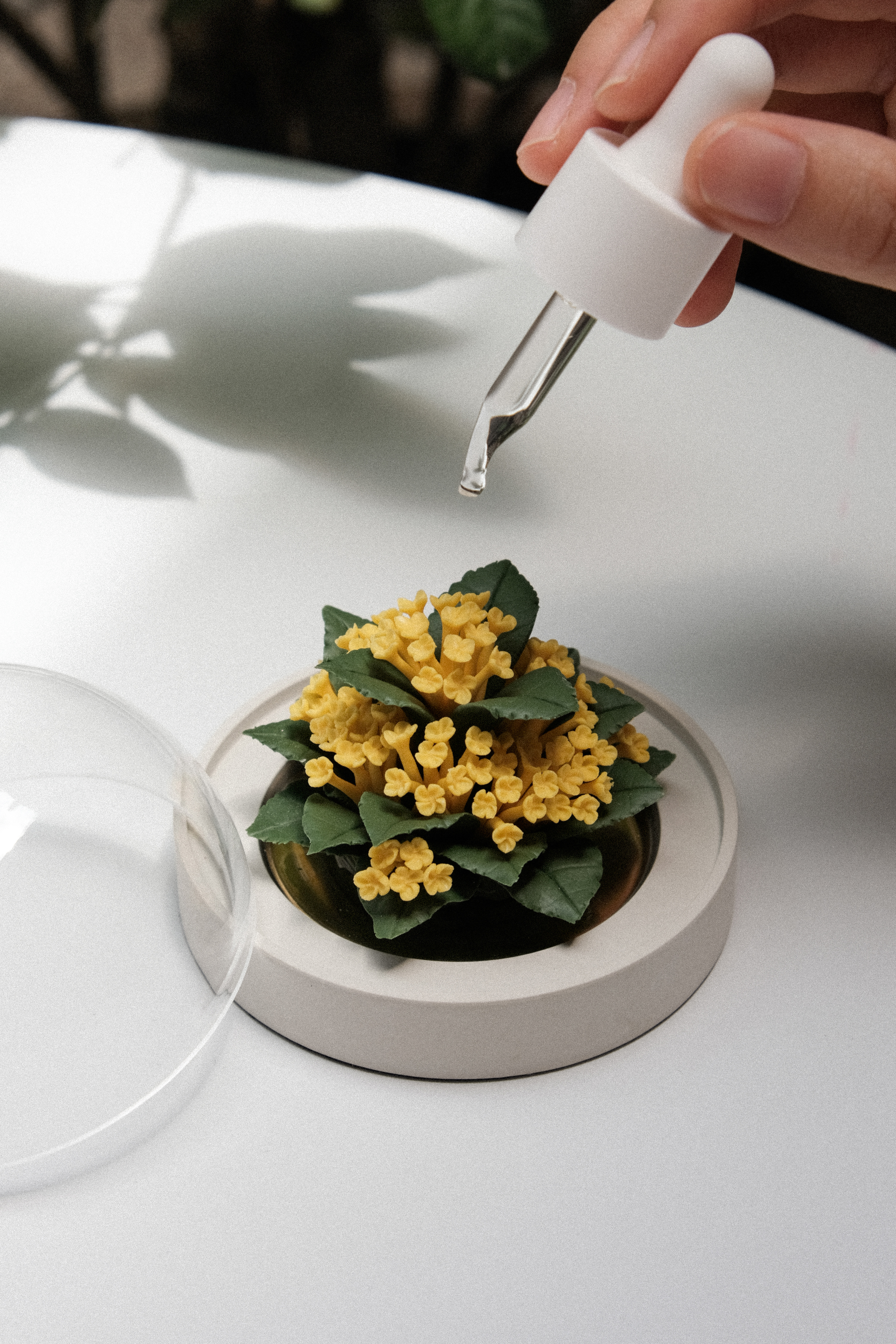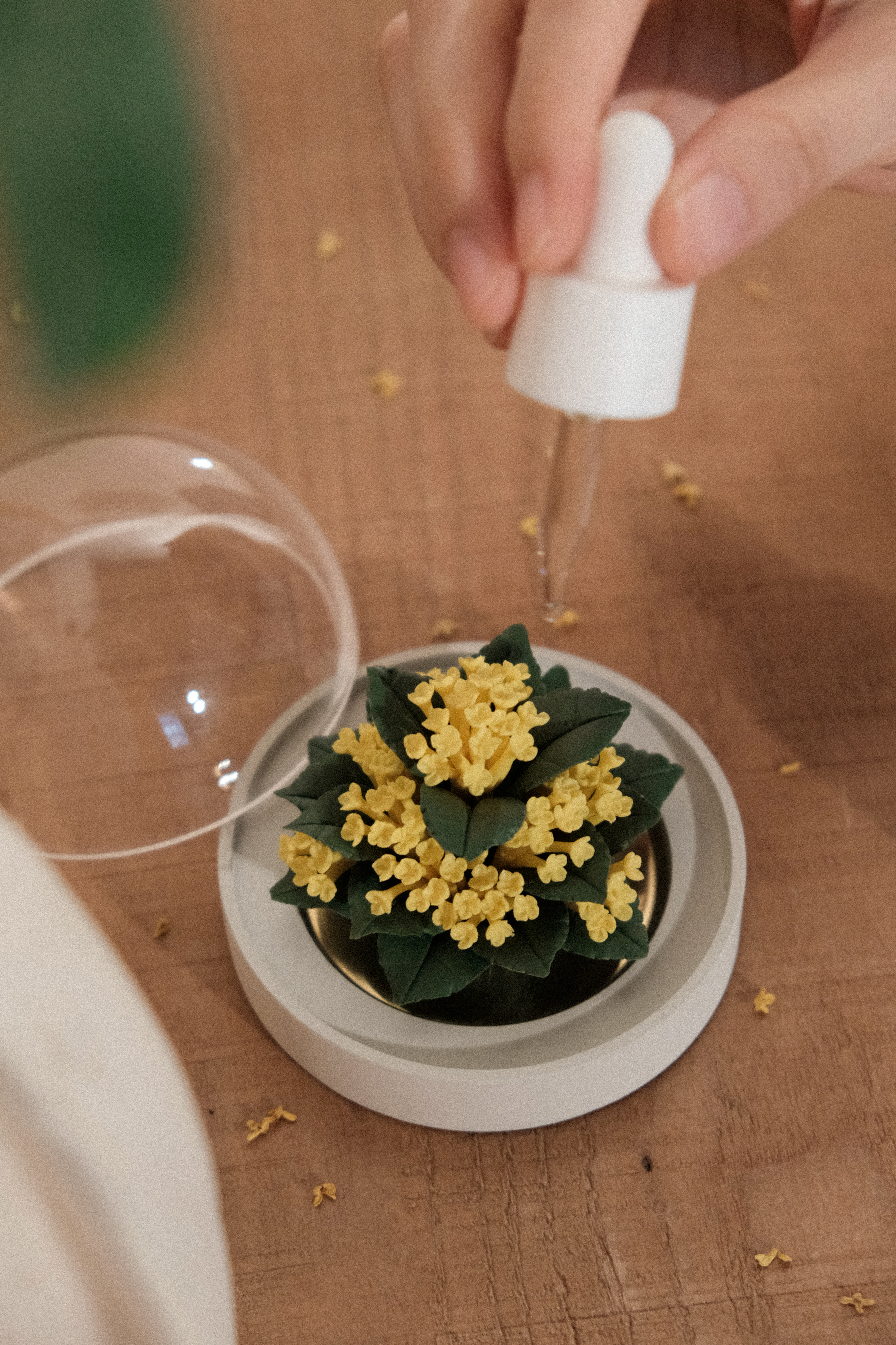 垂直向上取下防尘罩,往瓷花表面滴入4-5滴精油,盖上防尘罩静置12 小时后便可正常使用;