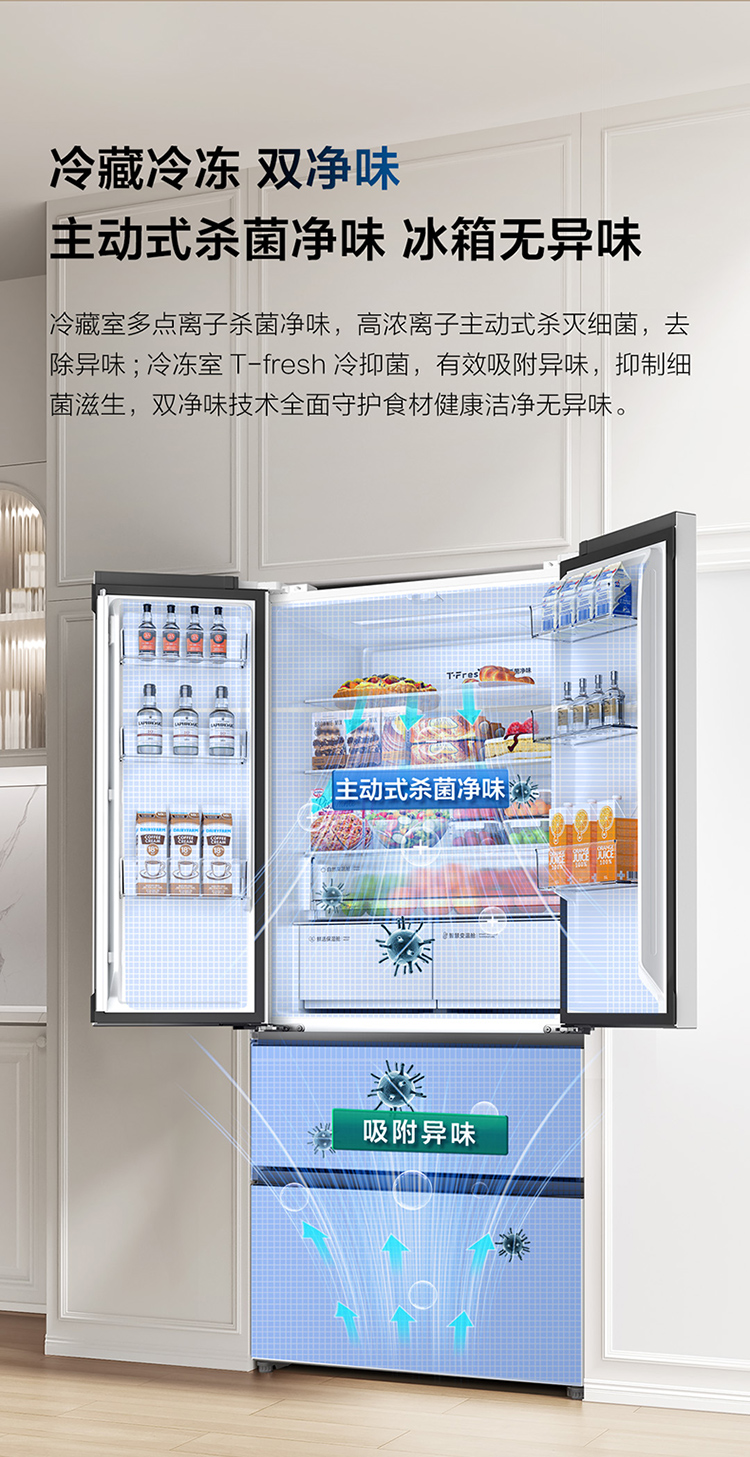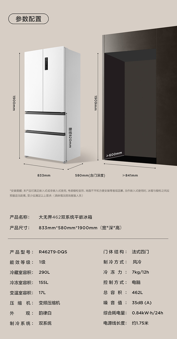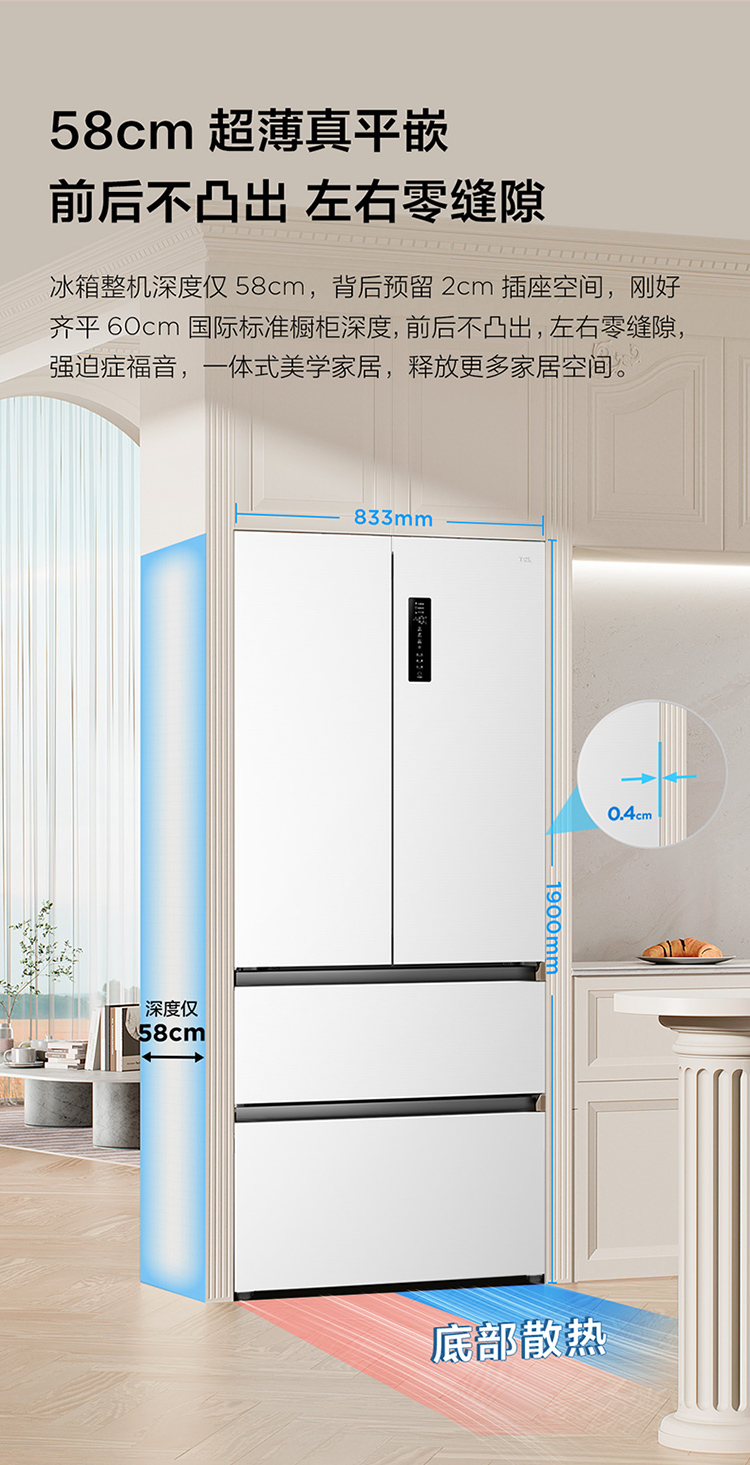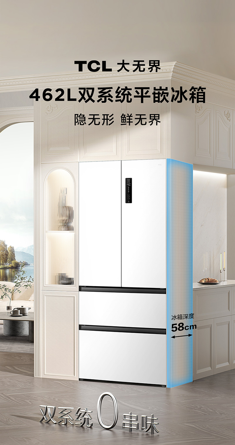 TCL大无界462升T9 Pro法式多门四开门58cm超薄零嵌入式双系统双循环R462T9-DQS