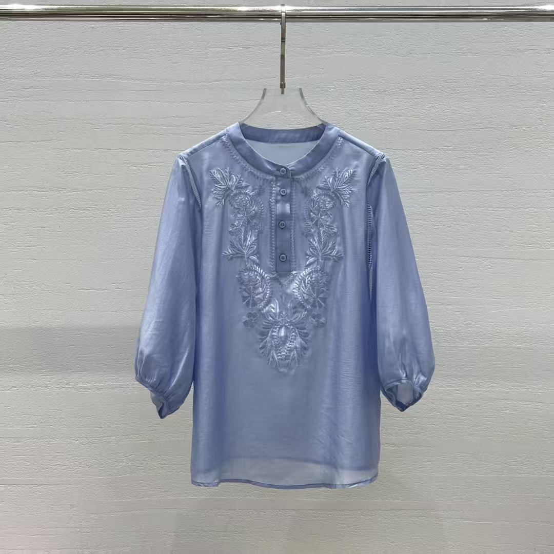 SZ2F50_窃蓝色_衬衫_春夏_立领重工刺绣半开襟灯笼袖七分袖_高级女装_BERNIEELEN 伯妮斯茵