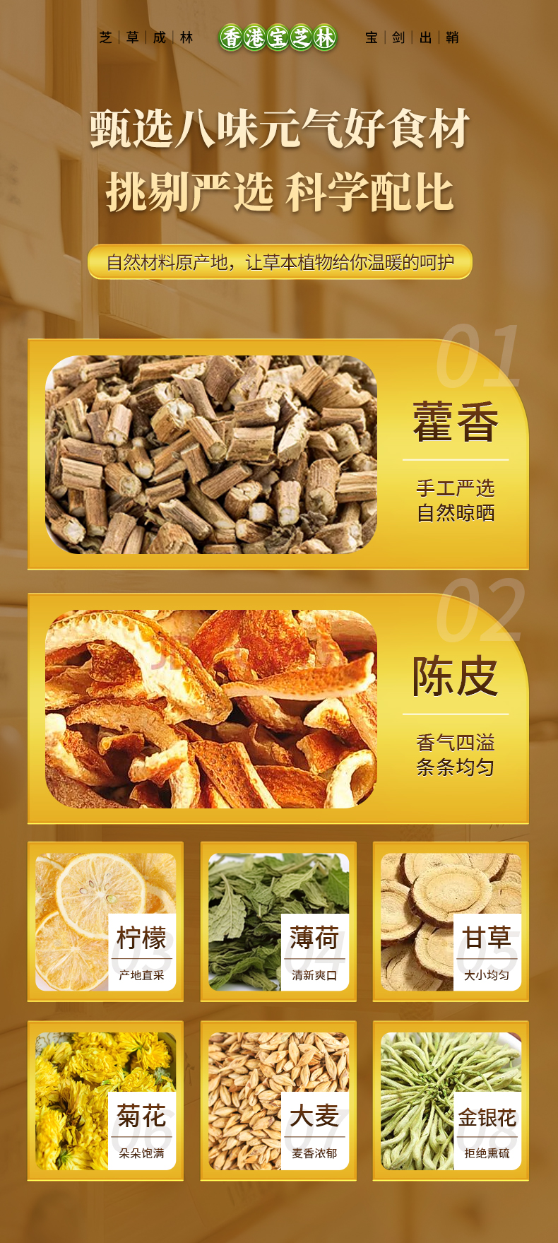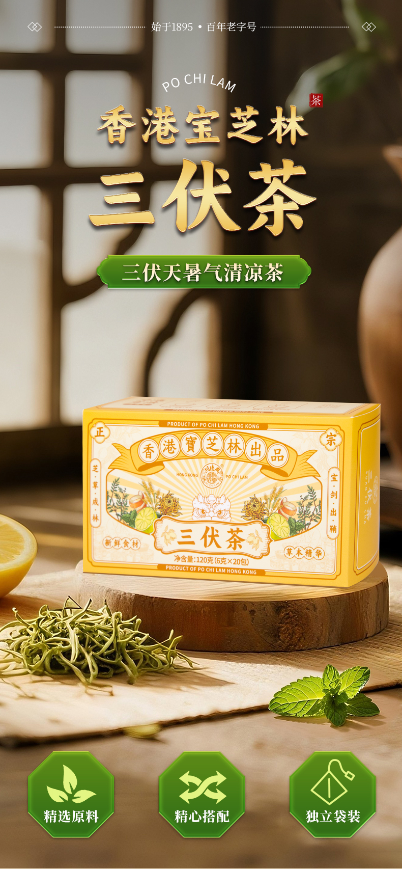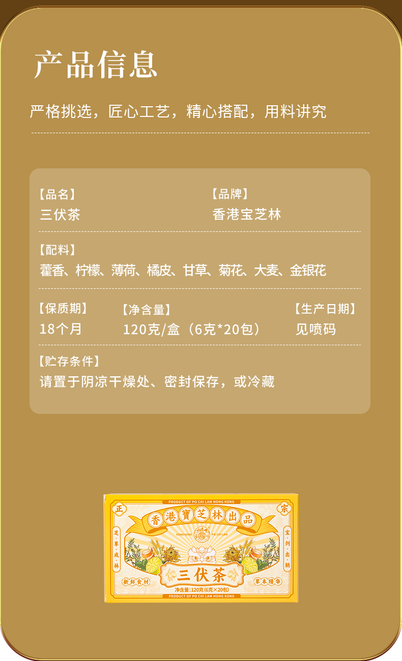 【品名】香港宝芝林三伏茶 120g/盒(6g*20包) 【规格】120g/盒 【保质期】18个月 【配料】霍香、柠檬、薄荷、橘皮、甘草、菊花大麦、金银花 【储存方法】干燥、低温、密封、防异味