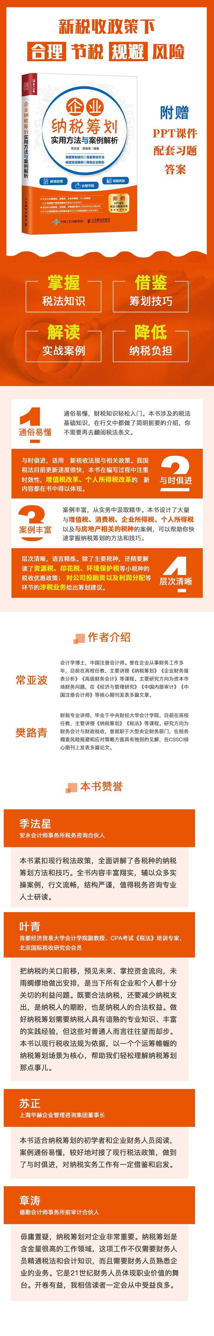 常亚波 会计学博士,中国注册会计师。曾在企业从事财务工作多年,目前在高校任教,主要讲授《纳税筹划》《企业财务报表分析》《*级财务会计》等课程。主要研究方向为资本市场财务问题,在《经济与管理研究》《中国内部审计》《中国注册会计师》等核心期刊发表多篇文章。 樊路青 财税专业讲师,毕业于中央财经大学会计学院,现任教于北京工商大学嘉华学院会计系,主要讲授《纳税筹划》《税法》等课程。研究方向为财务会计与财政税收,曾就职于大型央企财务部门,在税务稽查风险规避和应对策略方面具有独到的见解,在CSSCI核心期刊上发表多篇论文。