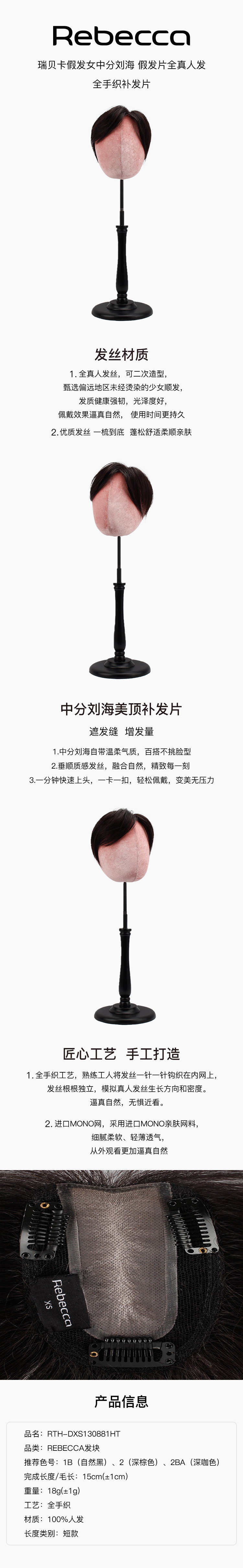 Rebecca瑞贝卡假发侧分刘海假发片全真人发全手织补发片中性风补发片