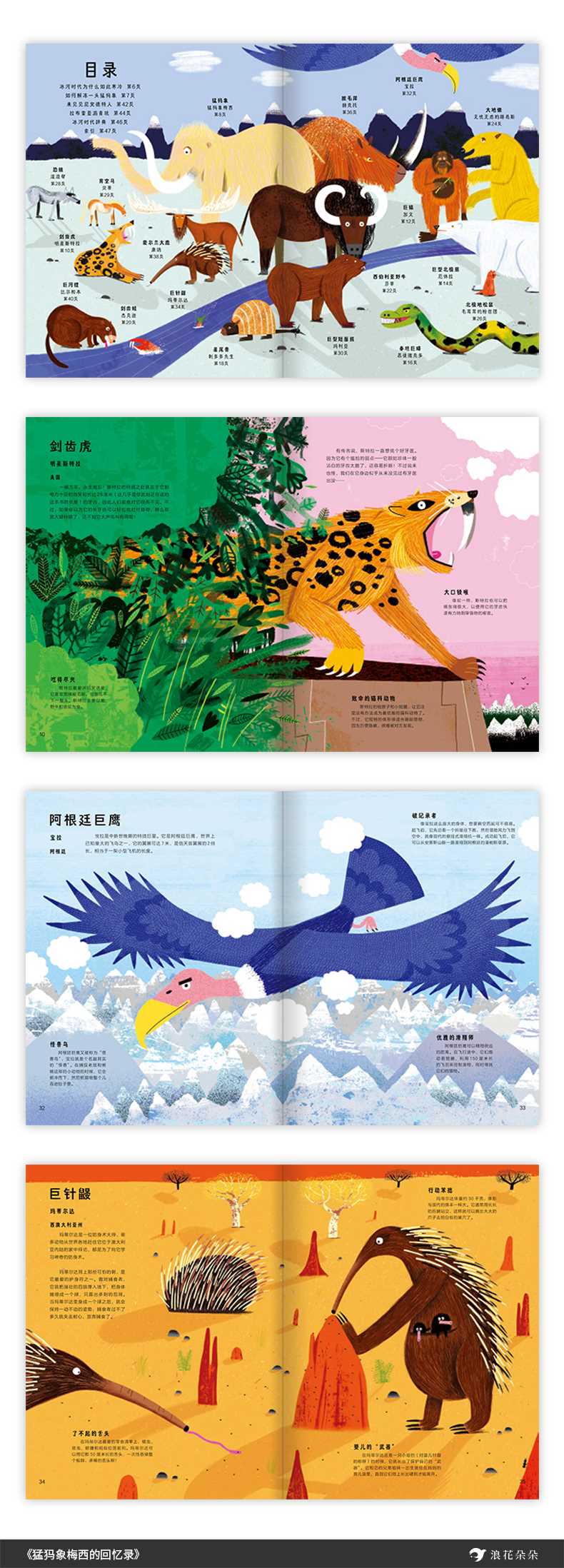每幅插图都包含诸多细节和故事性,准确地描绘出动物的外貌特点和环境,剑齿虎的长牙齿、星尾兽身上的骨头甲片、巨针鼹肚子里的小婴儿,都在图中高度还原出来,让孩子可以直观地认识和观察已经灭绝的动物们,锻炼观察力与想象力!