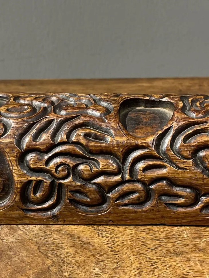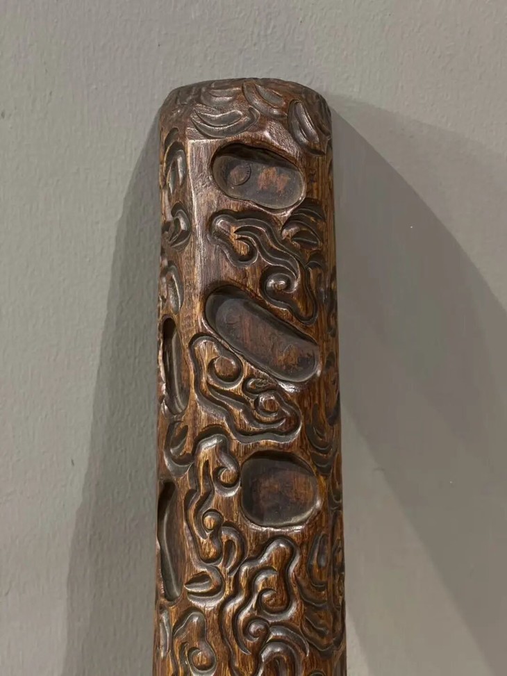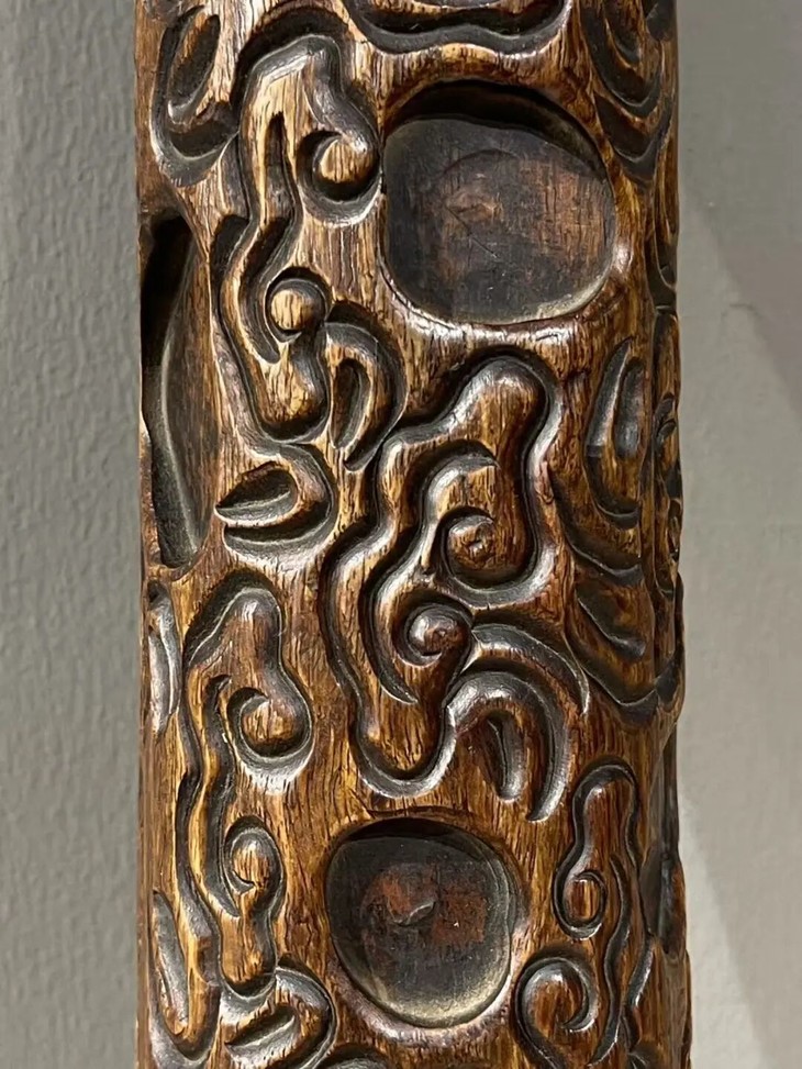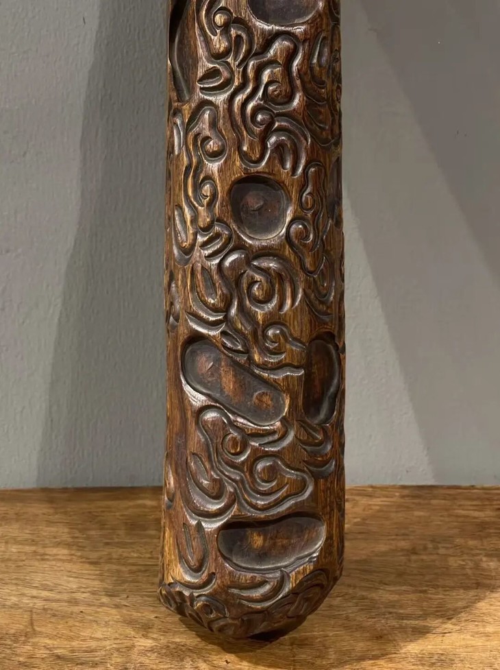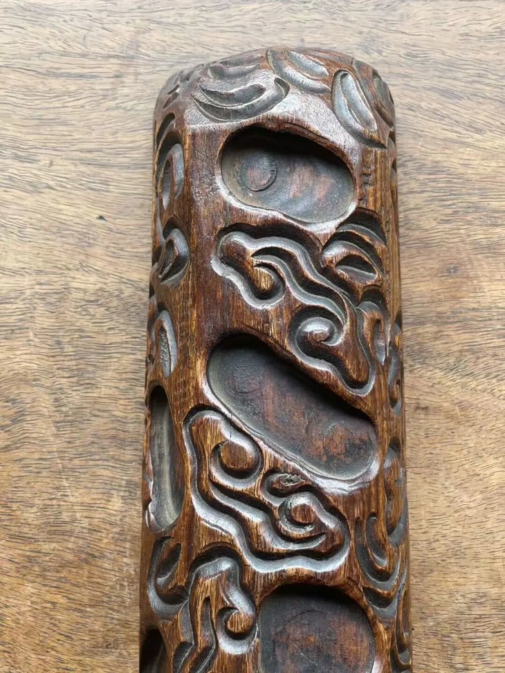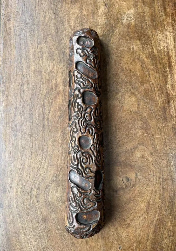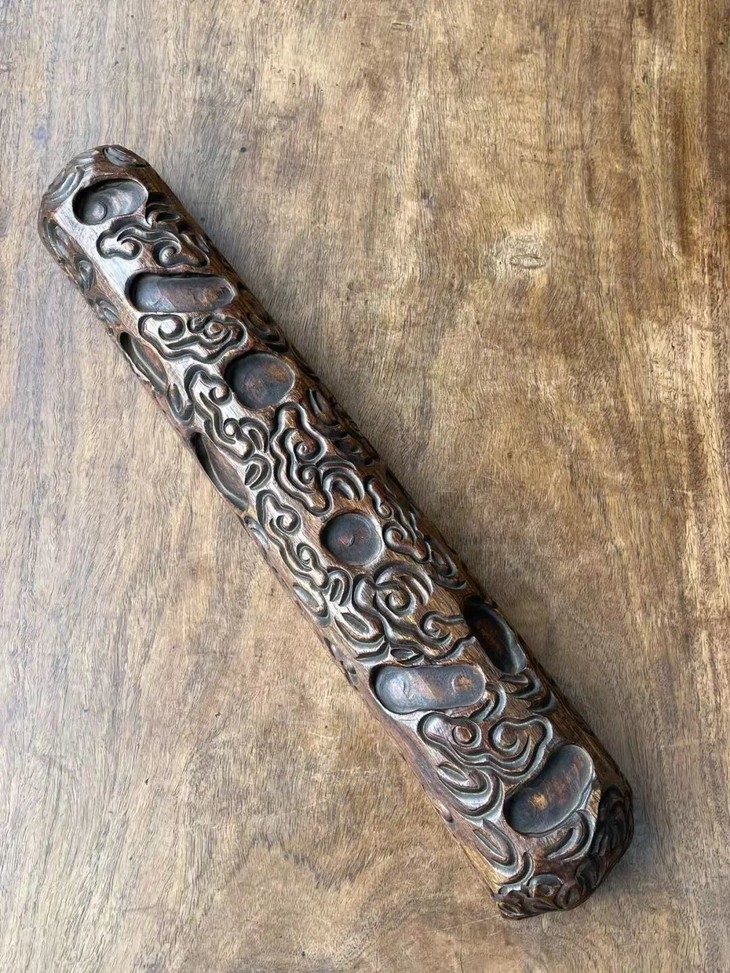 此花梨木满工雕云纹卷轴镇尺,尺寸大、雕琢纹饰精美,除表面稍具磨损痕,小磕碰与局部细微龟裂痕外,保存完好。