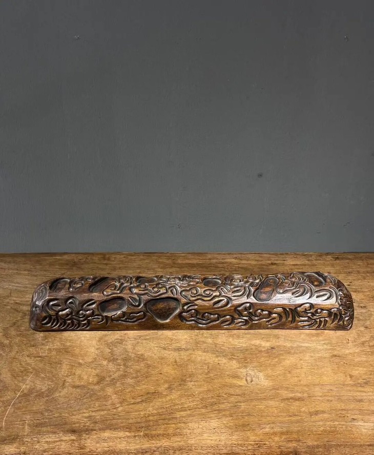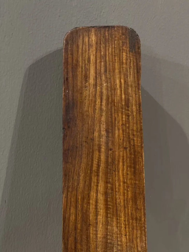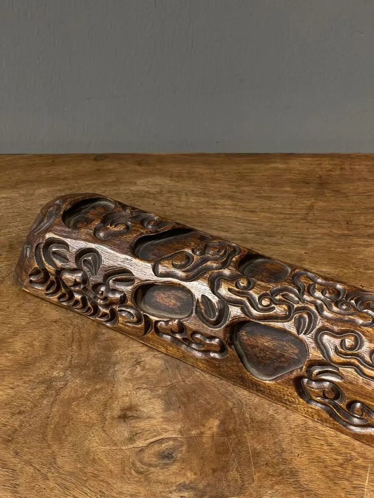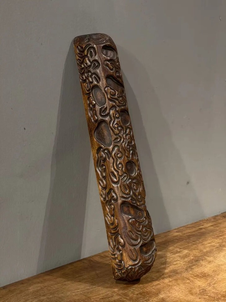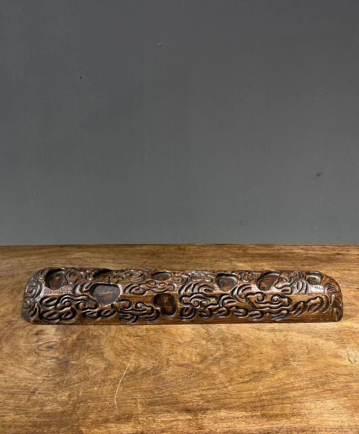 这是一件尺寸大的硬木镇纸,是以质地坚硬、比重大的花梨木,整块满工雕琢如意云成四方长条形大镇尺,长近五十厘米、重逾一千五百克的大镇纸,木质堅硬厚重,浅浮雕如意云纹生动华丽,包浆皮壳老旧渾厚温润,文人气特别浓厚,确实优雅,难以言喻。