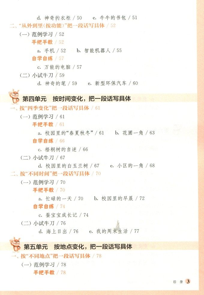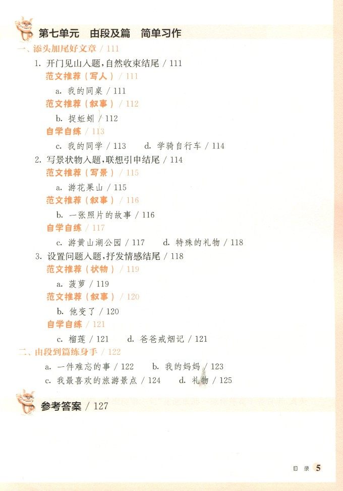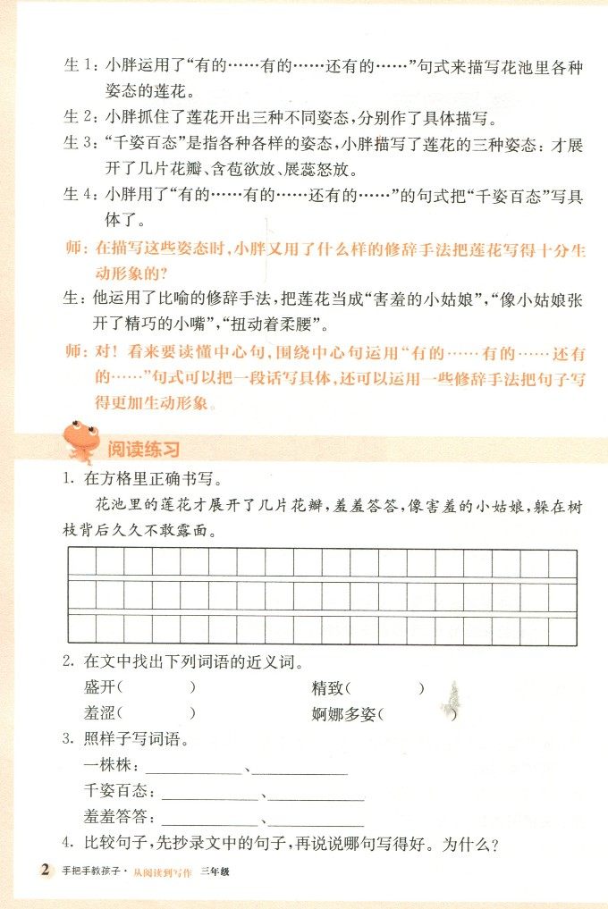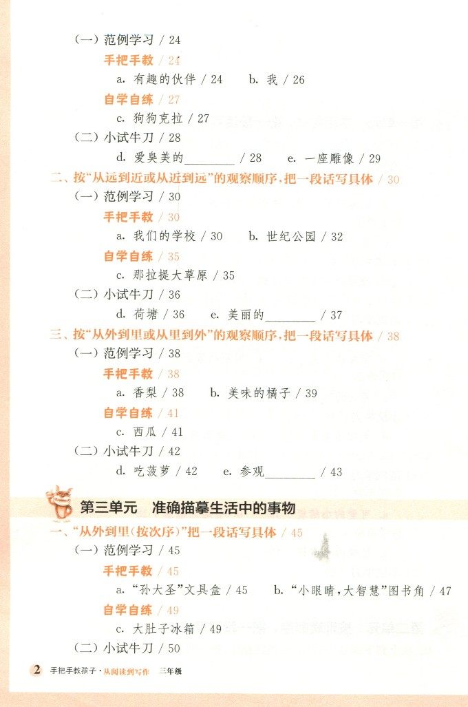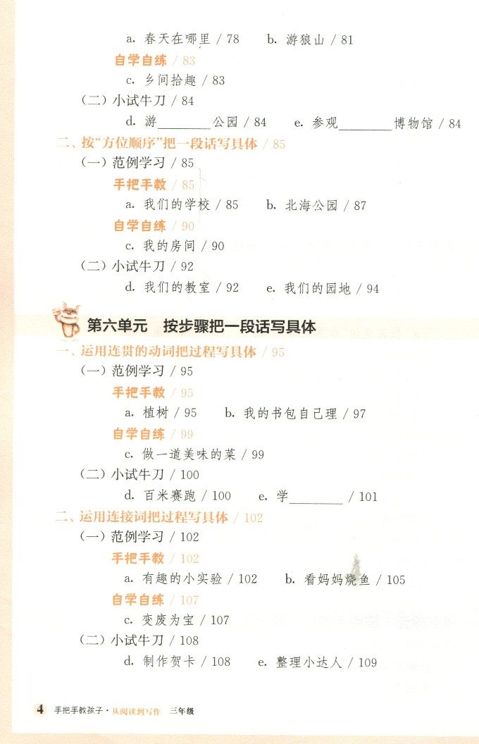 本书充分体现“手把手教孩子”的特点,书中展示教与学的过程,循序渐进的过程。 体现语文课程是语言文字运用性、实践性的特点,编写大量语言实践训练;真正把阅读与写作整合起来,破除传统的读写隔裂,以读促写,用阅读指导写作;范文导读——阅读练习——读写习作——作文点评——拓展练习,手把手帮孩子一起分析讨论范文,修改提高,练习巩固,扎扎实实提高阅读与写作能力。