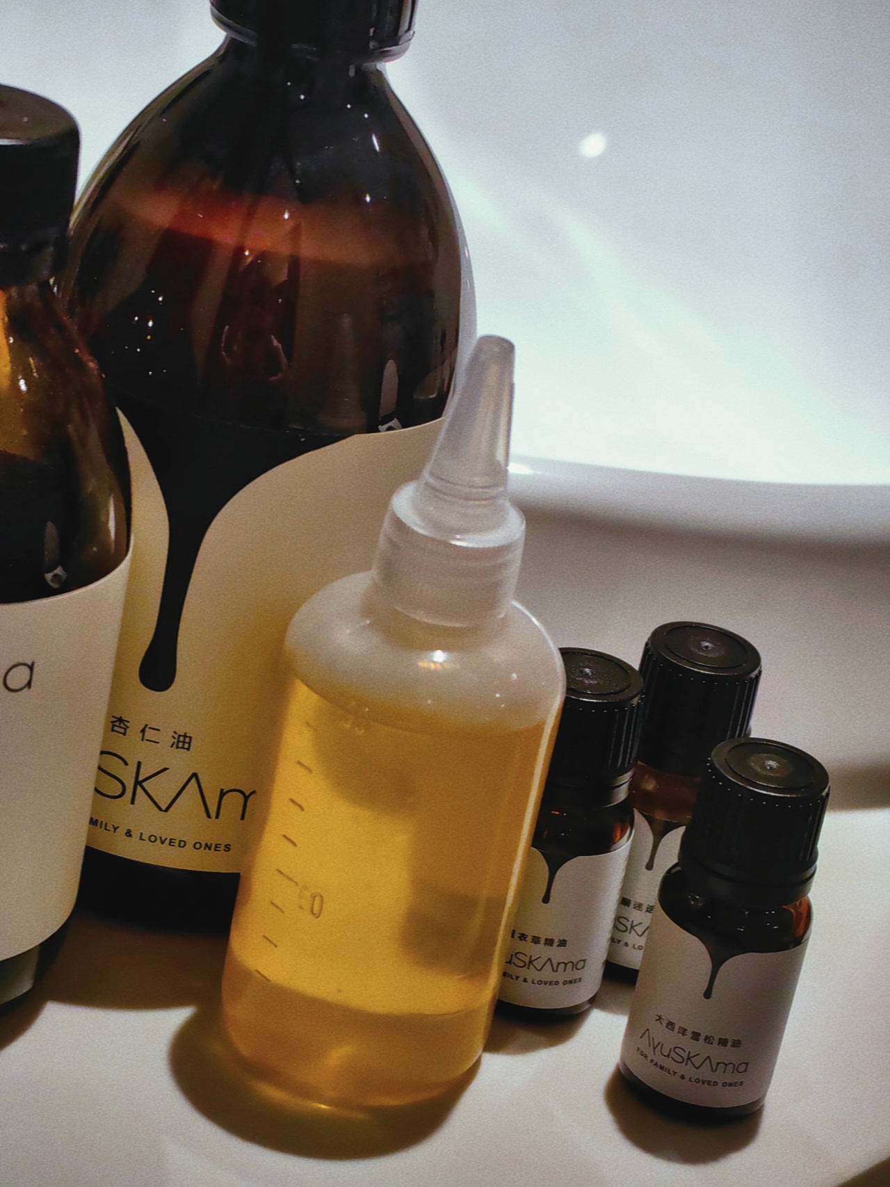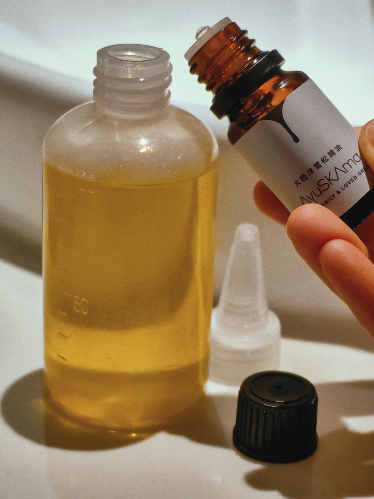 • 宛若新生配方(3%):大西洋雪松3滴+马鞭草酮迷迭香2滴+广藿香1滴+10ml玫瑰果油/覆盆子油等。适合作为油性与面疱肌肤的脸部精华油;若在面临重大改变、觉得胸闷腹痛时,不妨将此配方涂抹在胸口与腹部,深呼吸3~5次,即可获得改善。