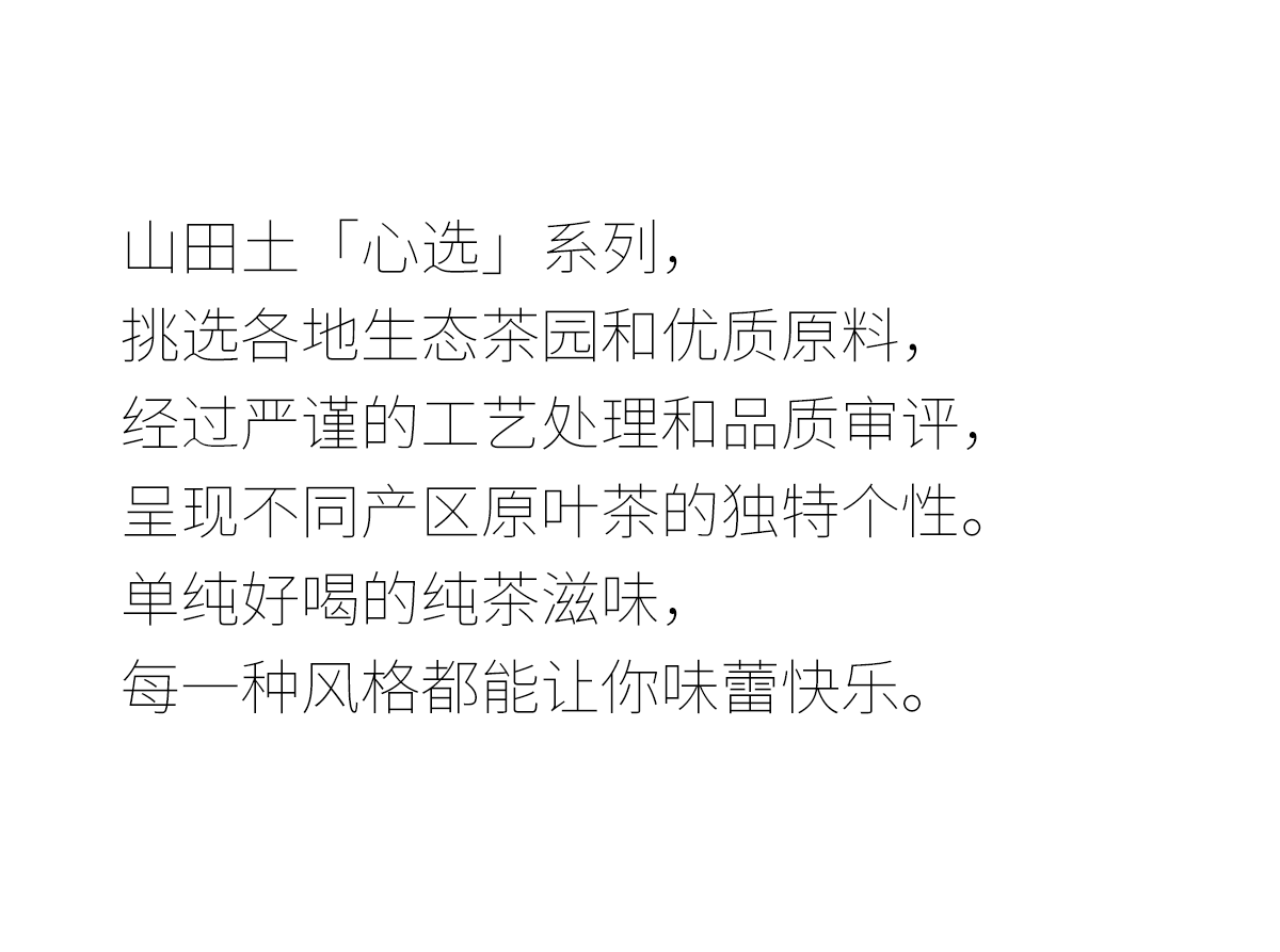 山田土是一个茶品牌。致力于走访茶区,寻找地方茶。亲眼看,亲口尝,将心比心挑选优质原料、把关工艺、审评质量,以有趣的方式呈现一杯干净好茶,让你饮用安心,感官愉悦。 产品包括:日常口粮茶,节庆茶礼,茶器