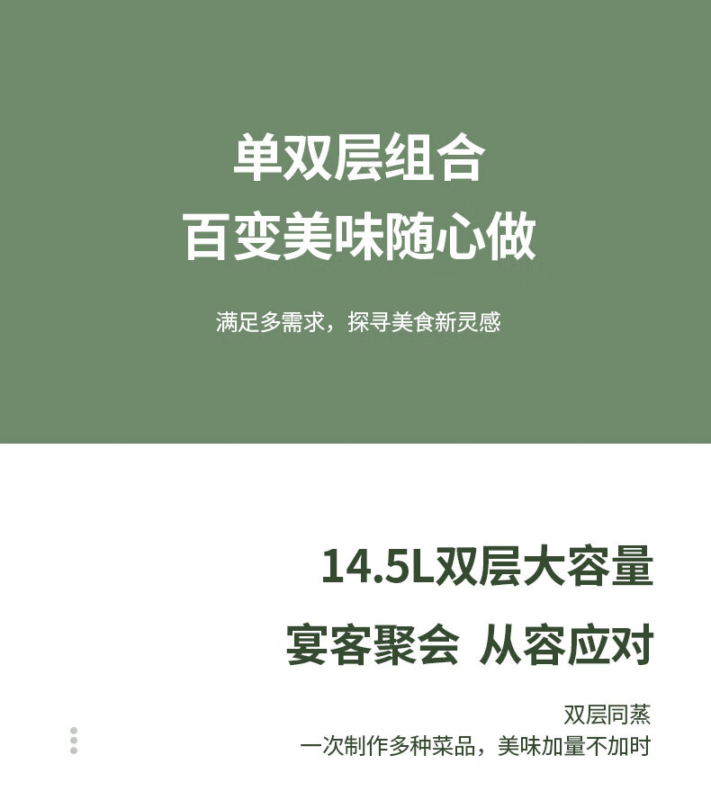 材质:304 不锈钢锅盖 + 蒸笼     容量:14.5L