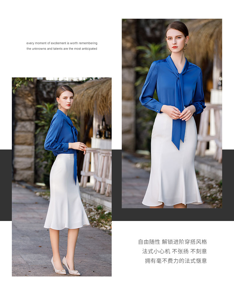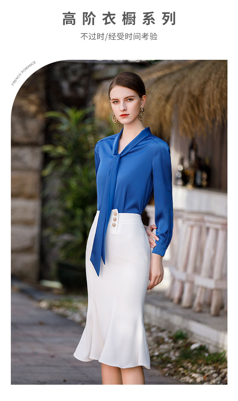 春季宝蓝色衬衫女高级感缎面长袖衬衣名媛气质两件套包臀鱼尾裙