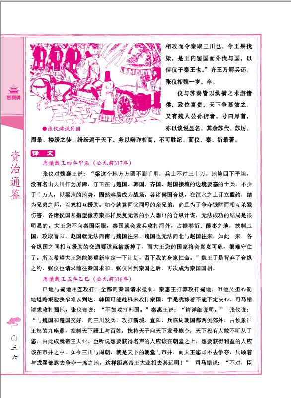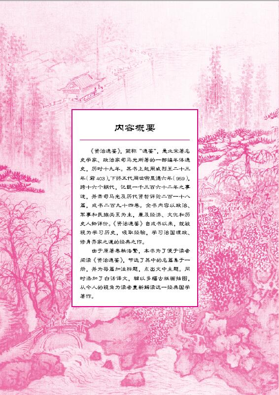 由于原著卷帙浩繁,本书为了便于读者阅读《资治通鉴》,节选了其中的名篇集于一册,并为每篇加注标题,点出文中主题。同时添加了白话译文,辅以多幅古版画插图,从今人的视角为读者重新解读这一经典国学著作。